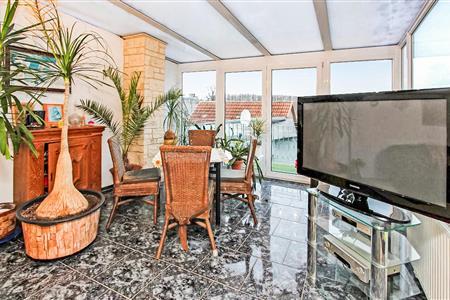Der Zugang zur Wohnung erfolgt durch einen gemeinsam genutzten Eingangsbereich über eine steile Geschosstreppe. Vorhanden ist ein Wohnraum mit angrenzendem Wintergarten (Polstermöbel, Flachbild-TV, Radio/CD, Esstisch), 2 Schlafräume (je Doppelbett, TV, 1 Gästebett für ein Kind zum Zustellen), eine Küche (Essecke, Küchenblock mit E-Kochfeld, Kühlschrank mit Tiefkühlteil, div. Küchengeräte) sowie einem Bad mit DU/WC. Zur Verfügung stehen ein möblierter Balkon und Unterstellmöglichkeit für mitgebrachte Fahrräder. Für Kleinkinder kann ein Hochstuhl bereitgestellt werden.