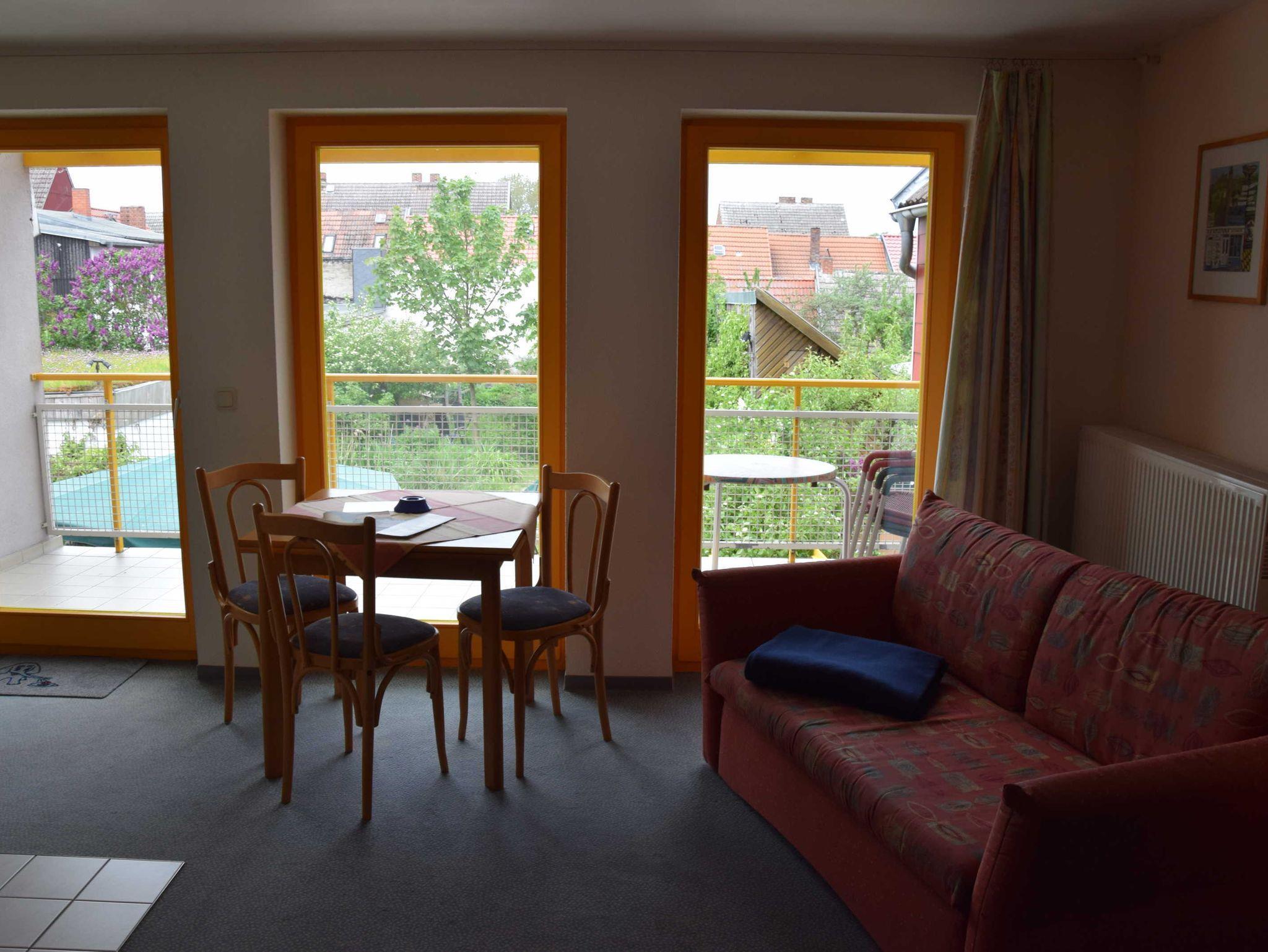 Gemütliches Doppelzimmer in der Ackerbürgerei Lassan mit Gartenblick und Balkon, ideal für entspannte Tage nahe dem Hafen.