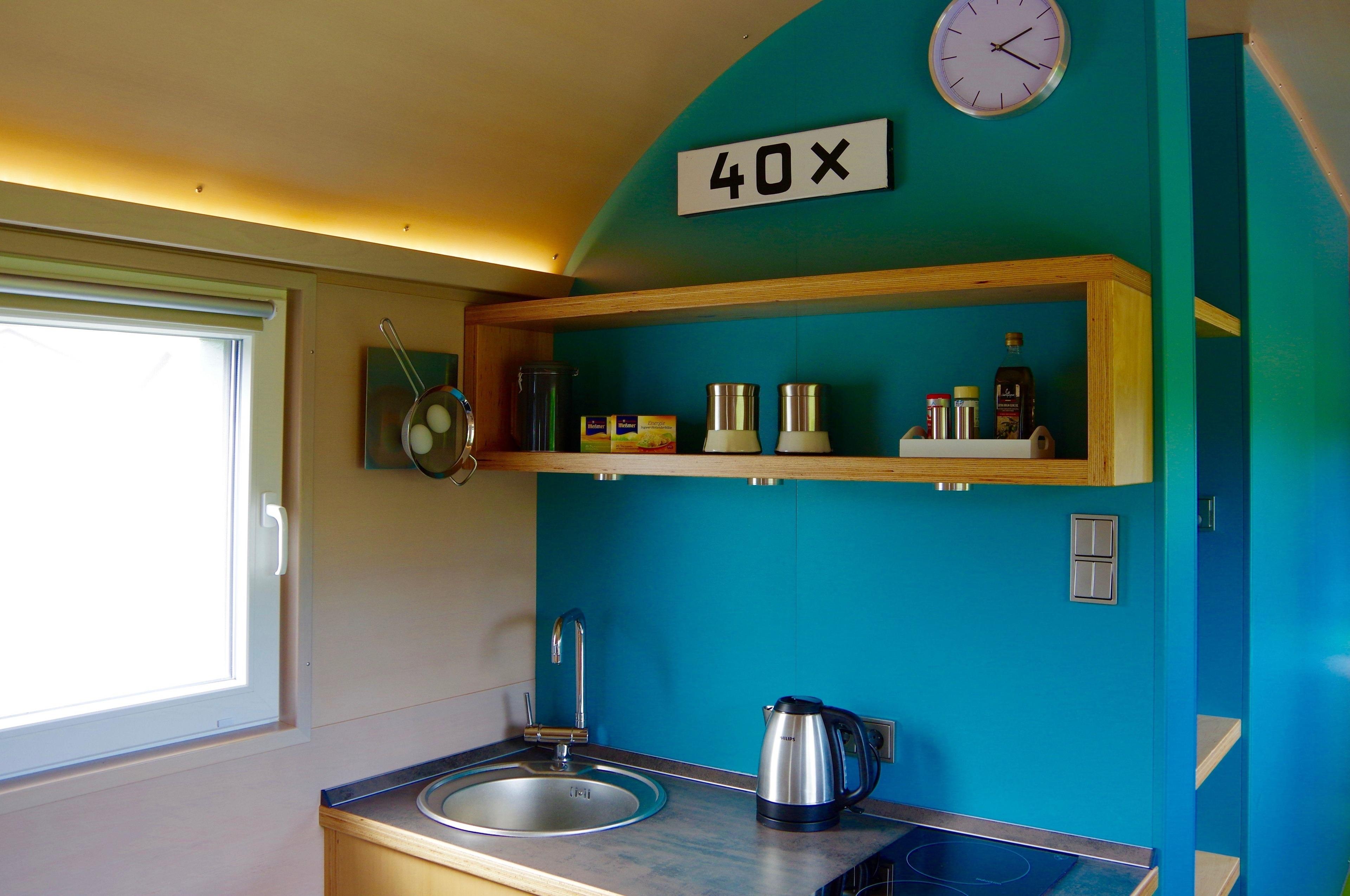 Die Ausstattung läßt auch hier keine Wünsche offen. Der Küchenbereich ist ausgestattet mit einem schmalen Geschirrspüler, Kühlschrank, Kaffeemaschine und einem Induktionskochfeld.