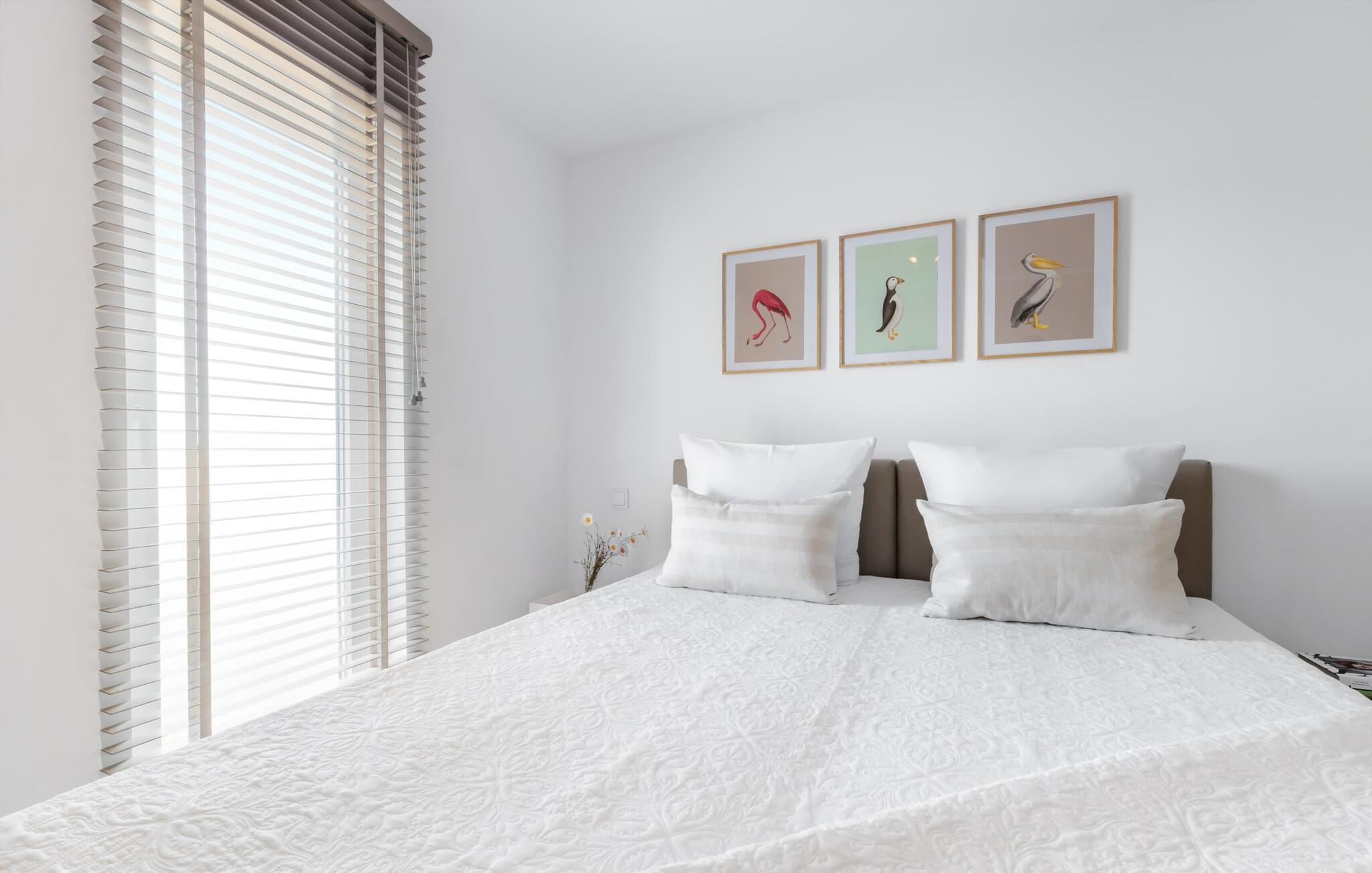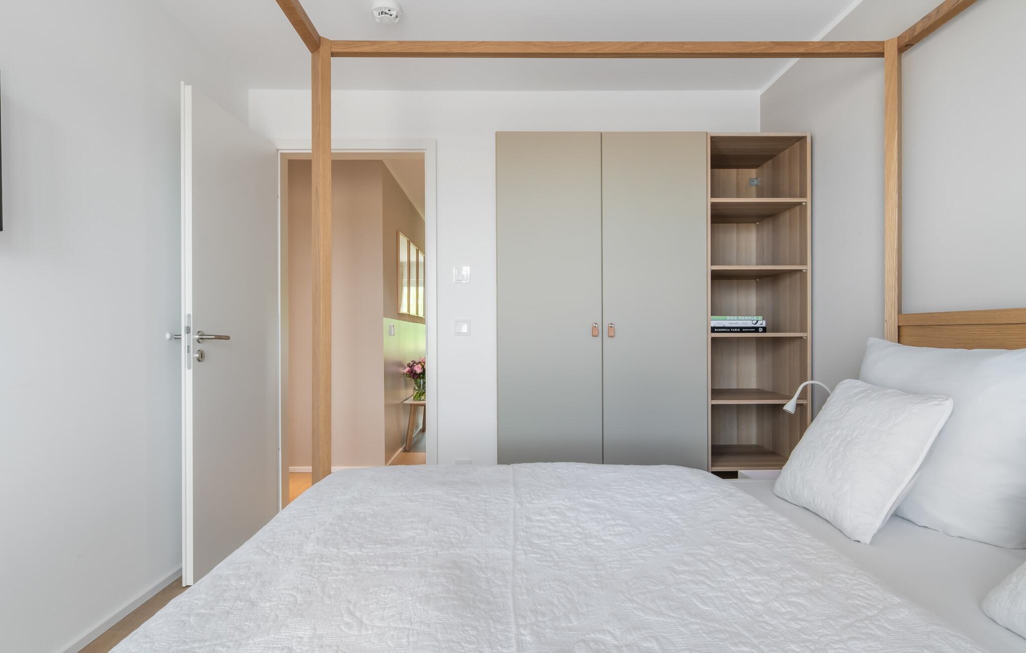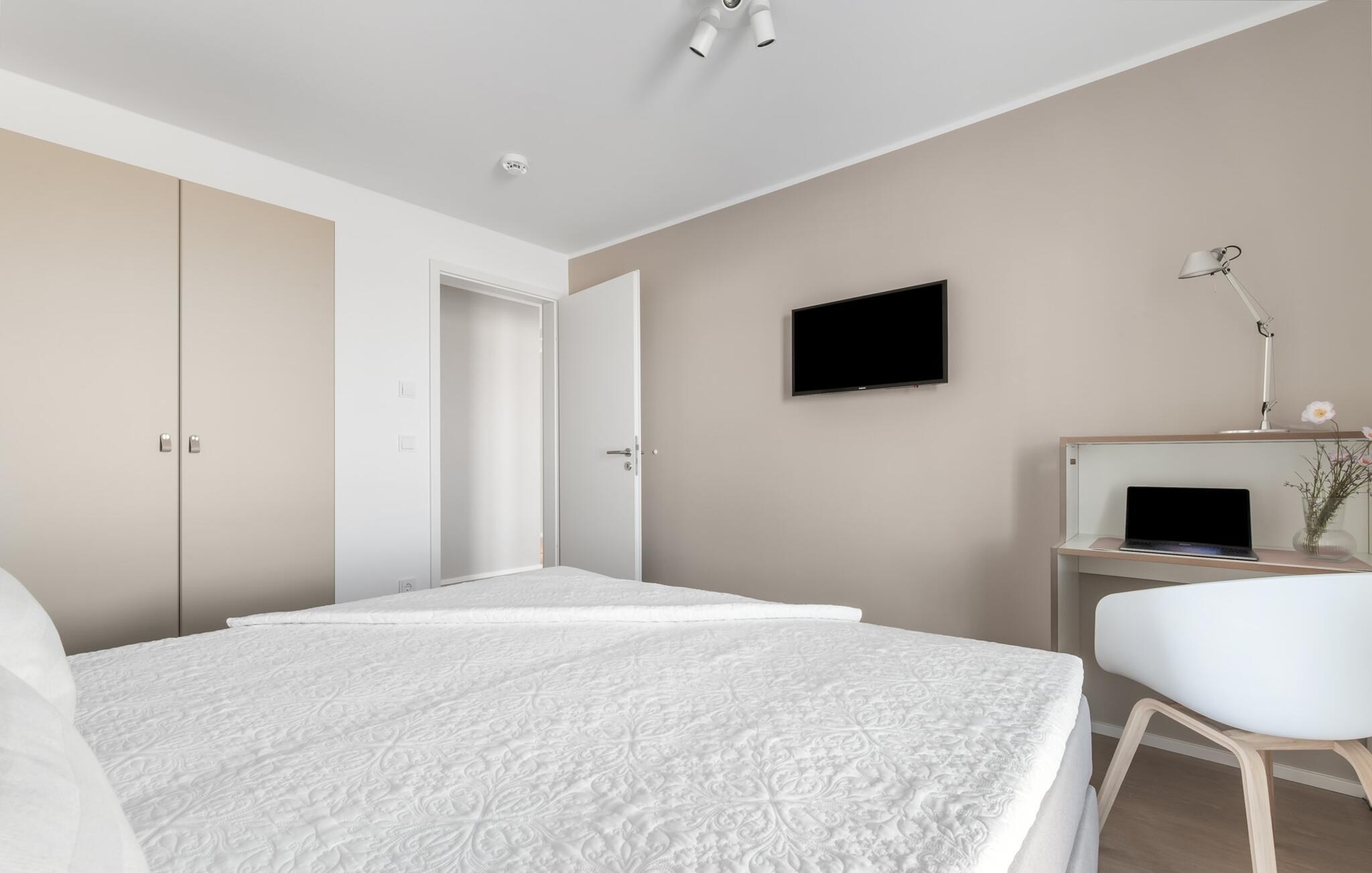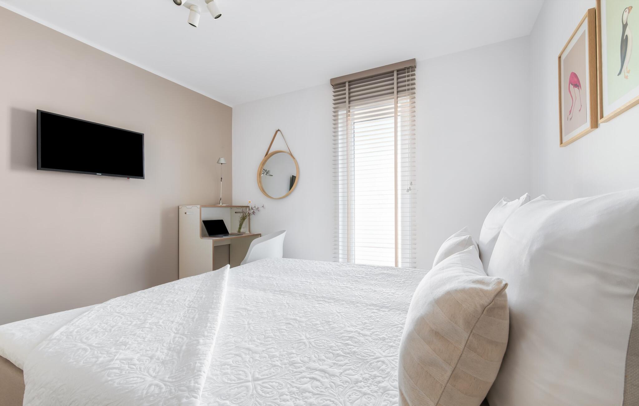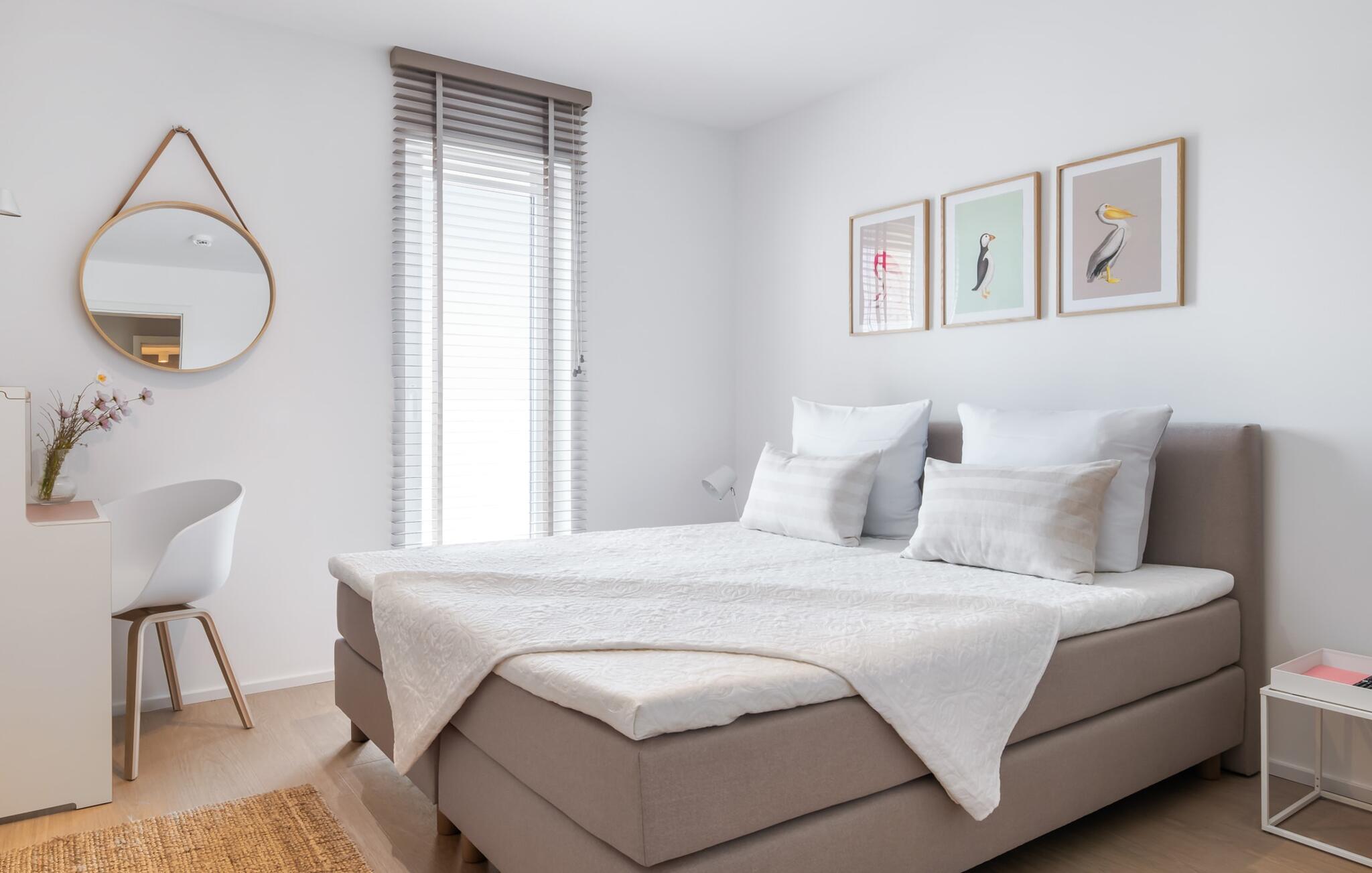 Bewusst separat vom Wohnzimmer bietet LAZY DAYS für alle, die Homeoffice auch im Urlaub leben wollen, einen vollständig funktionsfähigen Schreibtisch mit Schreibtischlampe und 100 mbit WLAN im Schlafzimmer an.