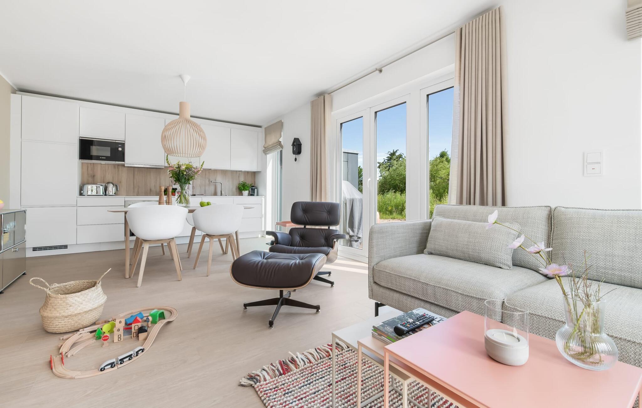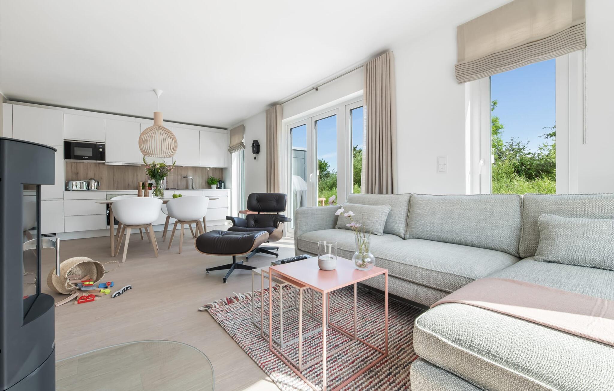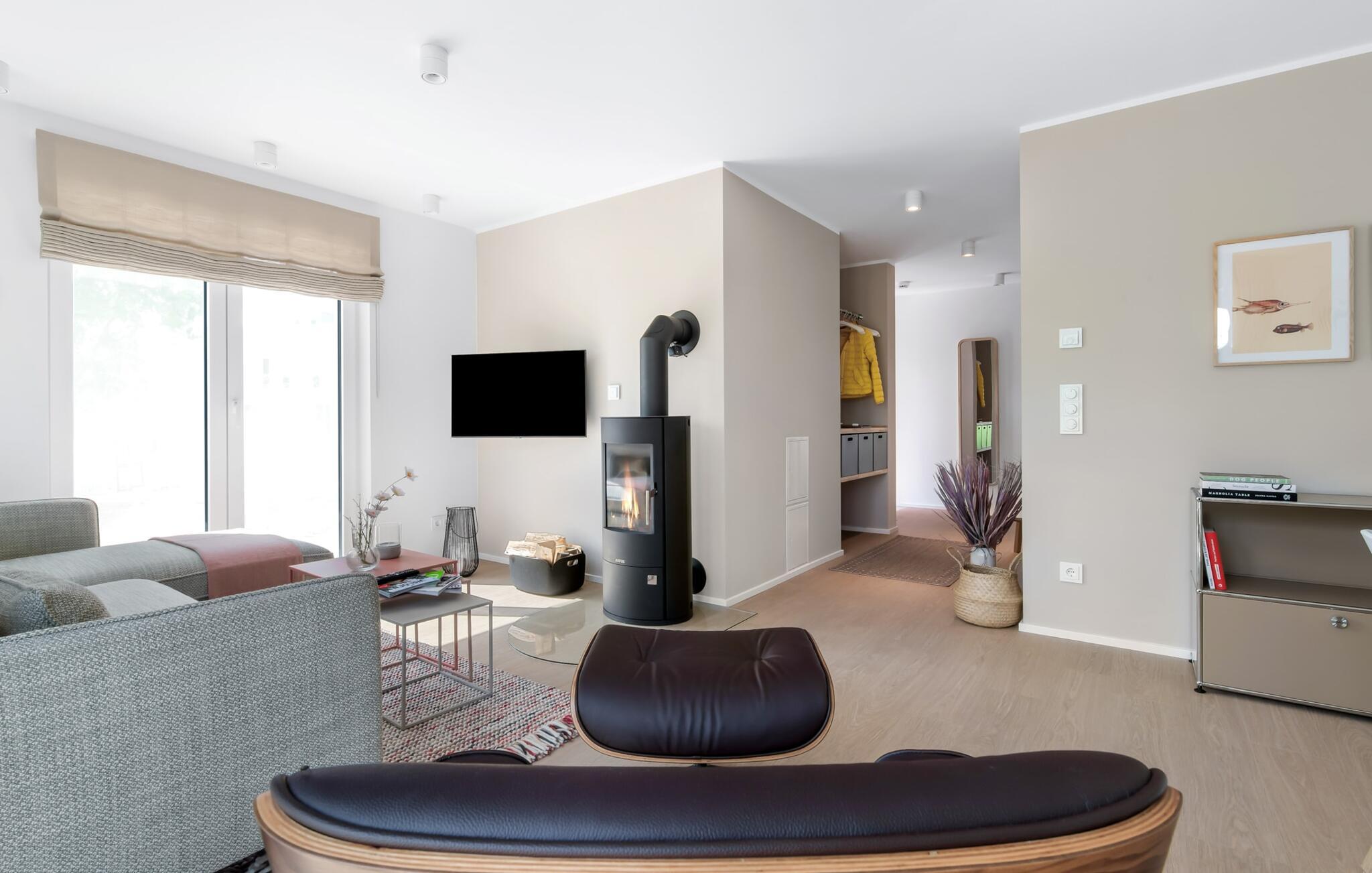 Die bodentiefe Fensterfront und die angrenzende großzügige süd-west Terrasse sind neben dem offenen Wohn-/Essbereich das Herz der Wohnung. Hier hineinkommen und sich sofort zu Hause fühlen ist eins. Auf der gemütlichen Couch zu entspannen, aus dem Fenster die Ruhe der Natur genießen oder fernzusehen ist Entspannung und Erholung pur. Und wenn die Ostsee sich sonnig von ihrer besten Seite zeigt, lädt die LAZY DAYS Terrasse mit komfortablem Strandkorb ganztägig zum Genießen ein. Bei nordischem Wetter sorgt der Kaminofen mit seinem prasselnden Feuer für weitere Behaglichkeit.