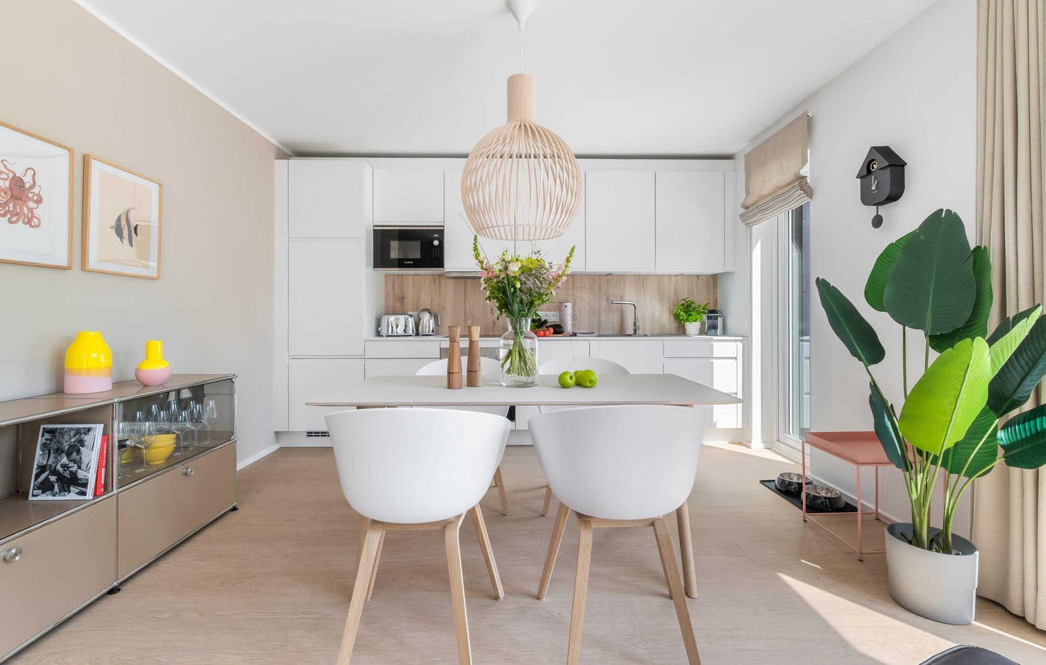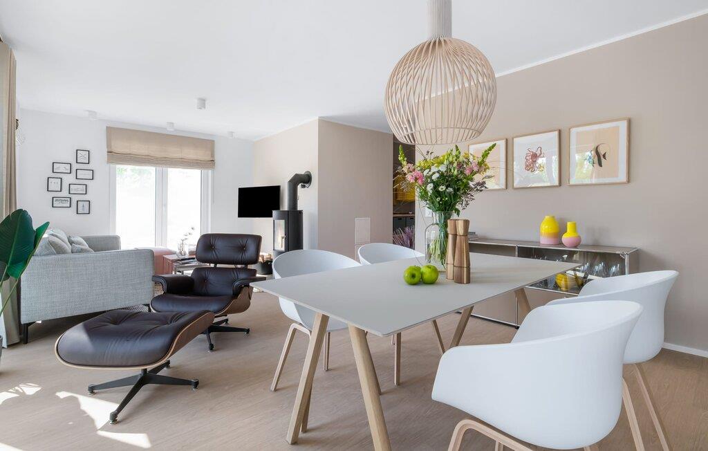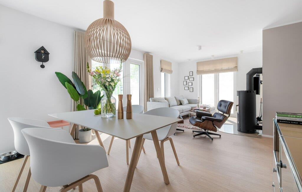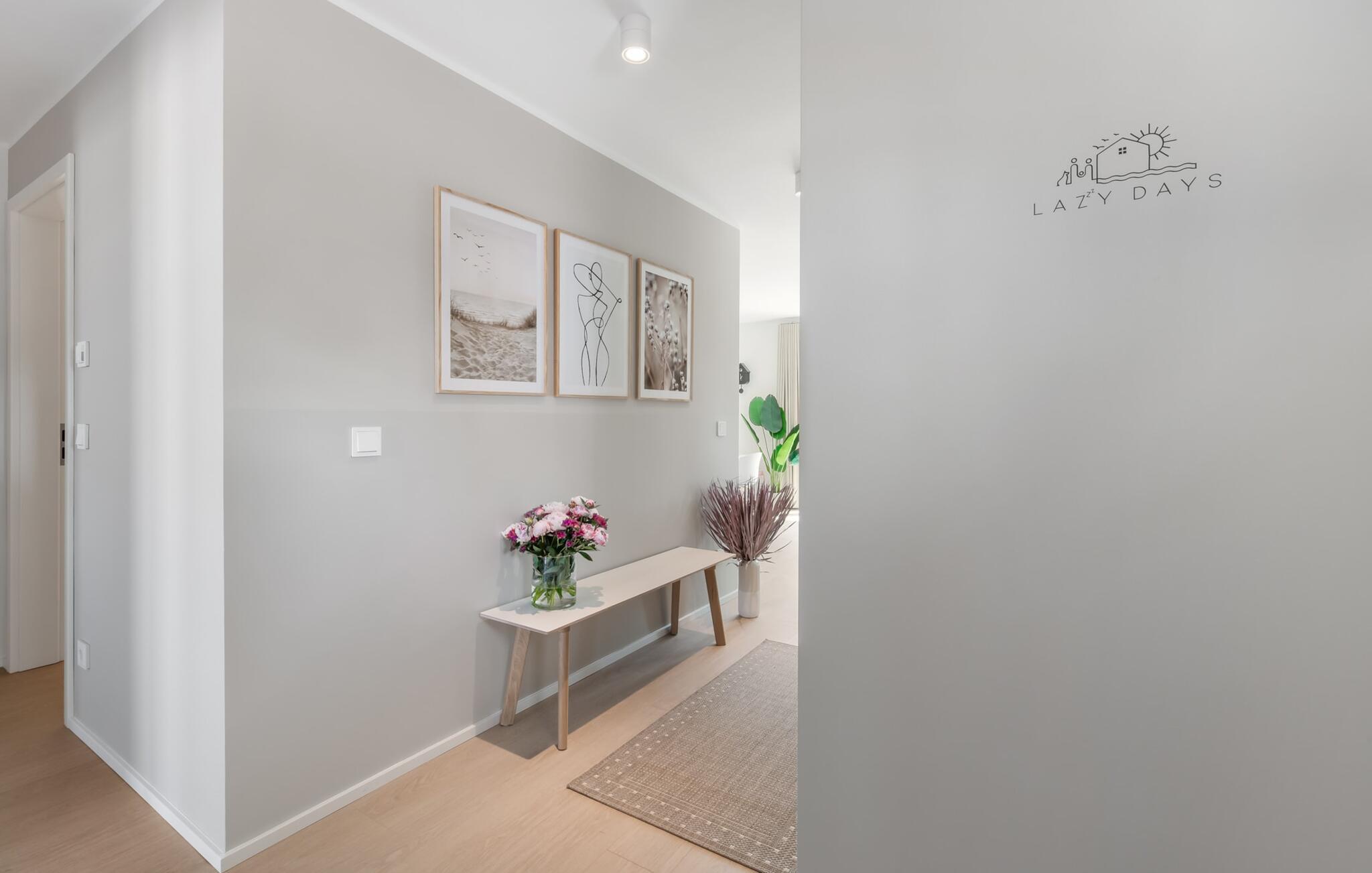 Die bodentiefe Fensterfront und die angrenzende großzügige süd-west Terrasse sind neben dem offenen Wohn-/Essbereich das Herz der Wohnung. Hier hineinkommen und sich sofort zu Hause fühlen ist eins. Auf der gemütlichen Couch zu entspannen, aus dem Fenster die Ruhe der Natur genießen oder fernzusehen ist Entspannung und Erholung pur. Und wenn die Ostsee sich sonnig von ihrer besten Seite zeigt, lädt die LAZY DAYS Terrasse mit komfortablem Strandkorb ganztägig zum Genießen ein. Bei nordischem Wetter sorgt der Kaminofen mit seinem prasselnden Feuer für weitere Behaglichkeit.