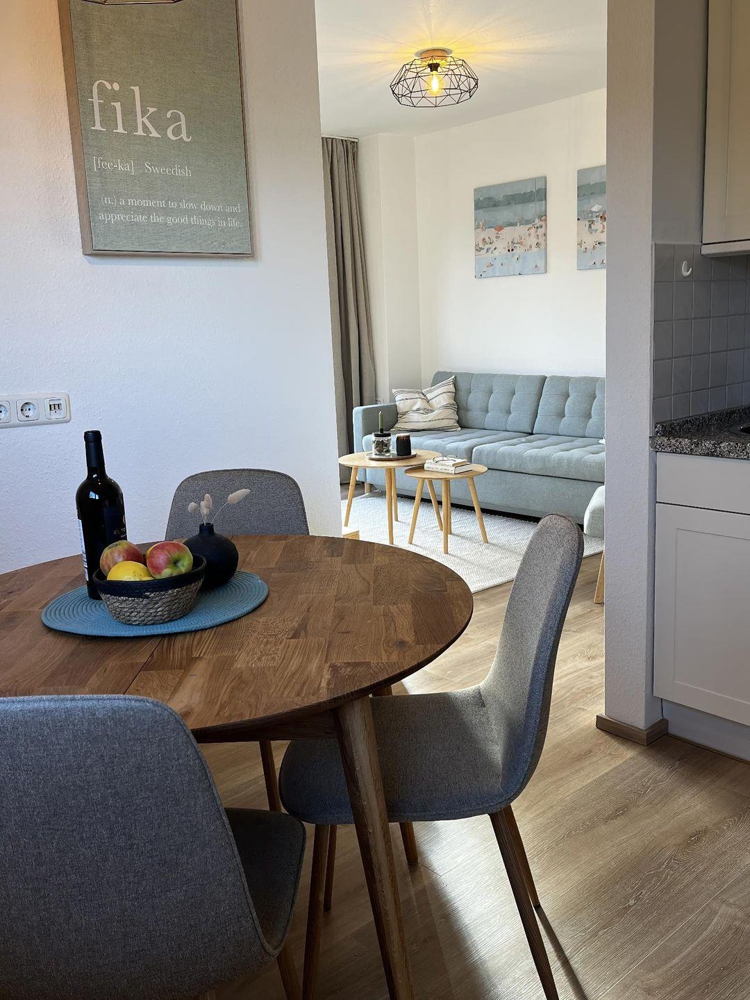 Das Wohnzimmer verfügt über ein Ausziehsofa (1,40m x 2,00m) ist hell und freundlich eingerichtet, von dort geht man auf die Südterrasse mit Gartenmöbeln und eigenem Strandkorb.