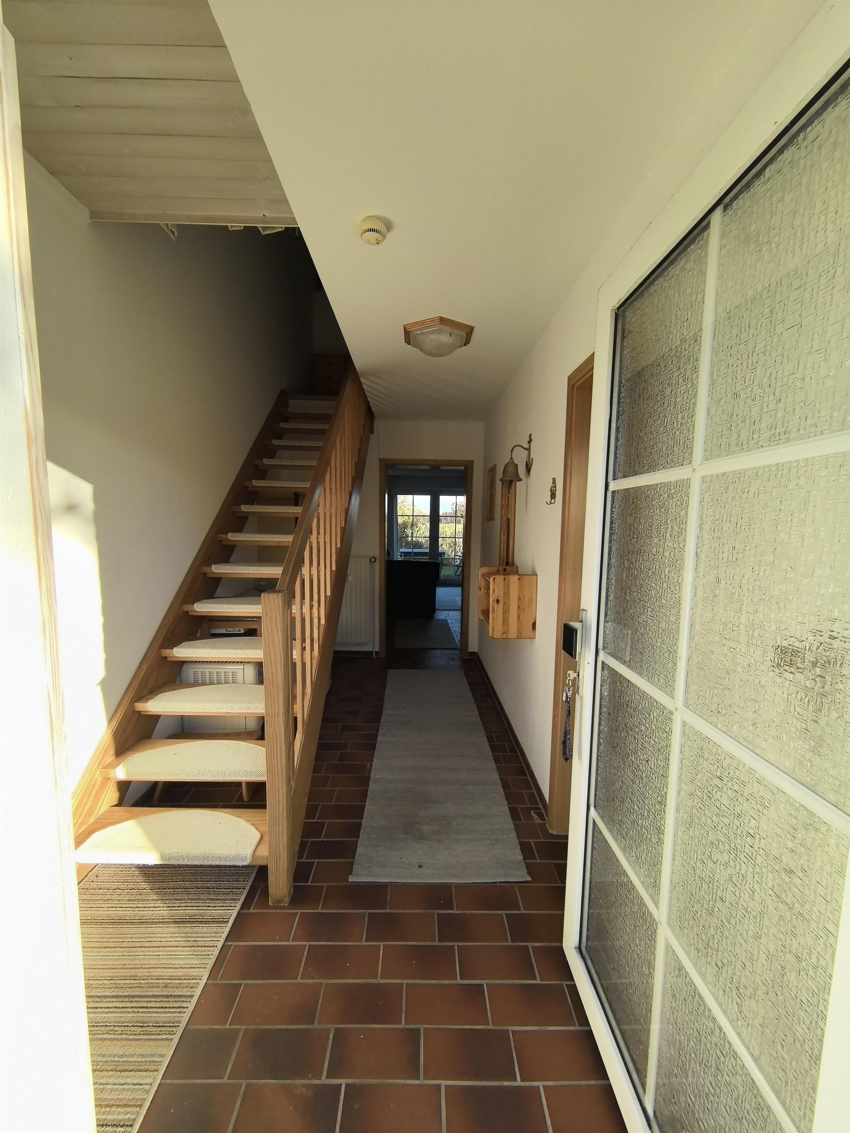 Die 56 m2 der Ferienwohnung verteilen sich auf ein lichtdurchflutetes Wohnzimmer mit offener Küche und Zugang zur Terrasse und dem gemeinschaftlich genutzten, großen Garten. Vom Flur aus gelangt man außerdem in ein kleines Duschbad und über eine Treppe ins Obergeschoss. Dort erwartet Sie ein großes Schlafzimmer mit traumhaftem Blick über die Felder, sowie ein Kinderzimmer mit Einzelbett und Kinder/Baby-Bett.