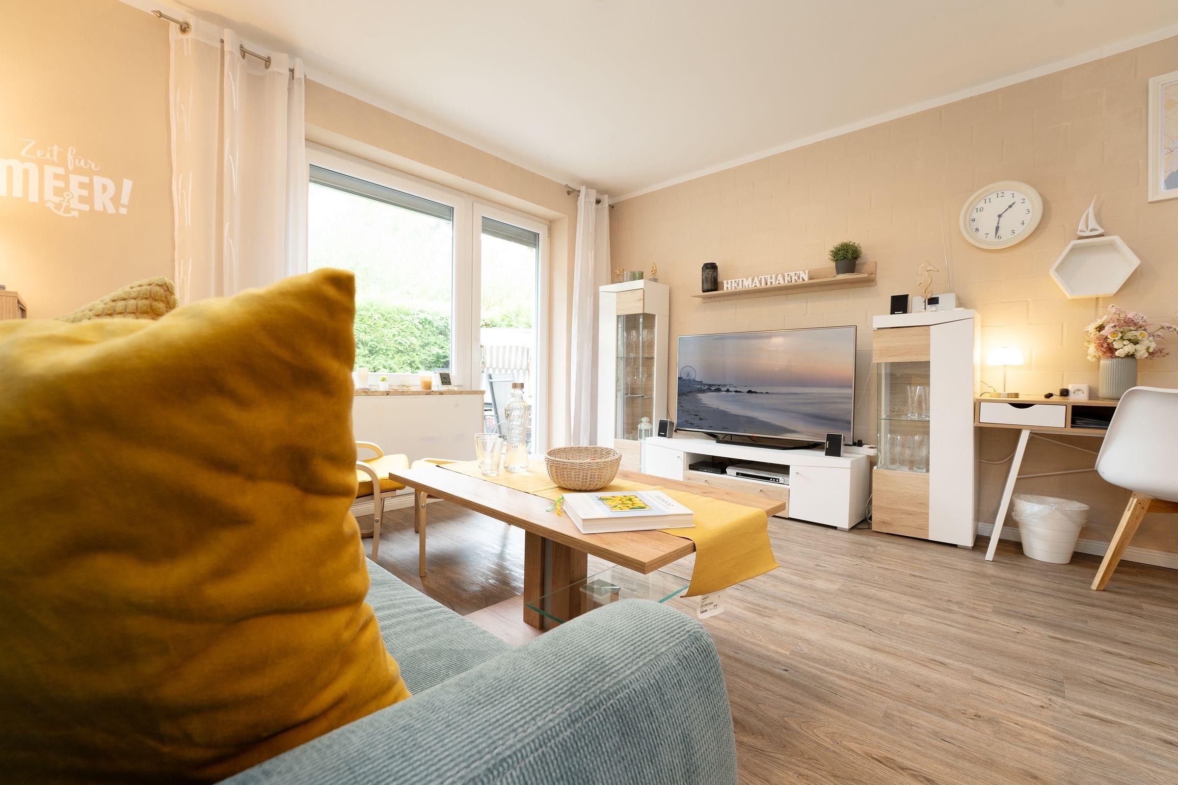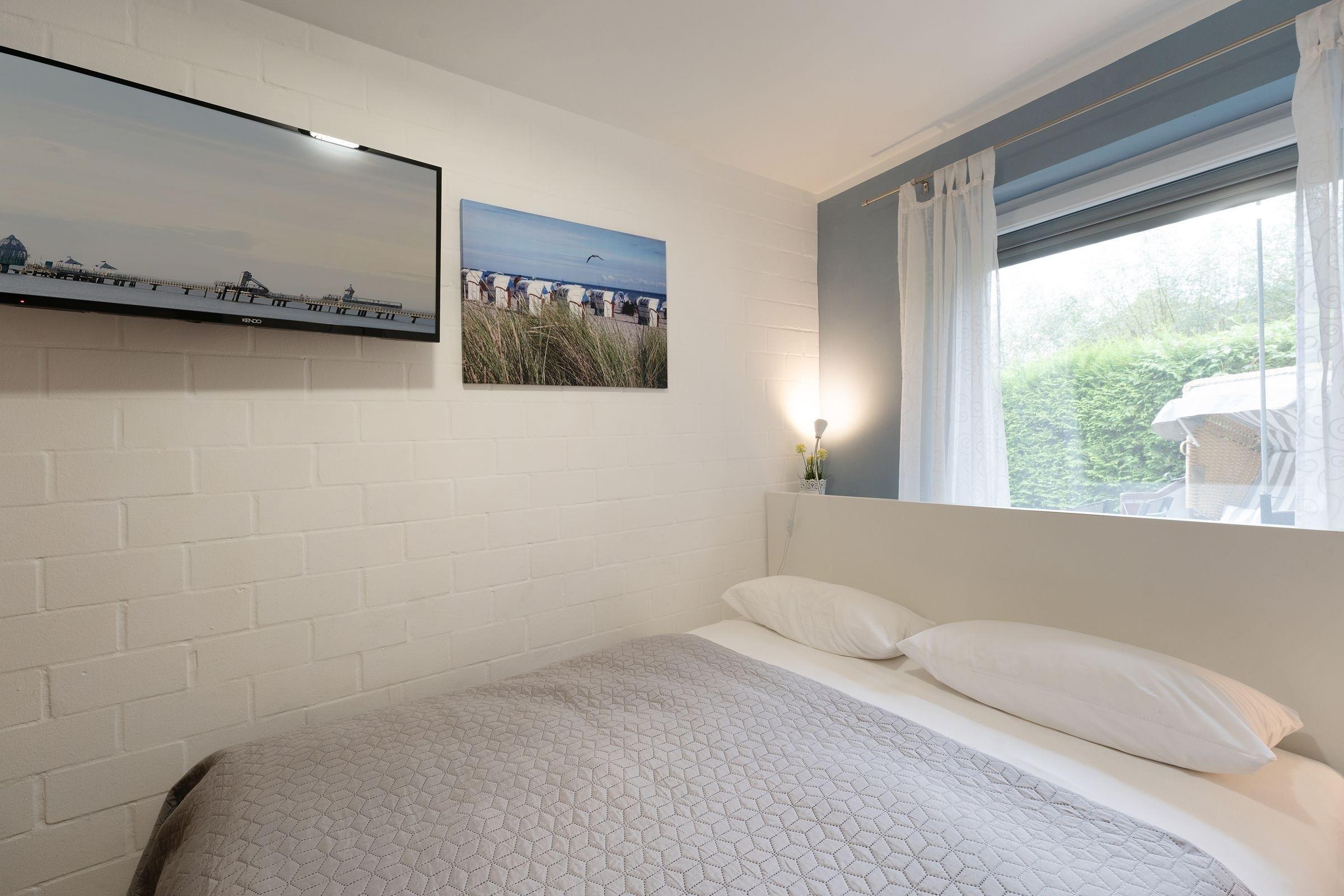 Ein hell und freundlich eingerichteter Wohnraum mit integrierter Küche bildet das Herzstück dieser gemütlichen Ferienwohnung. Von hier aus gelangen Sie auch auf Ihre kleine idyllische möblierte Sonnenterrasse mit eigenem Strandkorb. Zur Zubereitung eines schmackhaften Frühstücks, Mittag- oder Abendessens finden Sie in der modernen Küche alles, was Sie benötigen. Das Doppelbett (160x200 cm) im geschmackvoll eingerichteten Schlafzimmer lädt zum Träumen und Entspannen ein, hier sorgt ein zweites Fernsehgerät bei Bedarf für Unterhaltung zum Einschlafen.