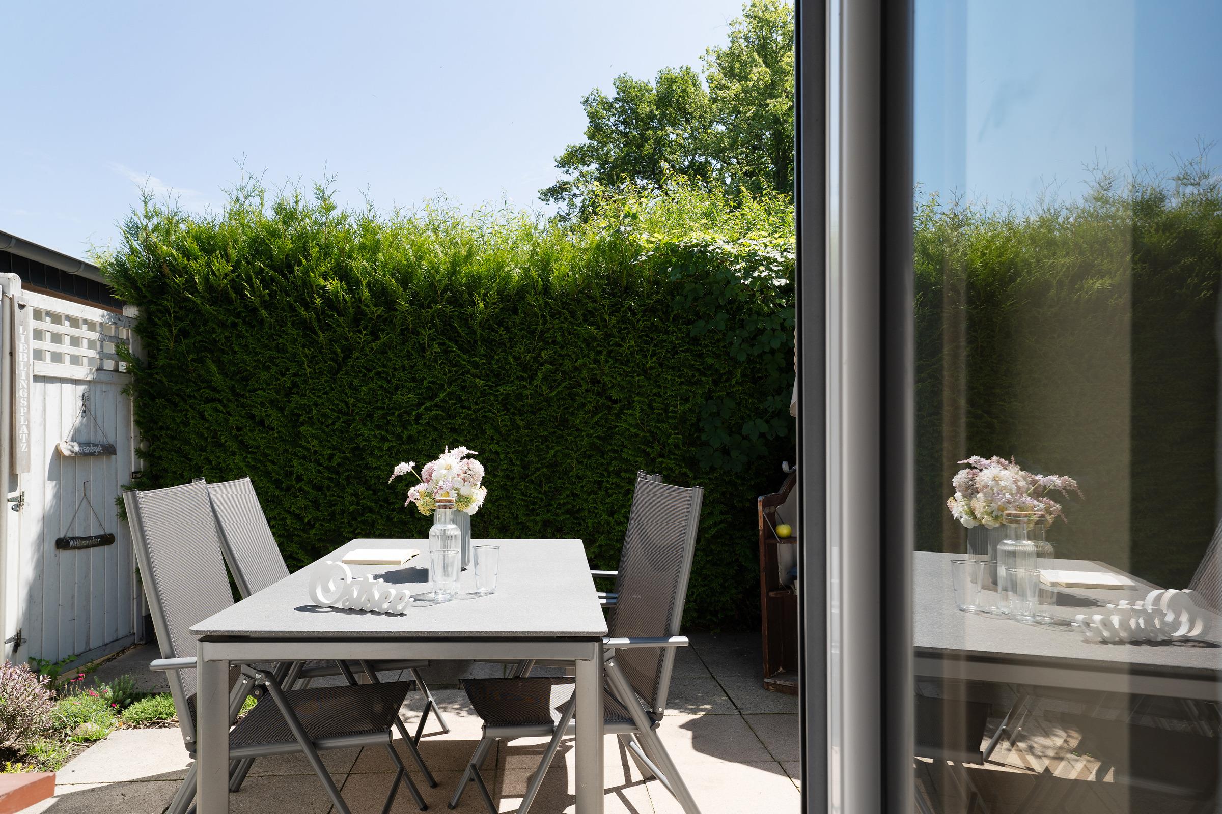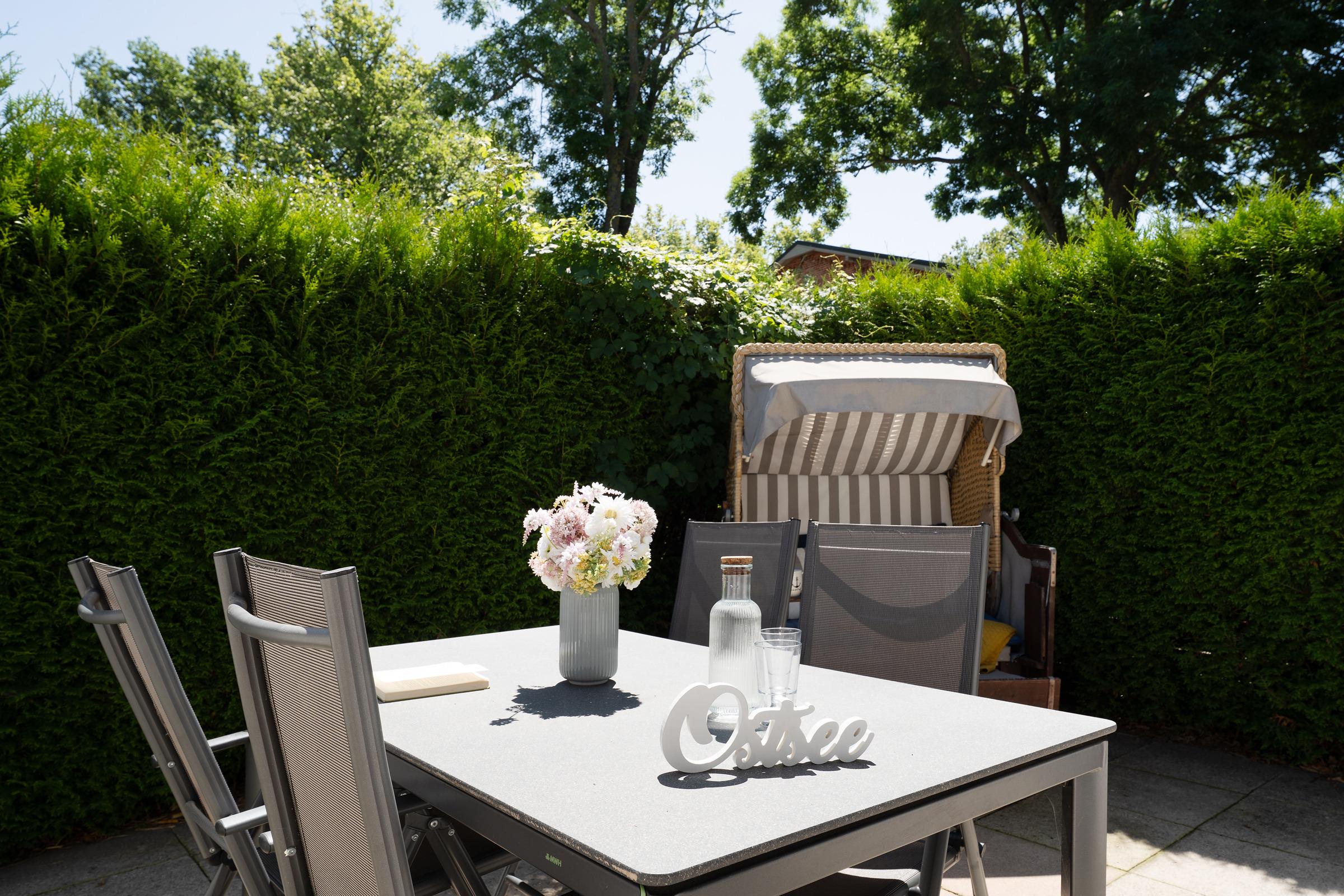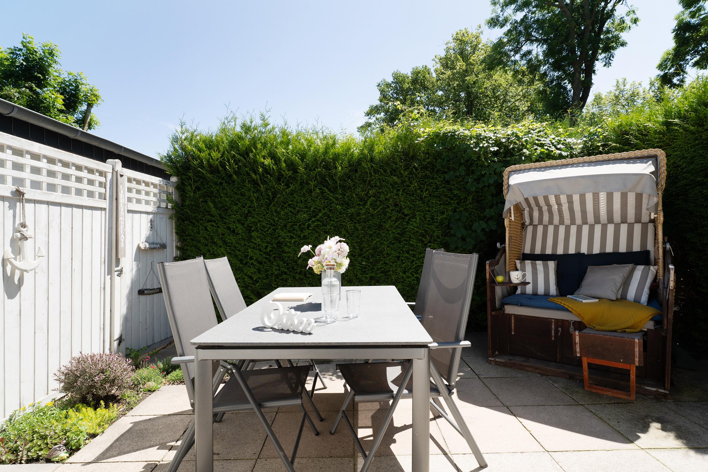 Gemütliche Ferienwohnung in Lenste mit Terrasse, Strandkorb und moderner Küche für erholsamen Urlaub an der Ostsee.