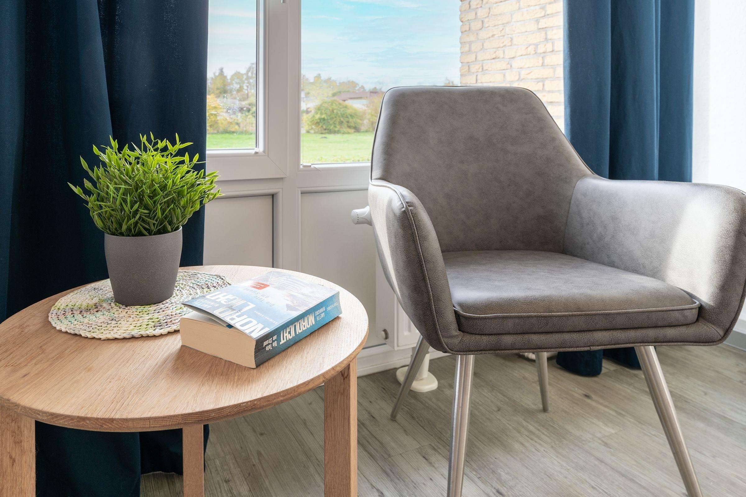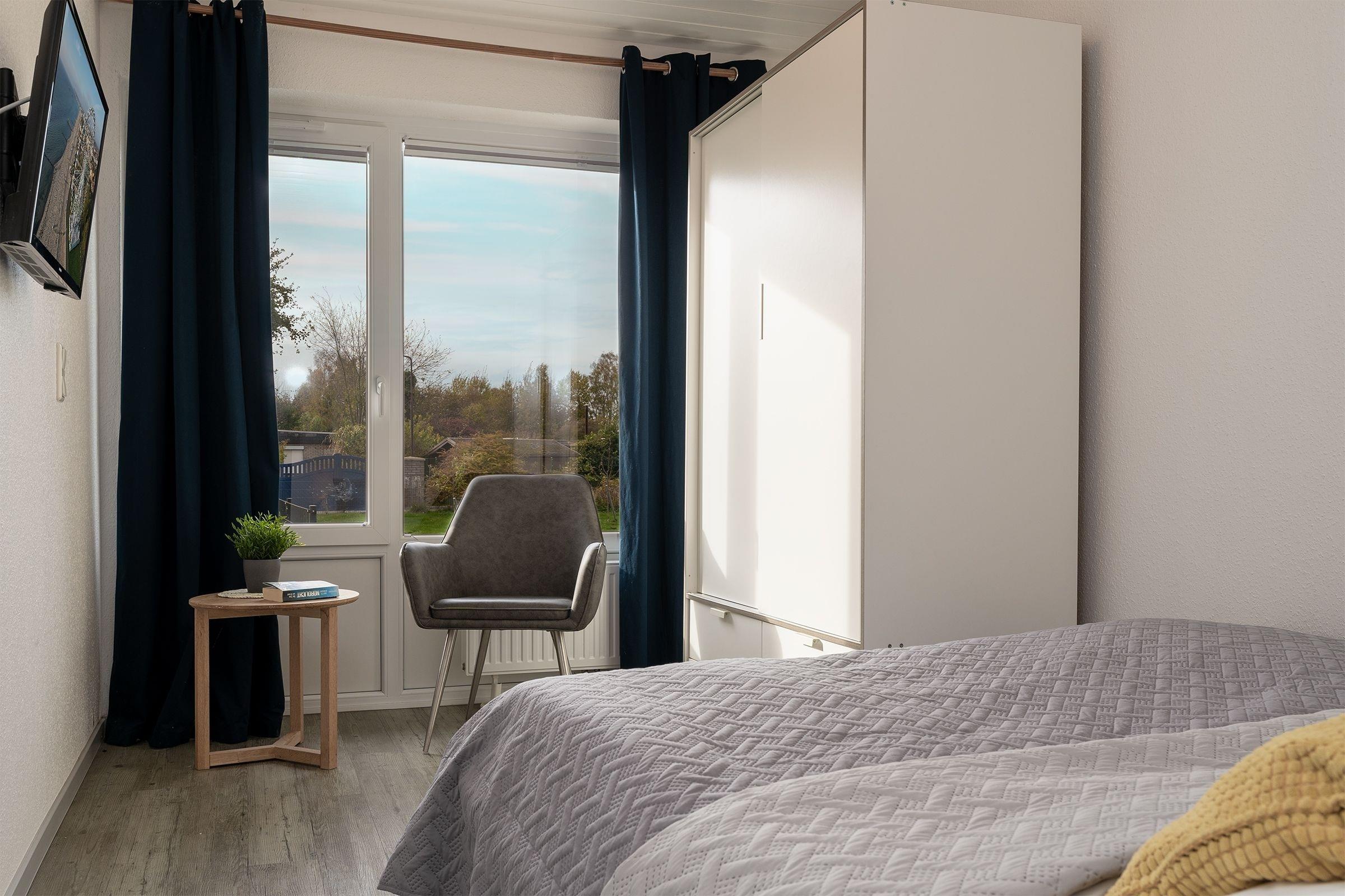 Im Wohnzimmer mit Sofa, Sessel und TV befindet sich eine offene Küche ausgestattet mit Herd, Backofen, Mikrowelle, und vieles mehr. Von hier haben Sie Zugang zu Ihrer Terrasse und dem Gemeinschaftsgarten. Das Badezimmer überzeugt mit einer bodentiefer Dusche, Fußbodenheizung und beheizbarem Handtuchhalter. Ein Schlafzimmer verfügt über ein Doppelbett (160x200 cm) und ein zweites TV Gerät, ein weiteres Schlafzimmer über 2 Einzelbetten (90x200 cm). Der WLAN-Anschluss ist selbstverständlich inklusive.