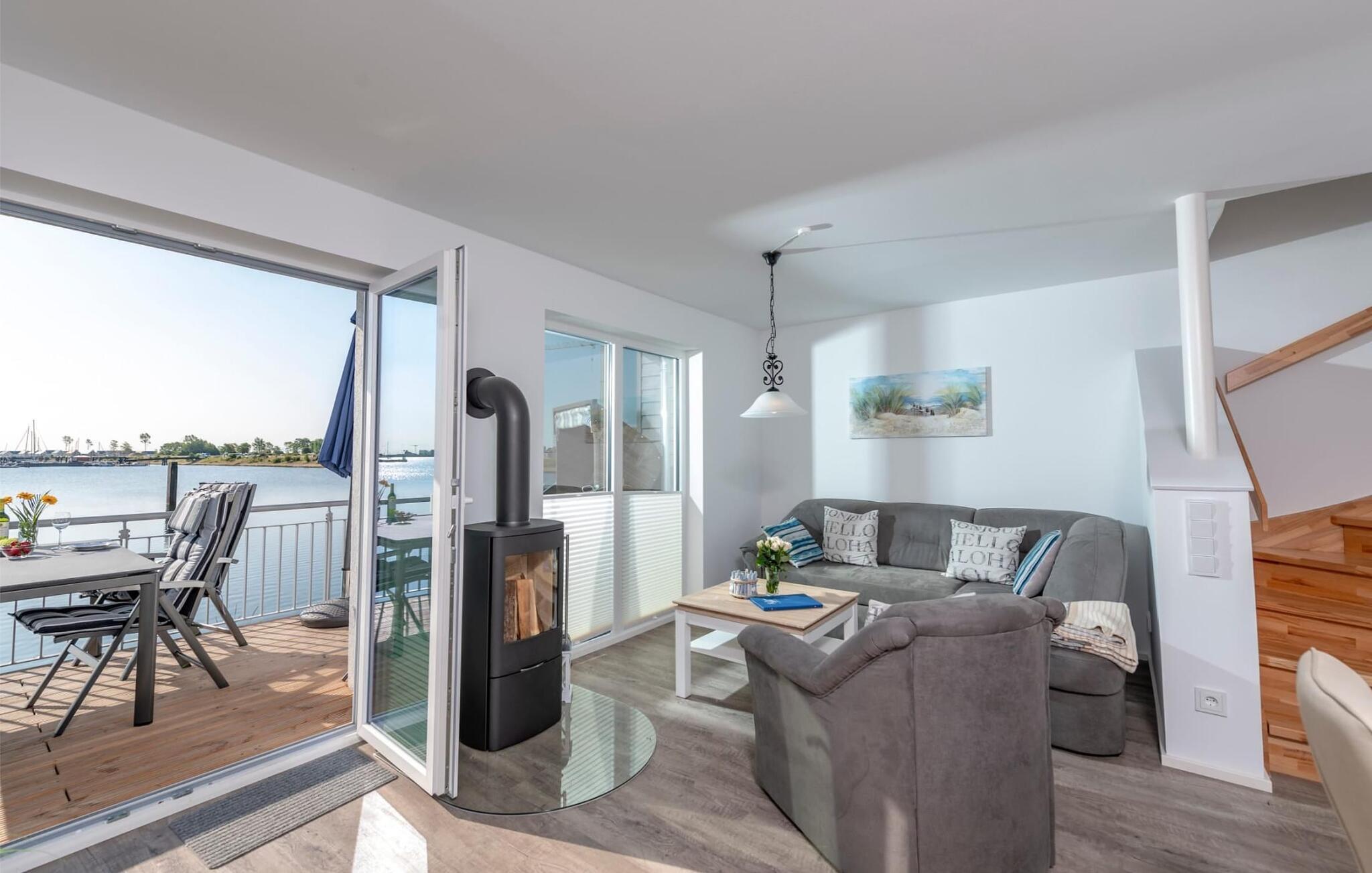 Der offen gestaltete, lichtdurchflutete Wohn- und Essbereich befindet sich im Erdgeschoss des Ferienobjekts. Von hier aus gelangt man direkt auf die angrenzende Terrasse mit nordischem Strandkorb. Frühstücken bei Morgensonne oder ein gemeinsamer Grillabend, Hafenkino ist hierbei garantiert. Die Küche lässt keine Wünsche offen, rundum ausgestattet erlaubt diese vollen Urlaubskomfort.