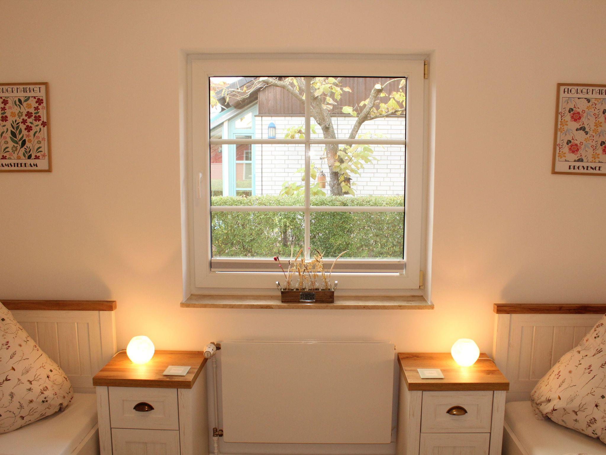 Die liebevoll eingerichtete Ferienwohnung in Weitenhagen bietet Platz für bis zu vier Personen und lädt zu einem erholsamen Aufenthalt in ruhiger Lage ein. Das helle Wohnzimmer ist mit einer großen, gemütlichen Eckcouch, einem Fernseher sowie Radio, CD- und Videoplayer ausgestattet. Ein Esstisch und eine offene, komplett eingerichtete Küchenzeile schaffen eine wohnliche Atmosphäre, in der Sie sich rundum wohlfühlen können. Das Hauptschlafzimmer verfügt über ein komfortables Doppelbett, eine kleine Sitzgruppe und einen zusätzlichen Fernseher. Im zweiten Schlafzimmer befinden sich zwei Einzelbetten ideal für Kinder oder mitreisende Freunde. Das Badezimmer ist modern gestaltet und mit Dusche und WC ausgestattet. Bettwäsche und Handtücher sind selbstverständlich vorhanden.