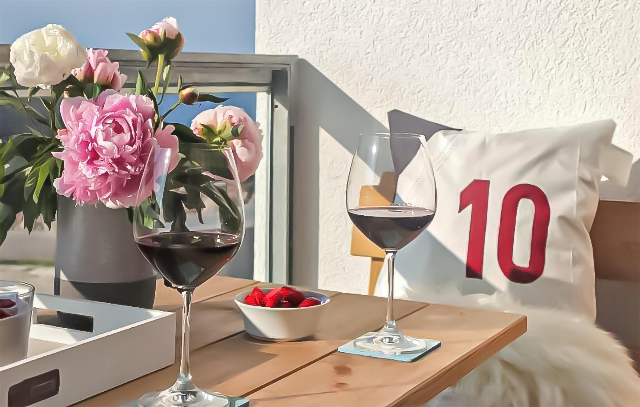 Unser Lieblingsplatz: Auf der Eckbank auf dem Balkon direkt vor der Ostseeam besten mit einer Tasse Kaffee in der Hand.