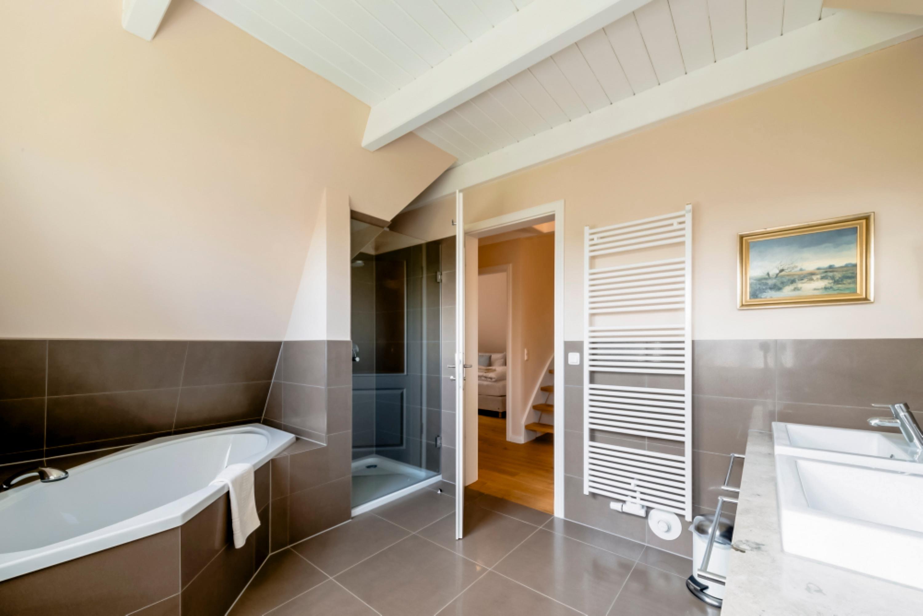 Badezimmer: Eckbadewanne, Dusche, Waschtisch und WC.