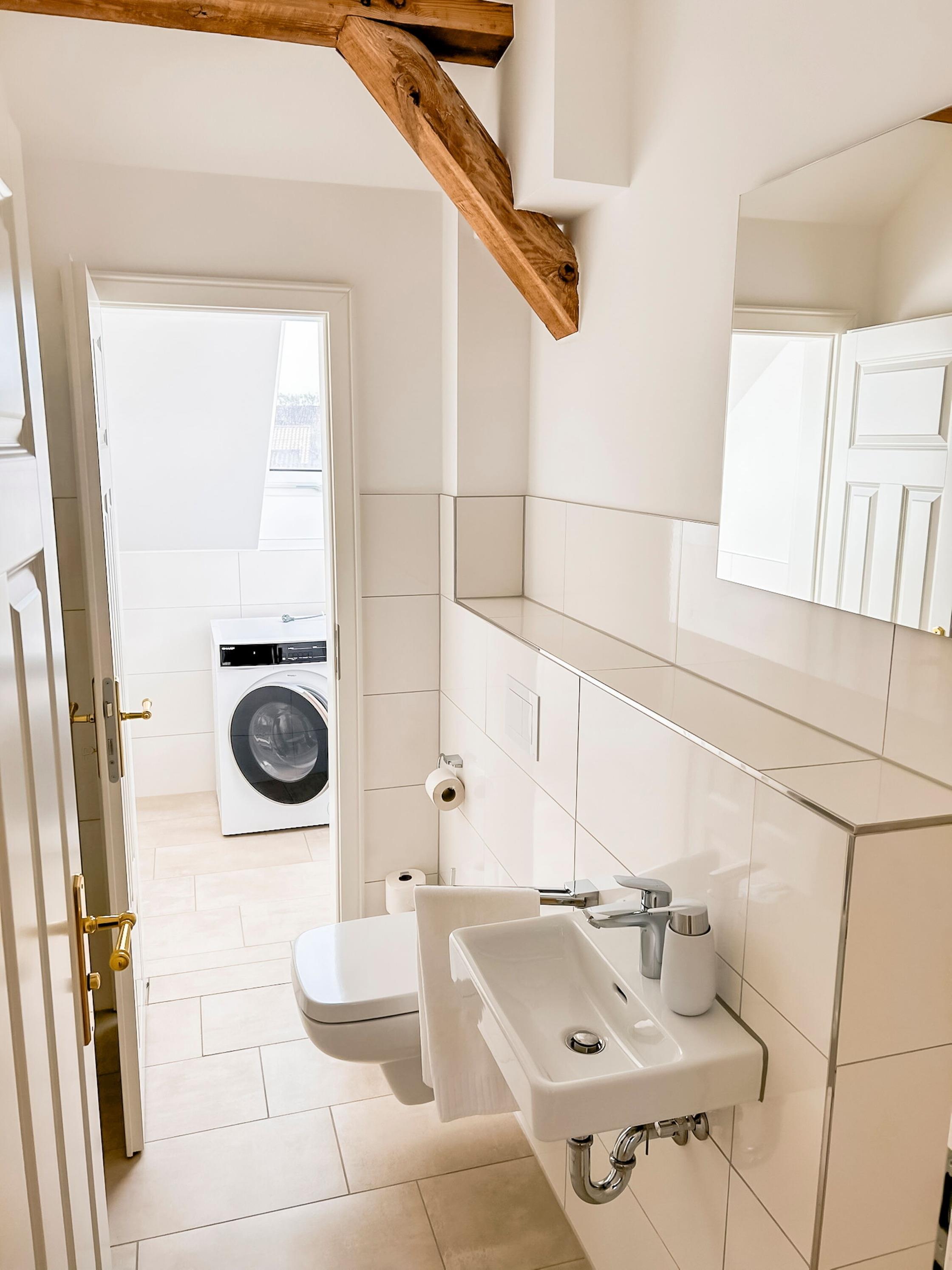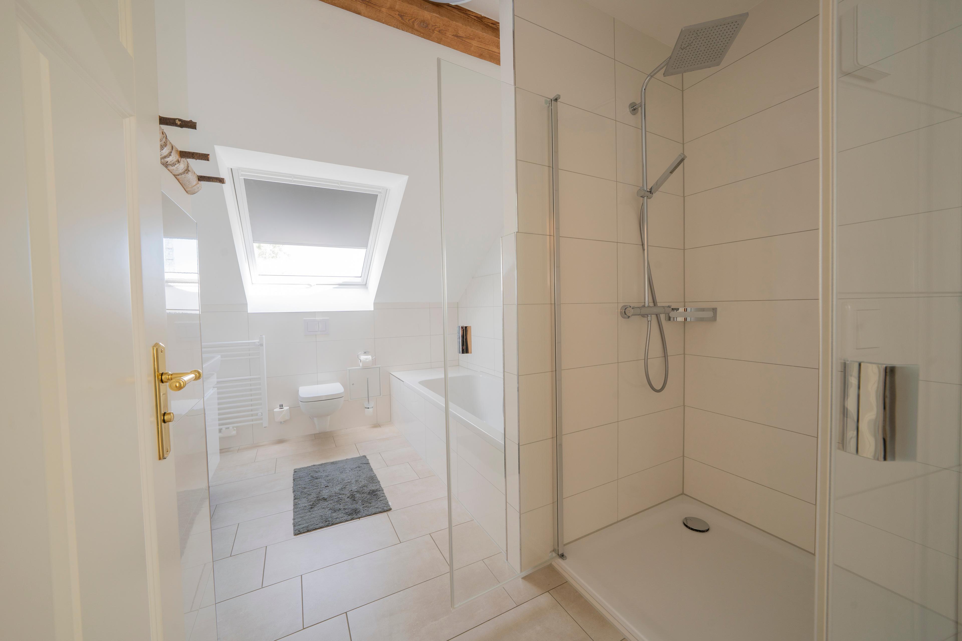 Moderne Bäder: Ein Badezimmer mit Badewanne, Dusche, Waschtisch und WC sowie ein zusätzliches Gäste-WC und ein separater Waschraum stehen zur Verfügung.