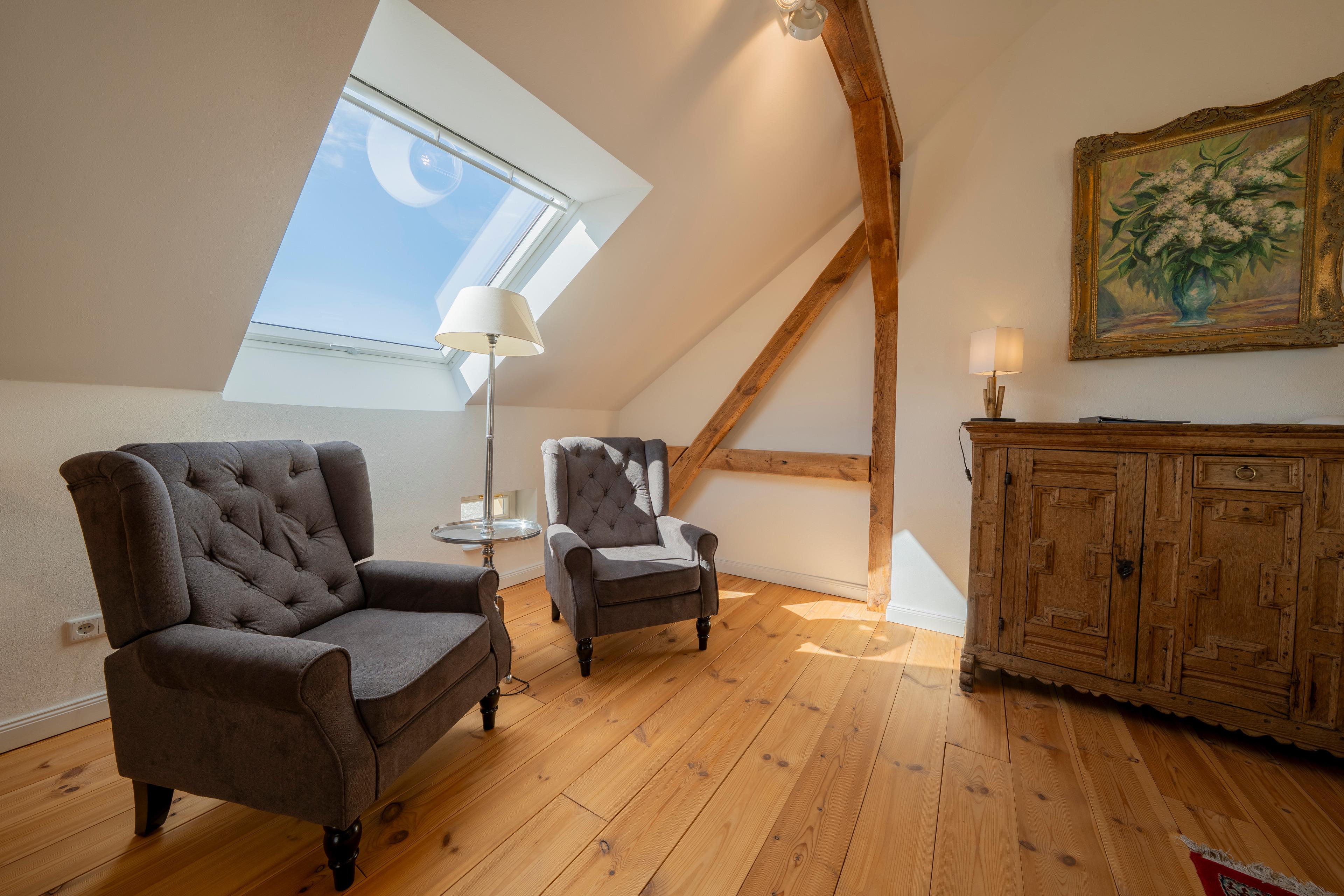 Charmante Gestaltung: Hohe Decken, lichtdurchflutete Räume und sichtbare Balken schaffen ein einzigartiges Ambiente.