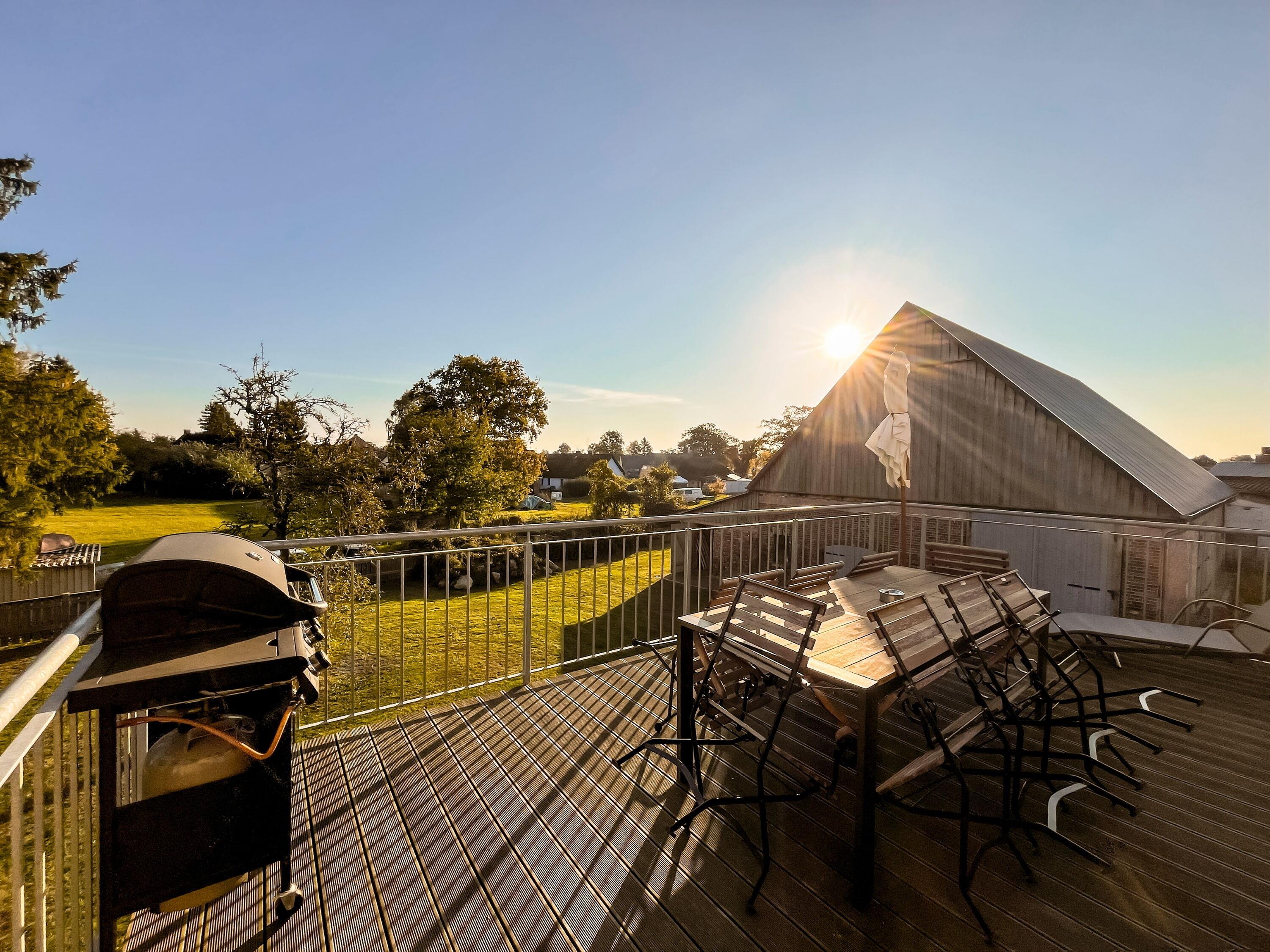 Großer Balkon: Ausgestattet mit Gartenmöbeln, Sonnenschirm und Grill – ideal für entspannte Stunden im Freien.