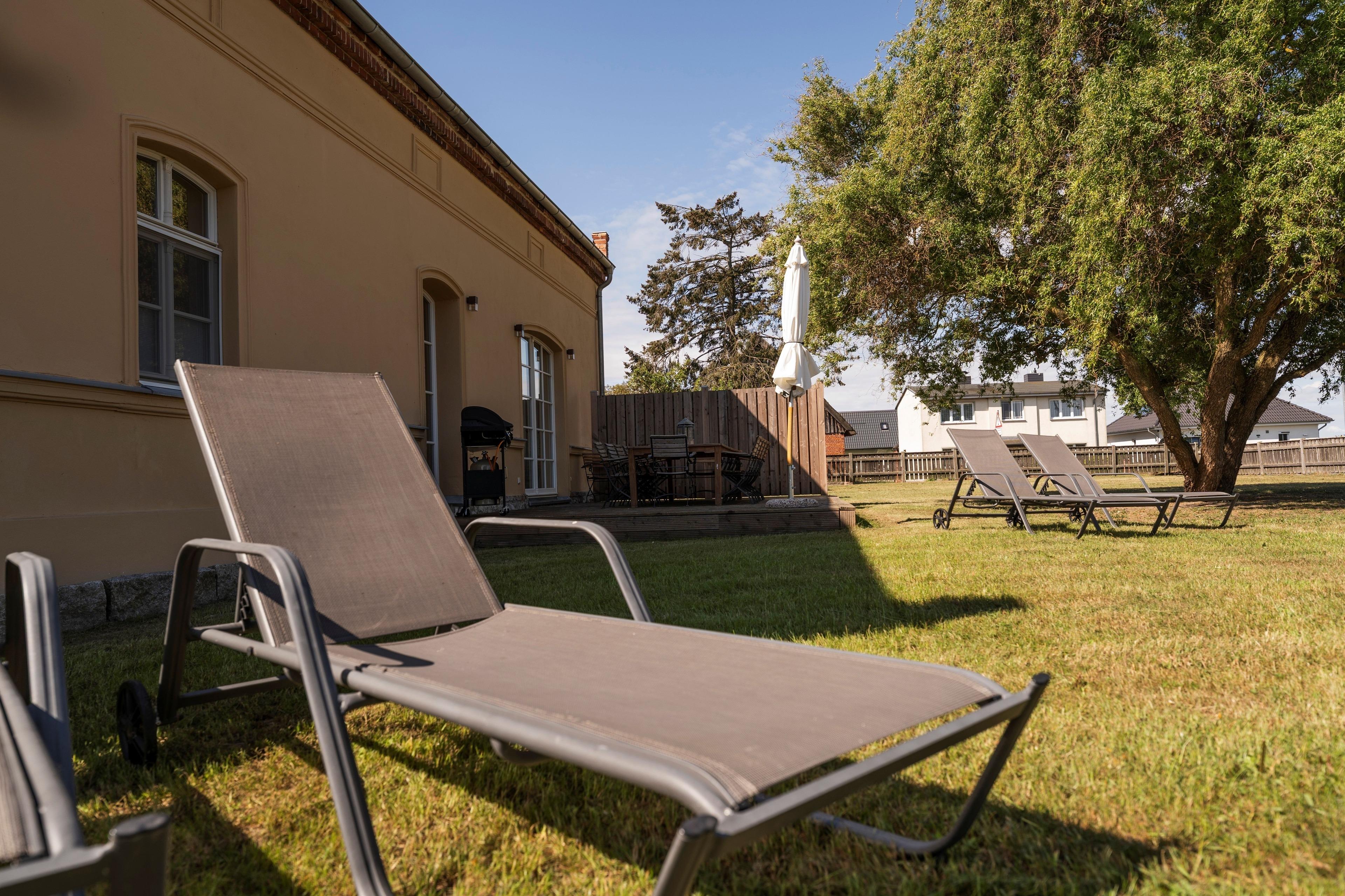 Weitläufiger Garten mit Sonnenliegen, Rasenflächen und Naturblick