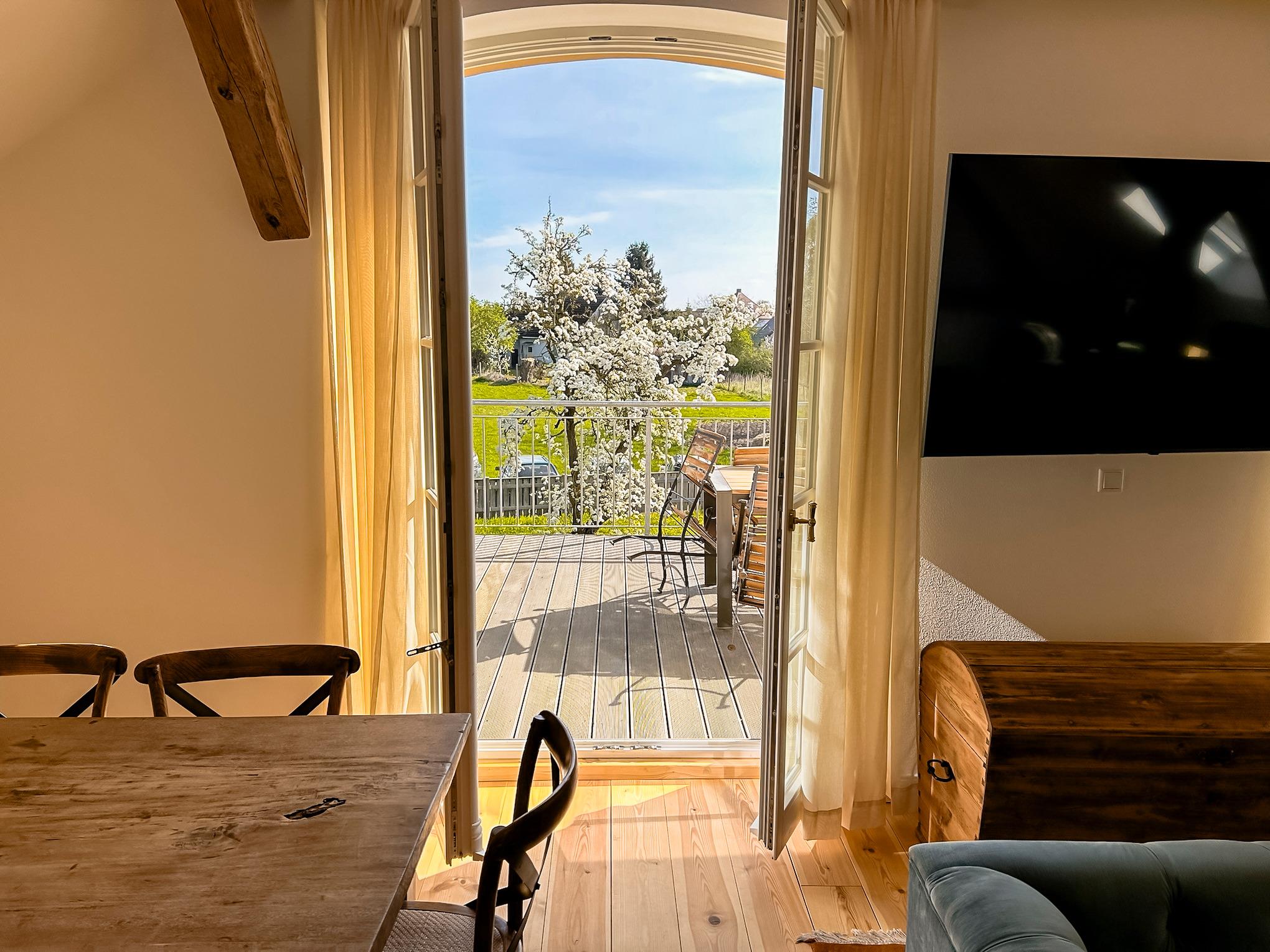 Großer Balkon mit Gartenmöbeln und traumhaftem Ausblick