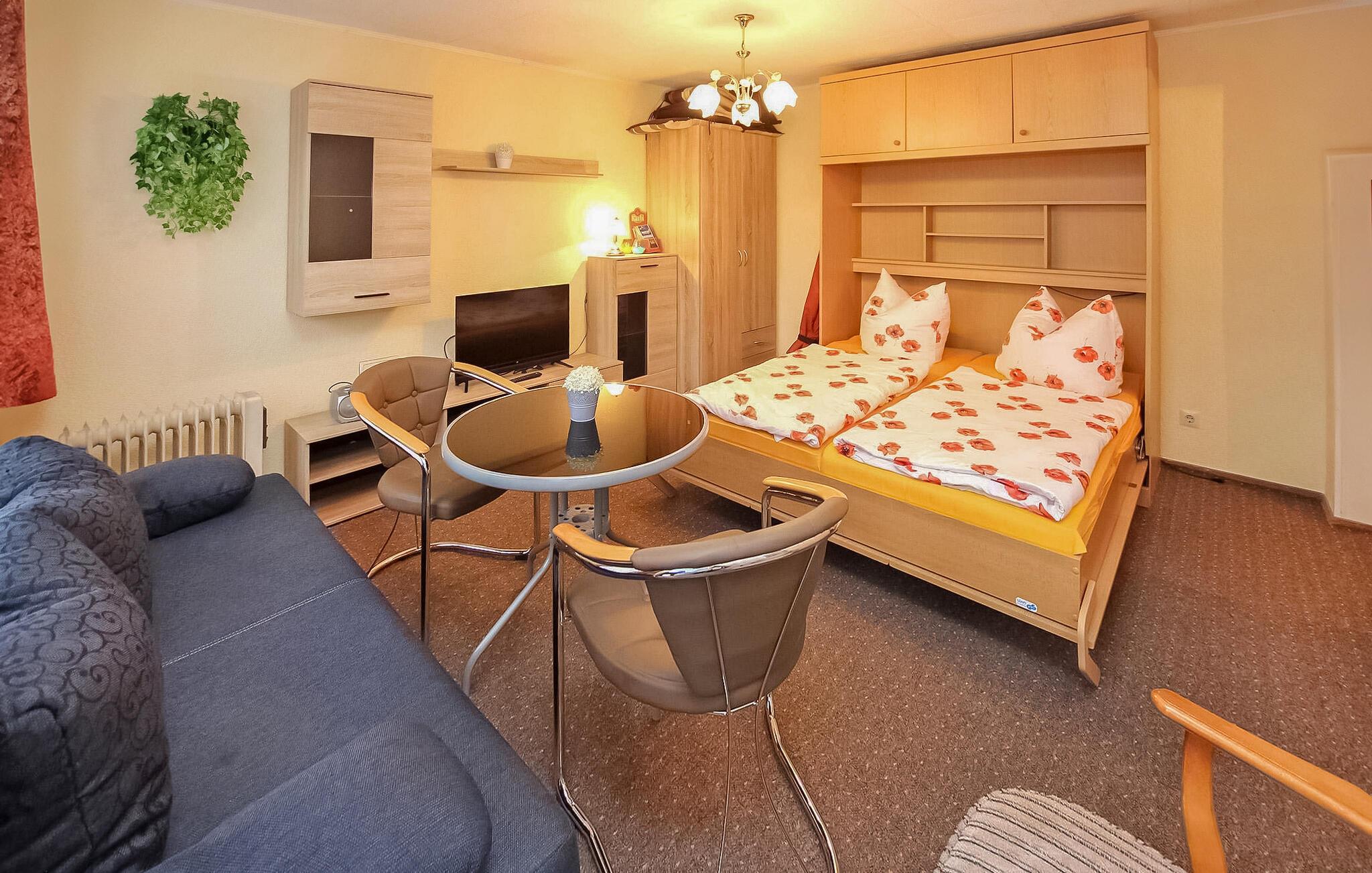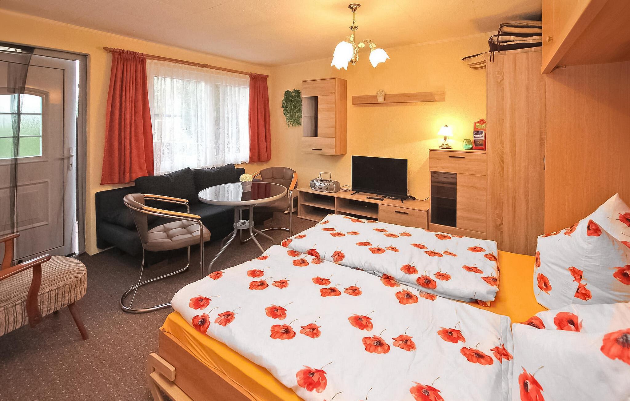 Nur ca. 200 m vom feinsandigen Boddenstrand entfernt befindet sich innerhalb einer kleinen Wohnsiedlung auf dem separaten Nachbargrundstück der Eigentümer das ca. 26 qm große, einfach ausgestattete Ferienhaus für bis zu 3 Personen. Der Bahnhof und eine beliebte Räucherei sind nur wenige Gehminuten entfernt.Das Ferienhaus verfügt über einen kombinierten Wohn- Schlafraum (Schrank-Doppelbett, Schlafsofa, kleiner Esstisch mit Stühlen, Flachbild-TV, Radio/CD-Player, Ölradiator), eine kleine Küche (E-Kochplatten, Kühlschrank, Kaffeemaschine, Toaster), ein Bad mit Regenwald-Dusche/WC sowie über eine möblierte Terrasse mit Grill. Ein öffentlicher Parkplatz befindet sich ca. 20 m entfernt, zum Ein- und Ausladen kann vor dem Grundstück gehalten werden.Im Gesamtpreis sind die Endreinigung, Wasser- und Energiekosten sowie Bettwäsche und Handtücher enthalten. Haustiere sind in diesem Objekt nicht erlaubt.