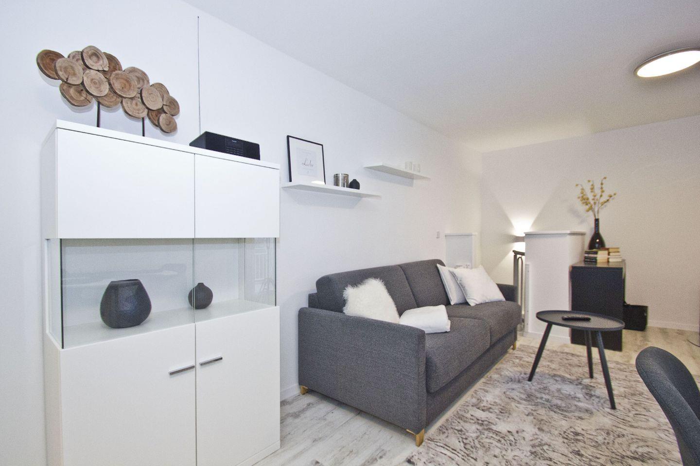 WOHNEN // 1 Wohnzimmer, Wohnraum mit Essbereich, Sitzgarnitur mit bequemer Schlafcouch, Flachbild-TV, Kamin++