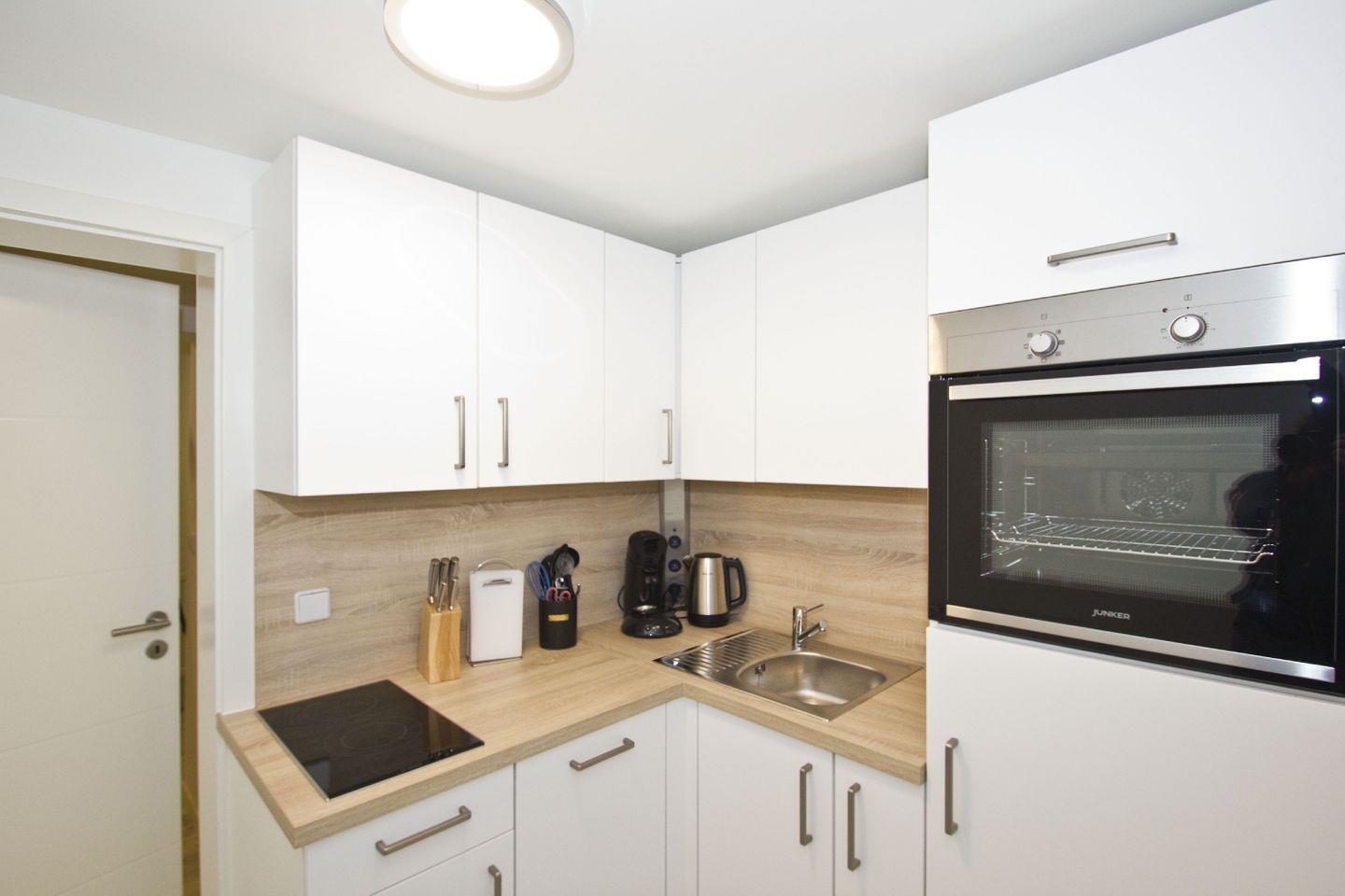 KÜCHE // separate Küche, Cerankochfeld (2-Platten), Spülmaschine, Kühlschrank mit Gefrierfach, Backofen, Toaster, Wasserkocher, Kaffeemaschine, reichlich Besteck, Geschirr und Küchenutensilien ++
