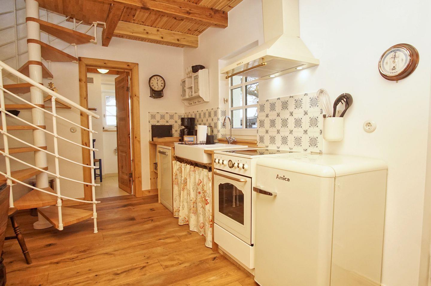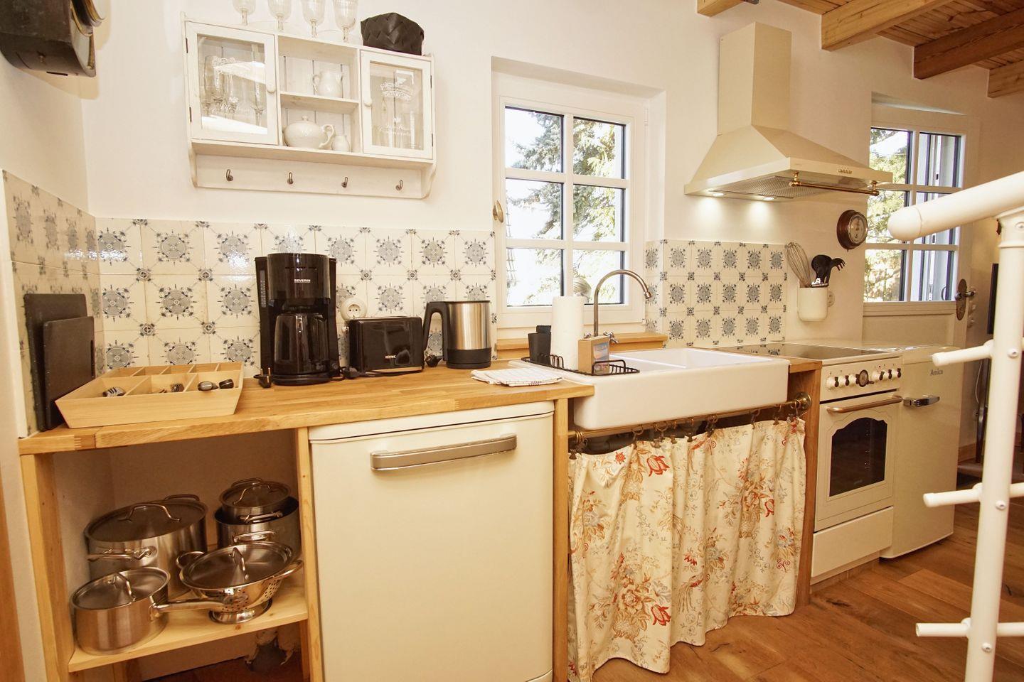 KÜCHE // offene Kochnische im Wohnzimmer mit Esstisch, Ceranfeld, Spülmaschine, Kühlschrank mit Gefrierfach, Backofen, Toaster, Wasserkocher, Kaffeemaschine, reichlich Besteck, Geschirr und Küchenutensilien ++