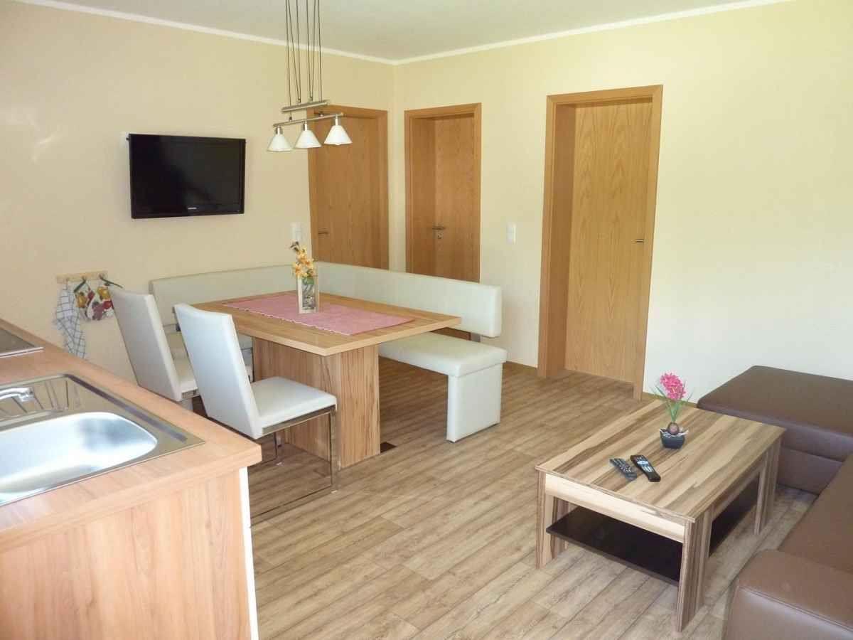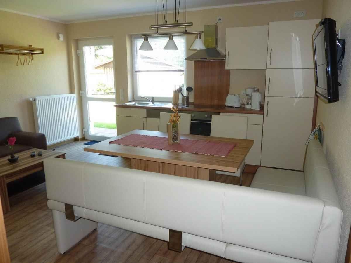 Wohnzimmer mit integrierter Küchenzeile, Esstisch, Couchgarnitur, Flachbild-TV, Radio, WLAN