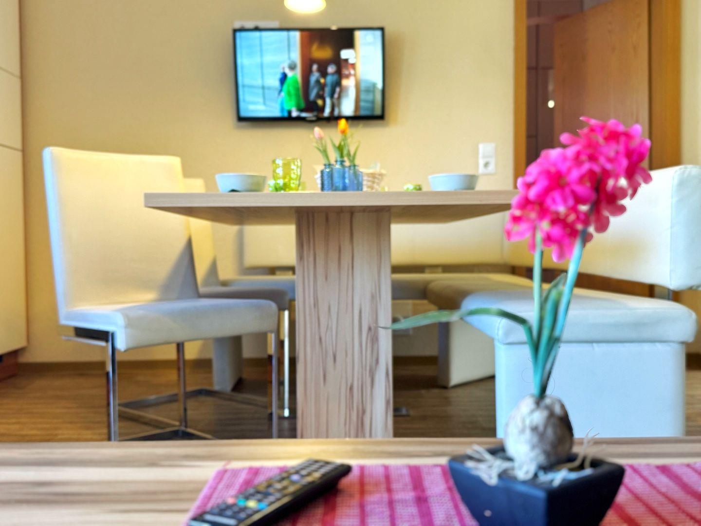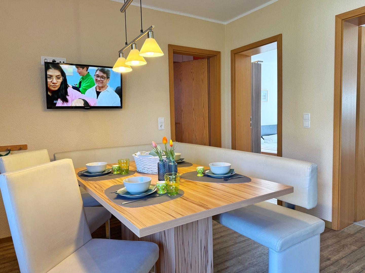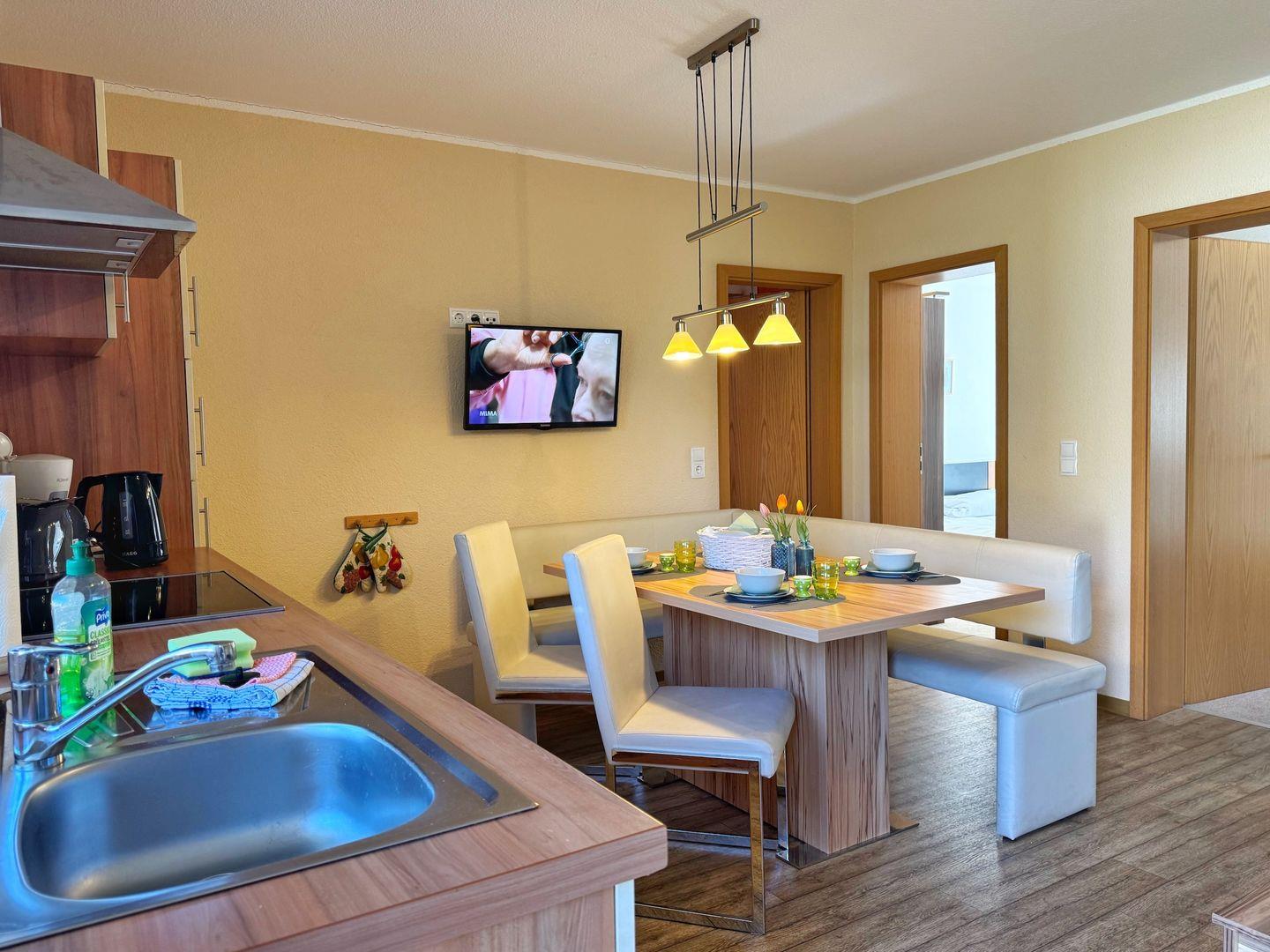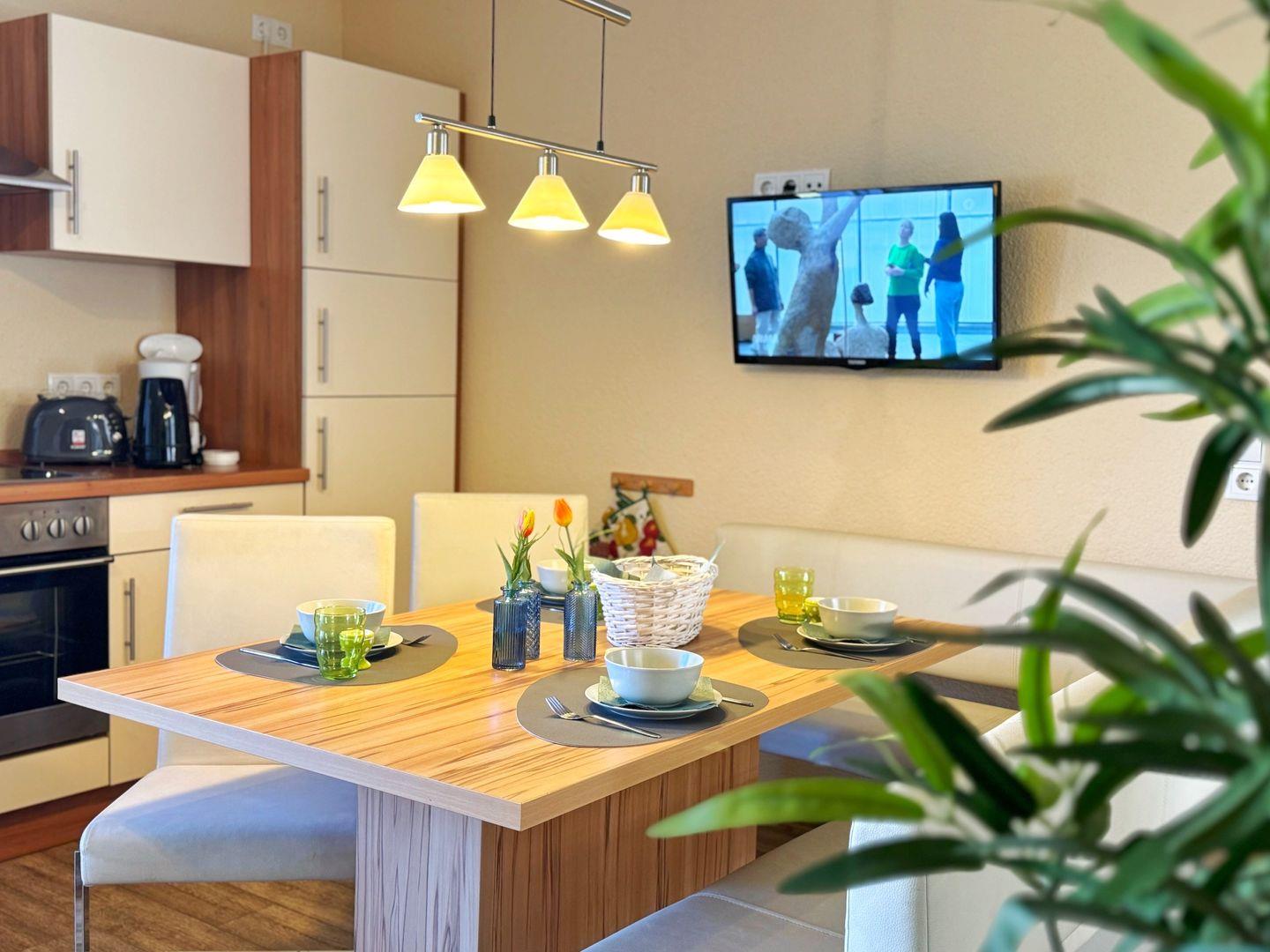 Wohnzimmer mit integrierter Küchenzeile, Esstisch, Couchgarnitur, Flachbild-TV, Radio, WLAN