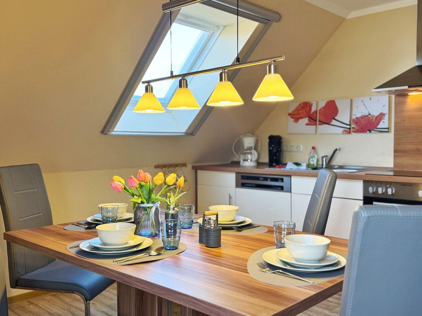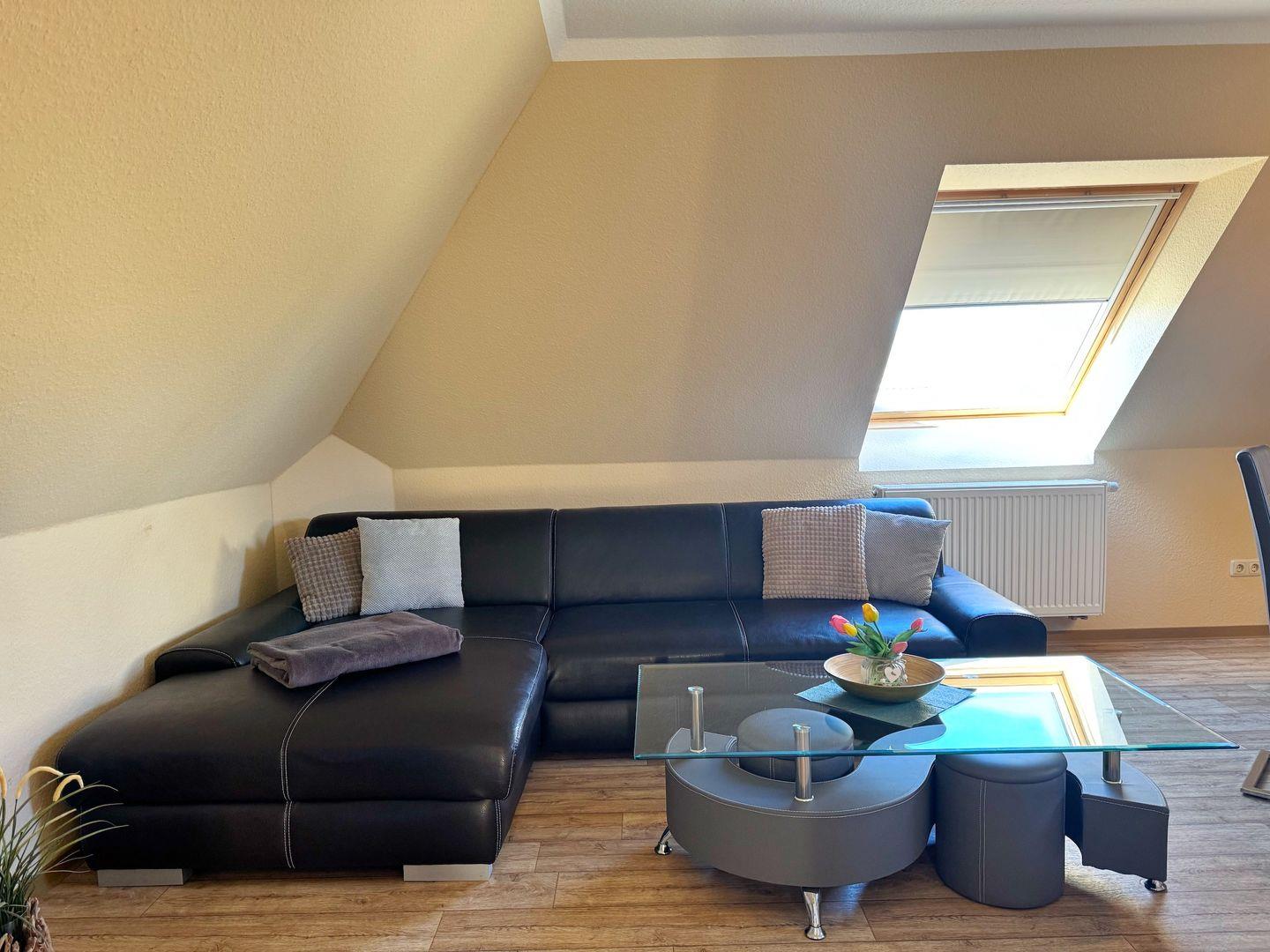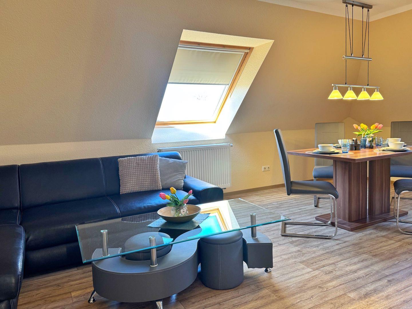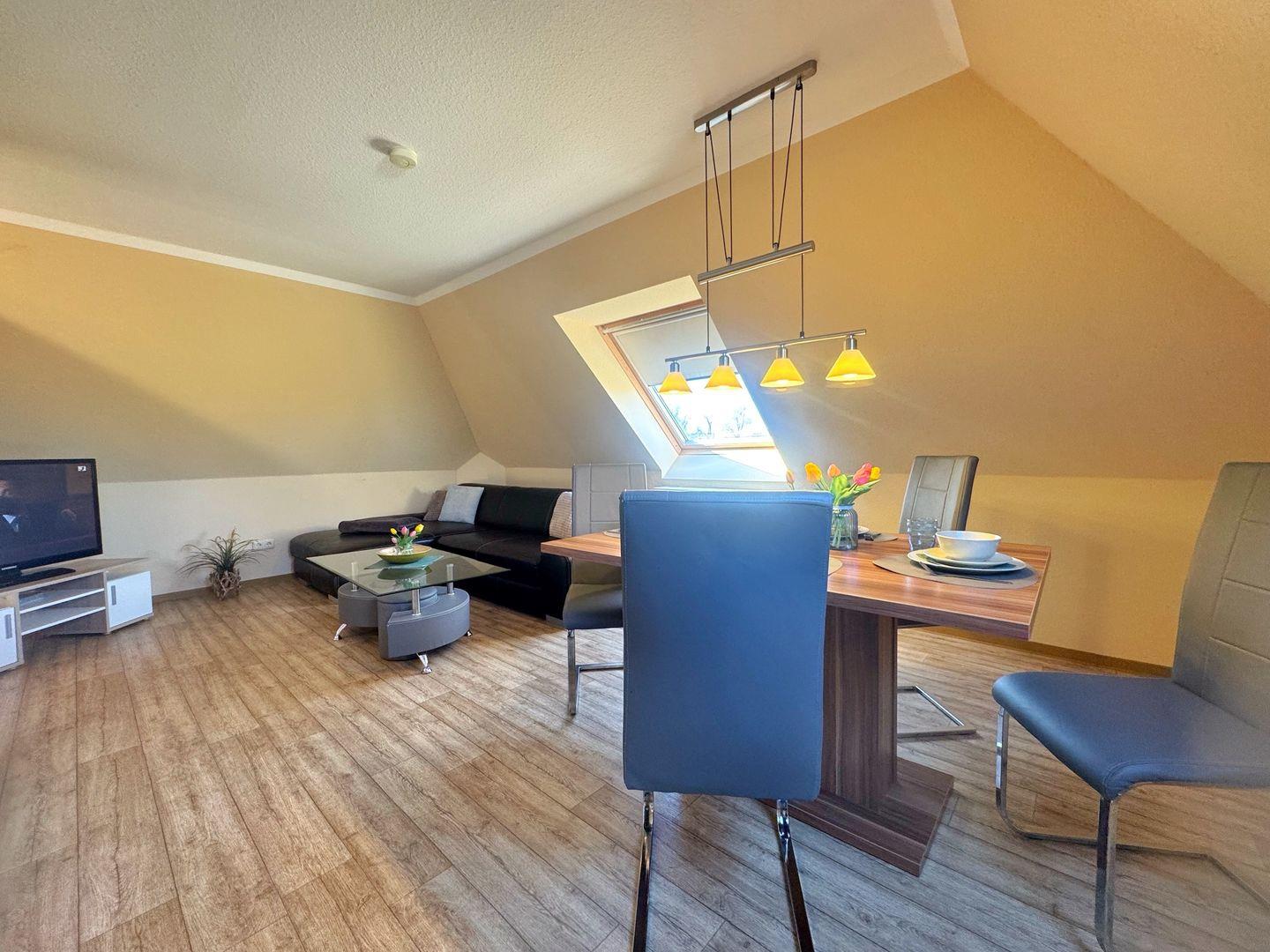Wohnzimmer mit integrierter Küchenzeile, Esstisch, Couchgarnitur, Flachbild-TV, Radio, WLAN