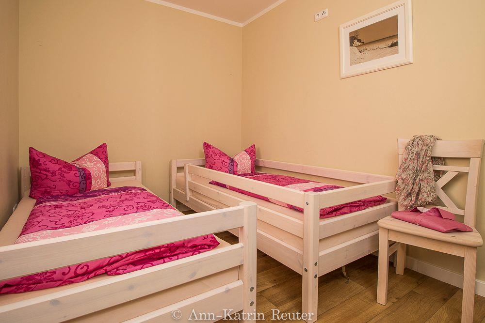 Über einen separaten Eingang gelangen Sie in die untere Ebene der modern eingerichteten Ferienwohnung. Hier finden Sie das Elternschlafzimmer mit Doppelbett, das Kinderschlafzimmer mit 2 Einzelbetten (bzw. mit Doppelstockbetten in den Wohnungen Fischmöwe und Silbermöwe) sowie das Badezimmer mit Dusche und WC.