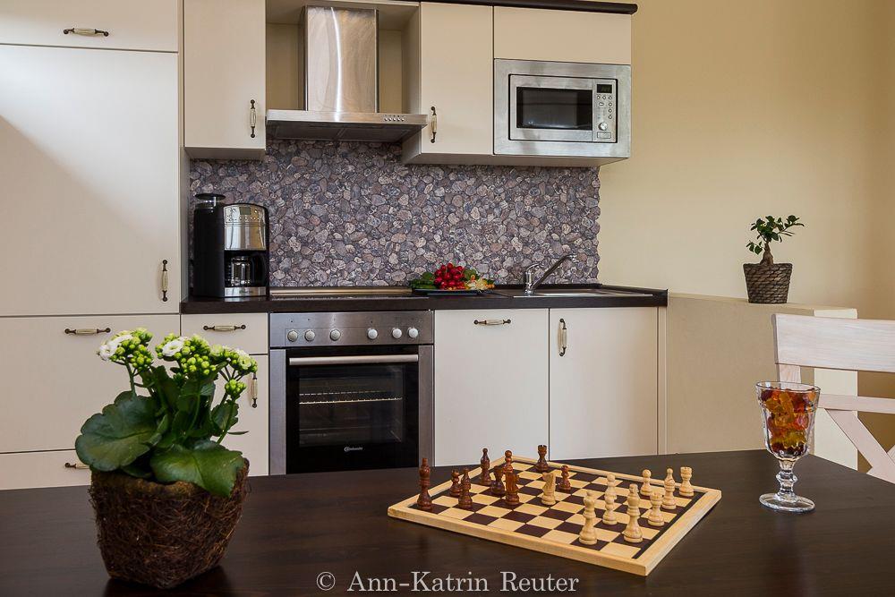 Über eine Treppe gelangen Sie in den großen und modern eingerichteten Wohnbereich mit offener Küche. Eine behagliche Sitzecke mit Flachbildfernseher und Kamin lädt zum Verweilen ein. In der komplett ausgestatteten Küchenzeile finden Sie unter anderem einen Ceranherd mit Backofen, eine Geschirrspülmaschine sowie eine Mikrowelle.
