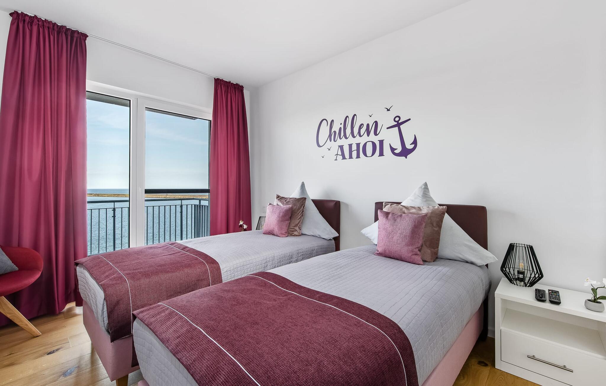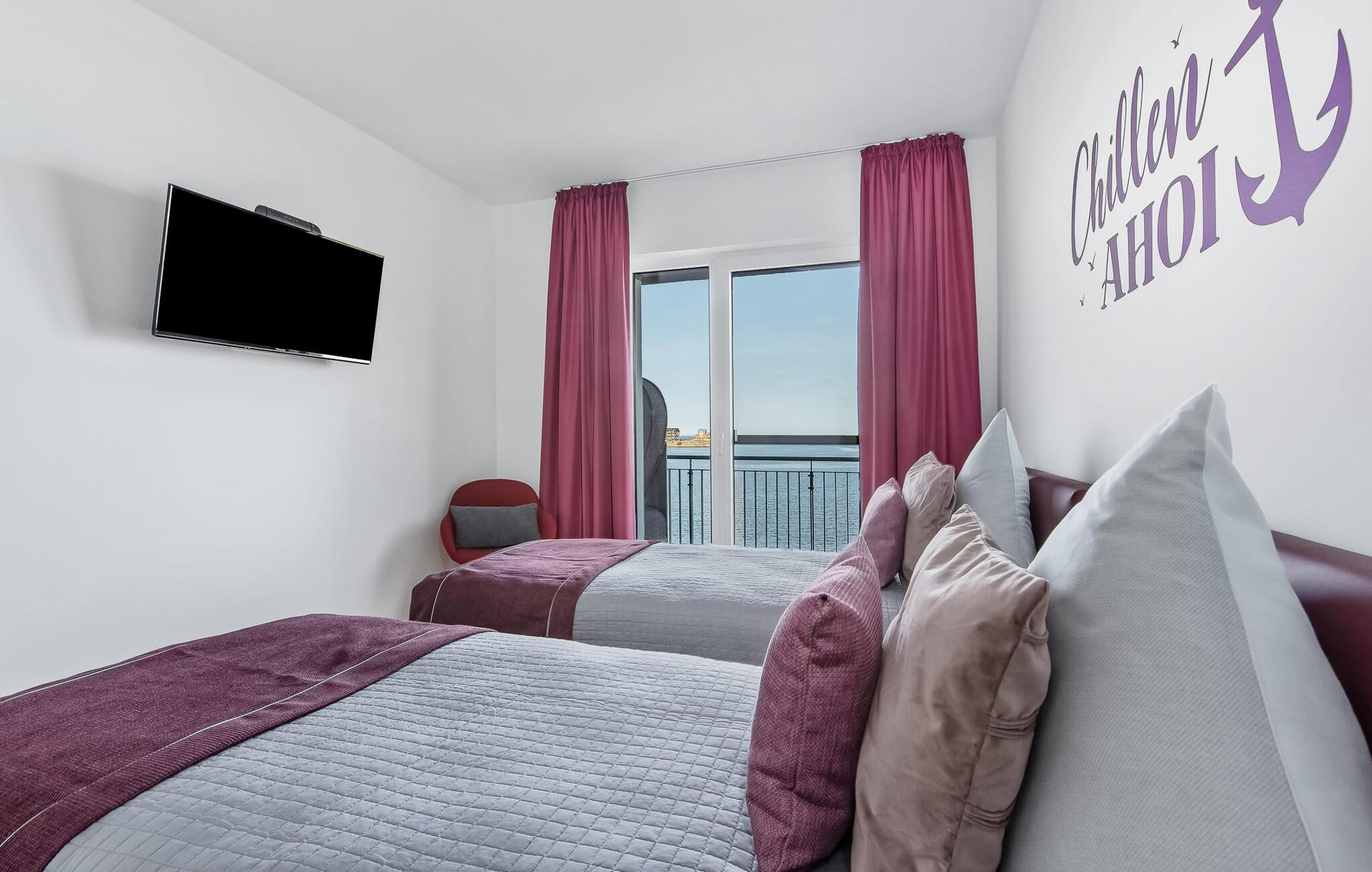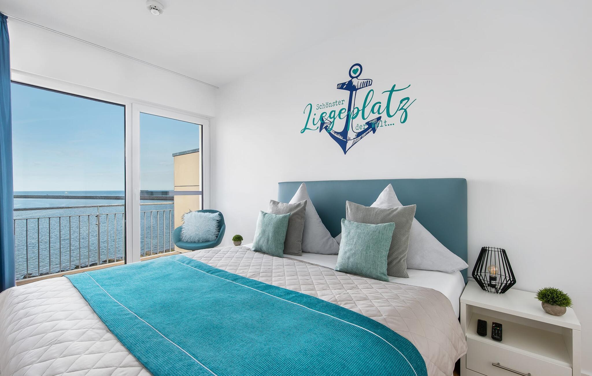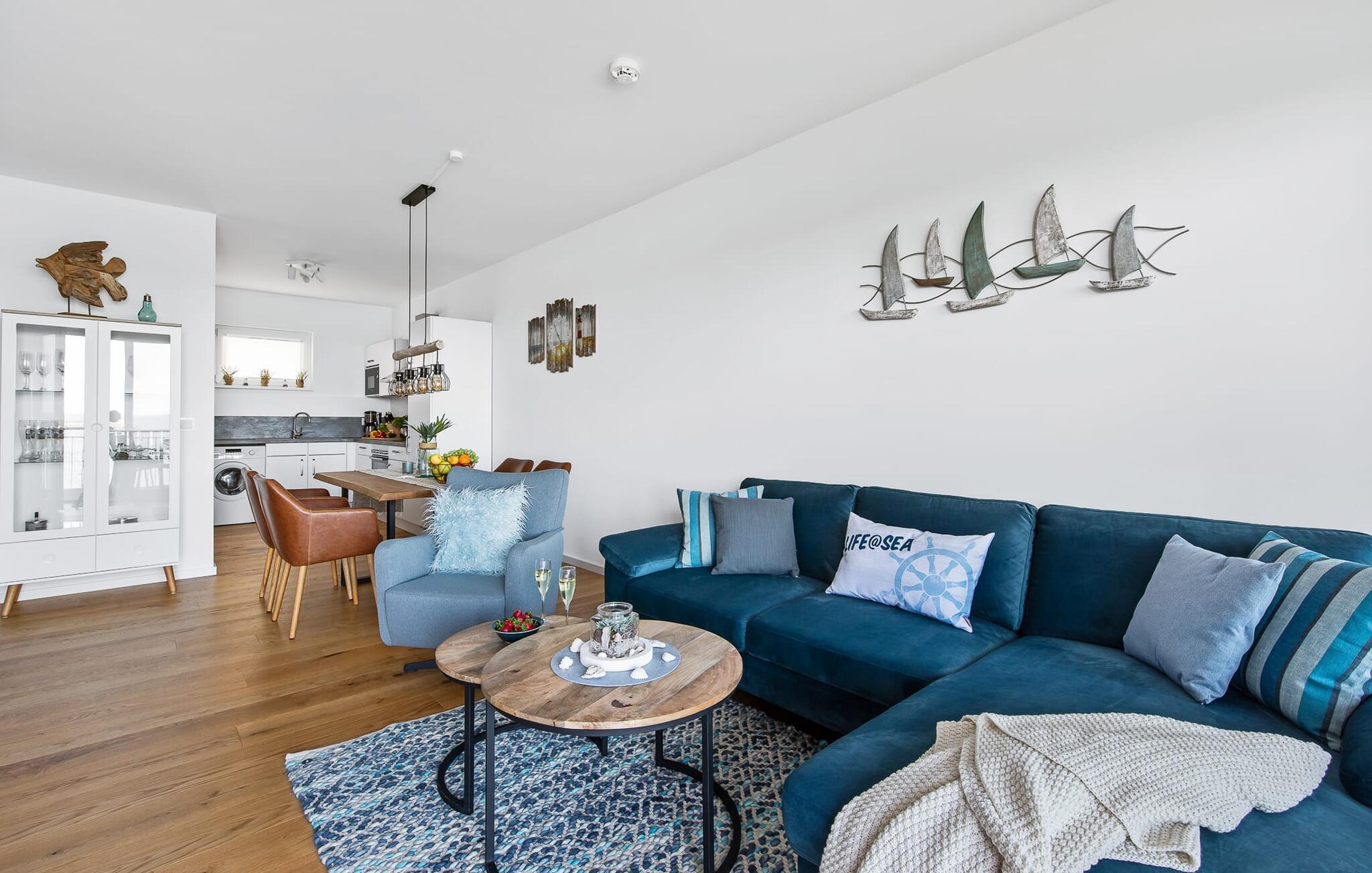 Die Ferienwohnung ist hochwertig ausgestattet, in sich barrierearm, lichtdurchflutet und geschmackvoll eingerichtet. Über den Dingen gelegen lassen sich vorbeifahrende Segelschiffe bei der Hafeneinfahrt aus dem kompletten Wohn- und Essbereich und dem Balkon aus beobachten. Zusätzliches Entertainment bietet das Telekom Home Entertainment Programm auf dem Flatscreen-TV im Wohnzimmer und auf zwei weiteren TV in den Schlafzimmern.