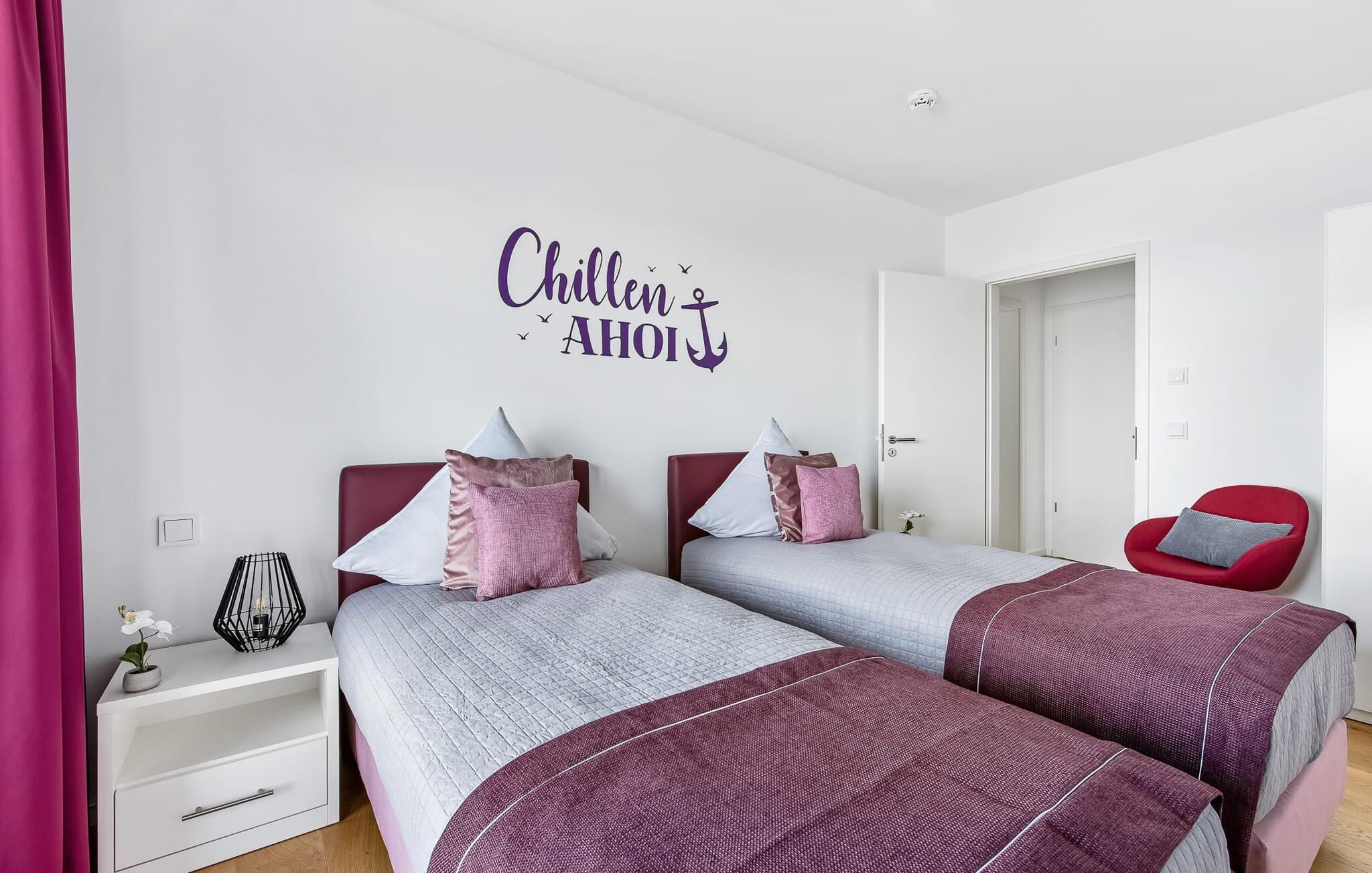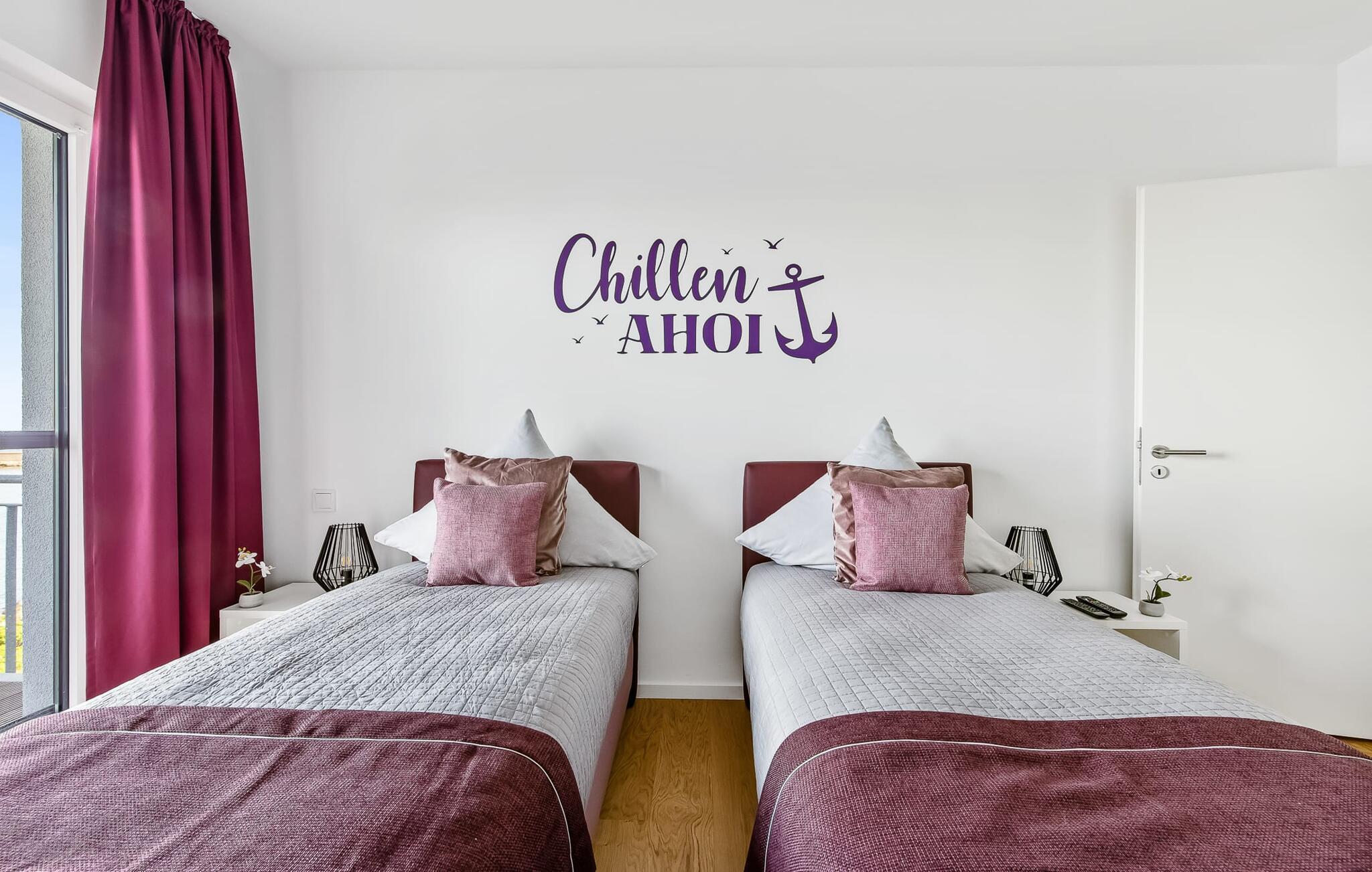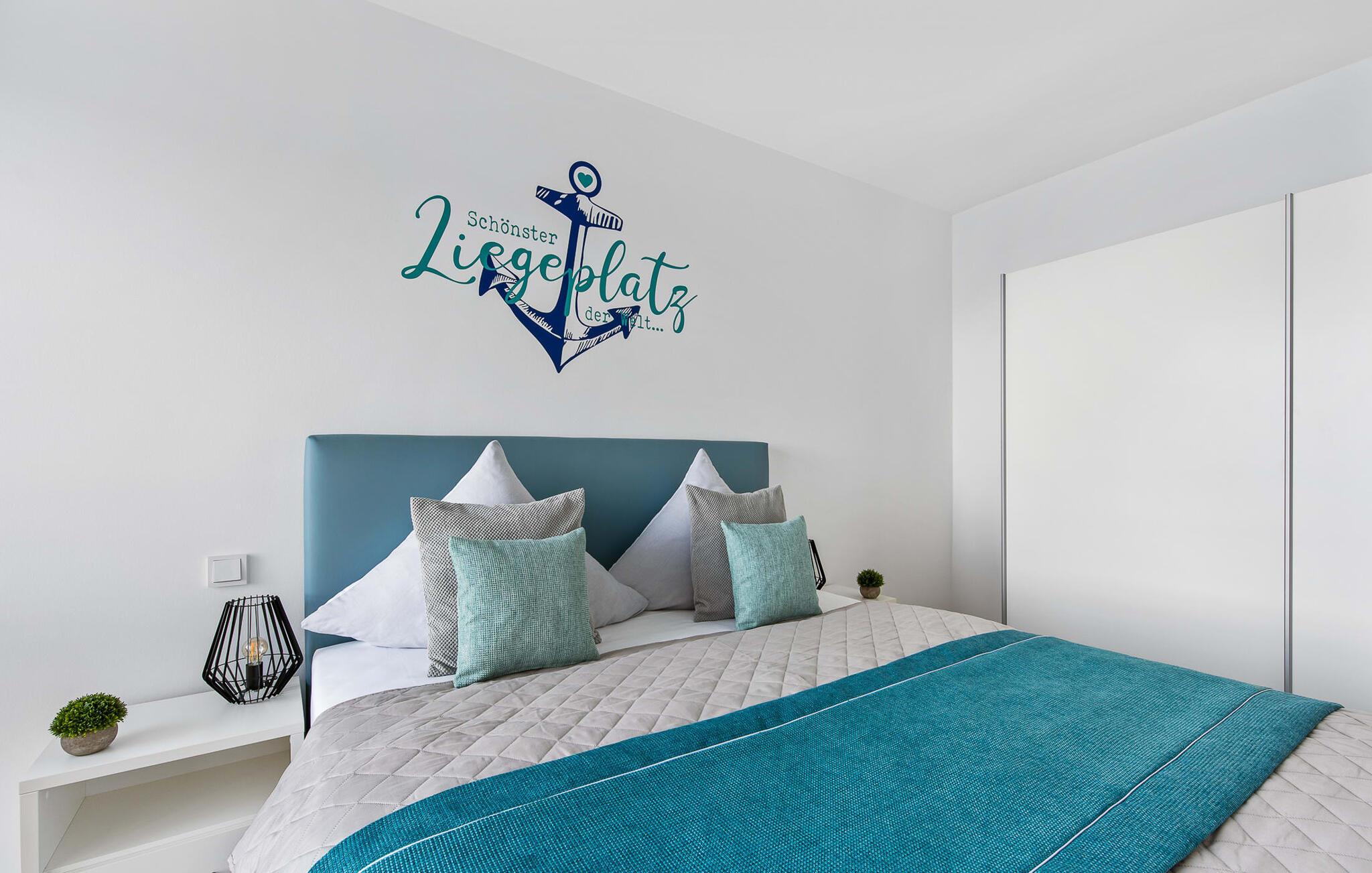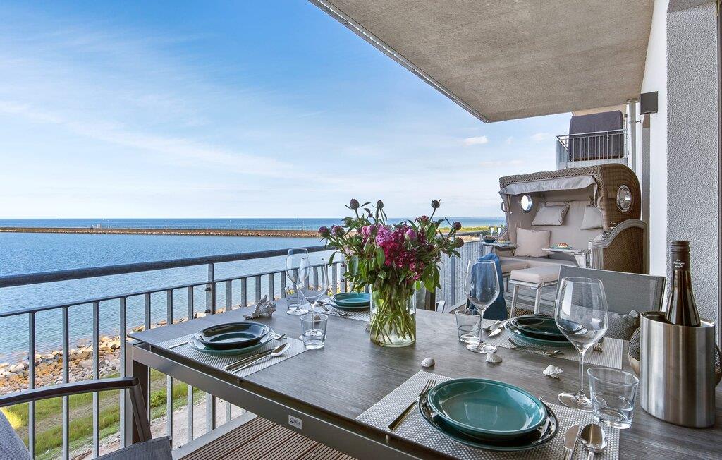Die Ferienwohnung ist hochwertig ausgestattet, in sich barrierearm, lichtdurchflutet und geschmackvoll eingerichtet. Über den Dingen gelegen lassen sich vorbeifahrende Segelschiffe bei der Hafeneinfahrt aus dem kompletten Wohn- und Essbereich und dem Balkon aus beobachten. Zusätzliches Entertainment bietet das Telekom Home Entertainment Programm auf dem Flatscreen-TV im Wohnzimmer und auf zwei weiteren TV in den Schlafzimmern.