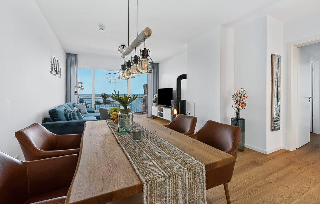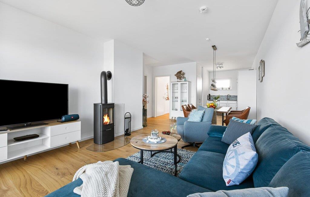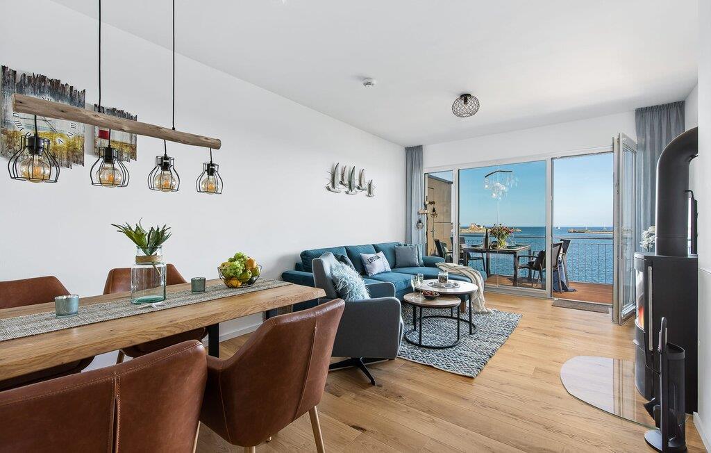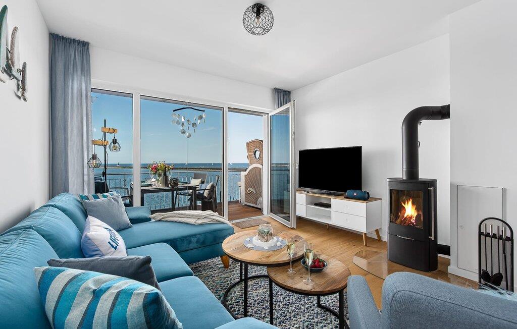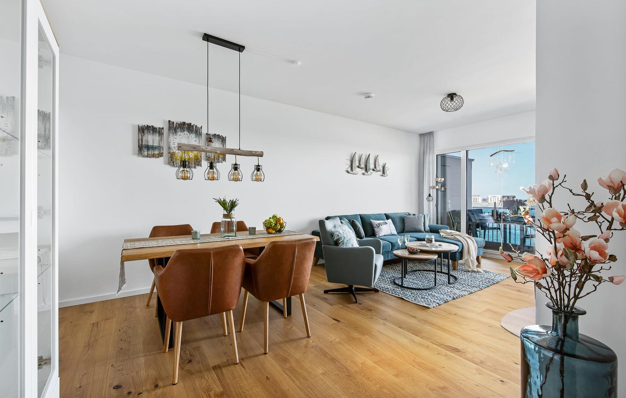 Die Ferienwohnung ist hochwertig ausgestattet, in sich barrierearm, lichtdurchflutet und geschmackvoll eingerichtet. Über den Dingen gelegen lassen sich vorbeifahrende Segelschiffe bei der Hafeneinfahrt aus dem kompletten Wohn- und Essbereich und dem Balkon aus beobachten. Zusätzliches Entertainment bietet das Telekom Home Entertainment Programm auf dem Flatscreen-TV im Wohnzimmer und auf zwei weiteren TV in den Schlafzimmern.