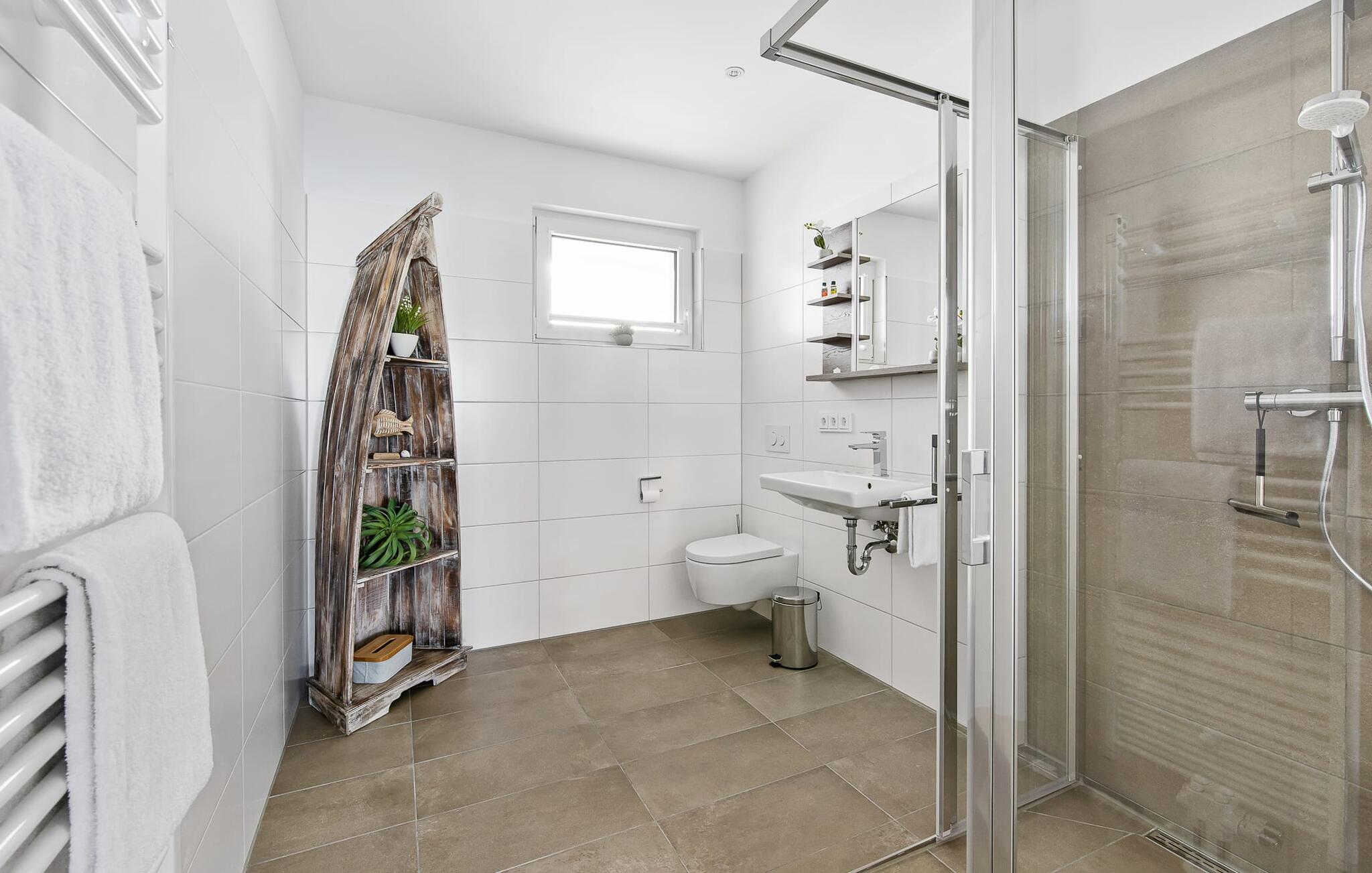 Das Duschbad verfügt über eine große bodengleiche Dusche.