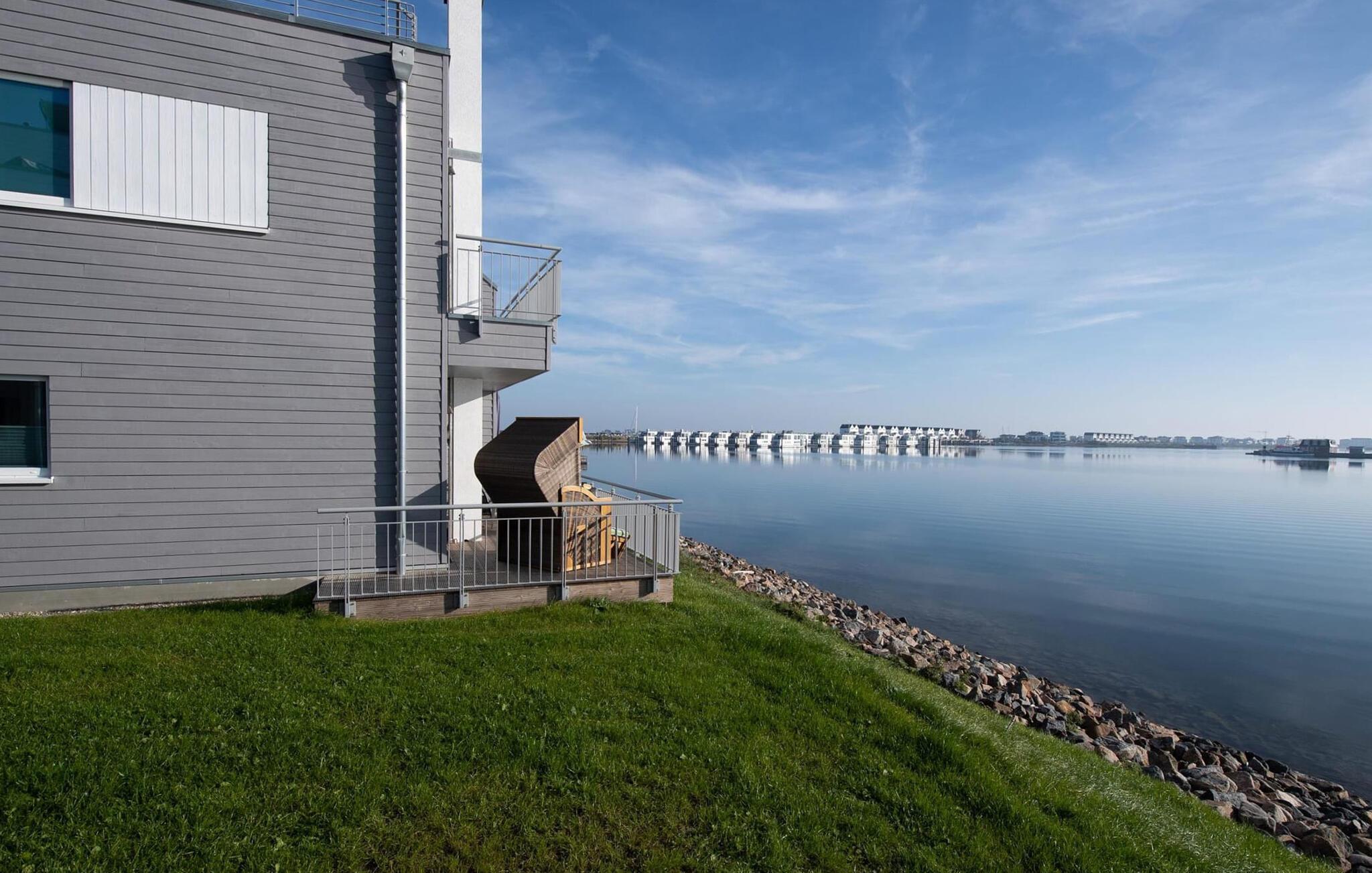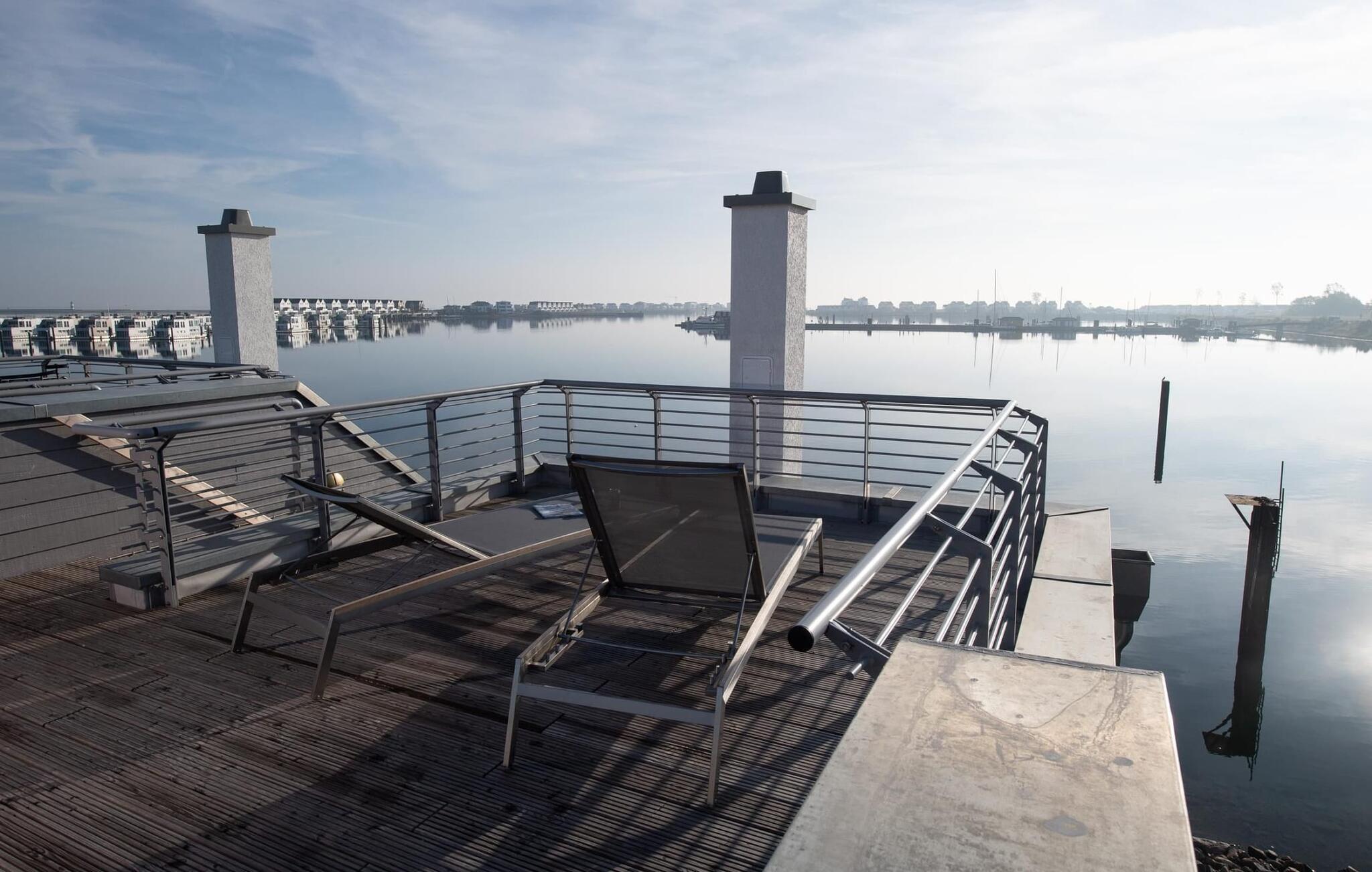 Der Blick fällt durch bodentiefe Panorama Fensterfronten auf wunderschöne Wasserkulisse. Auf jeder Ebene verfügt das Lillehuus über eine Terrasse mit Hafenblickausgestattet mit hochwertigen Terrassenmöbeln, Strandkorb, Lounge Garnitur und zwei Relax Liegen. Das Highlight: Die große 360° Dachterrasse mit ganztags Sonne.