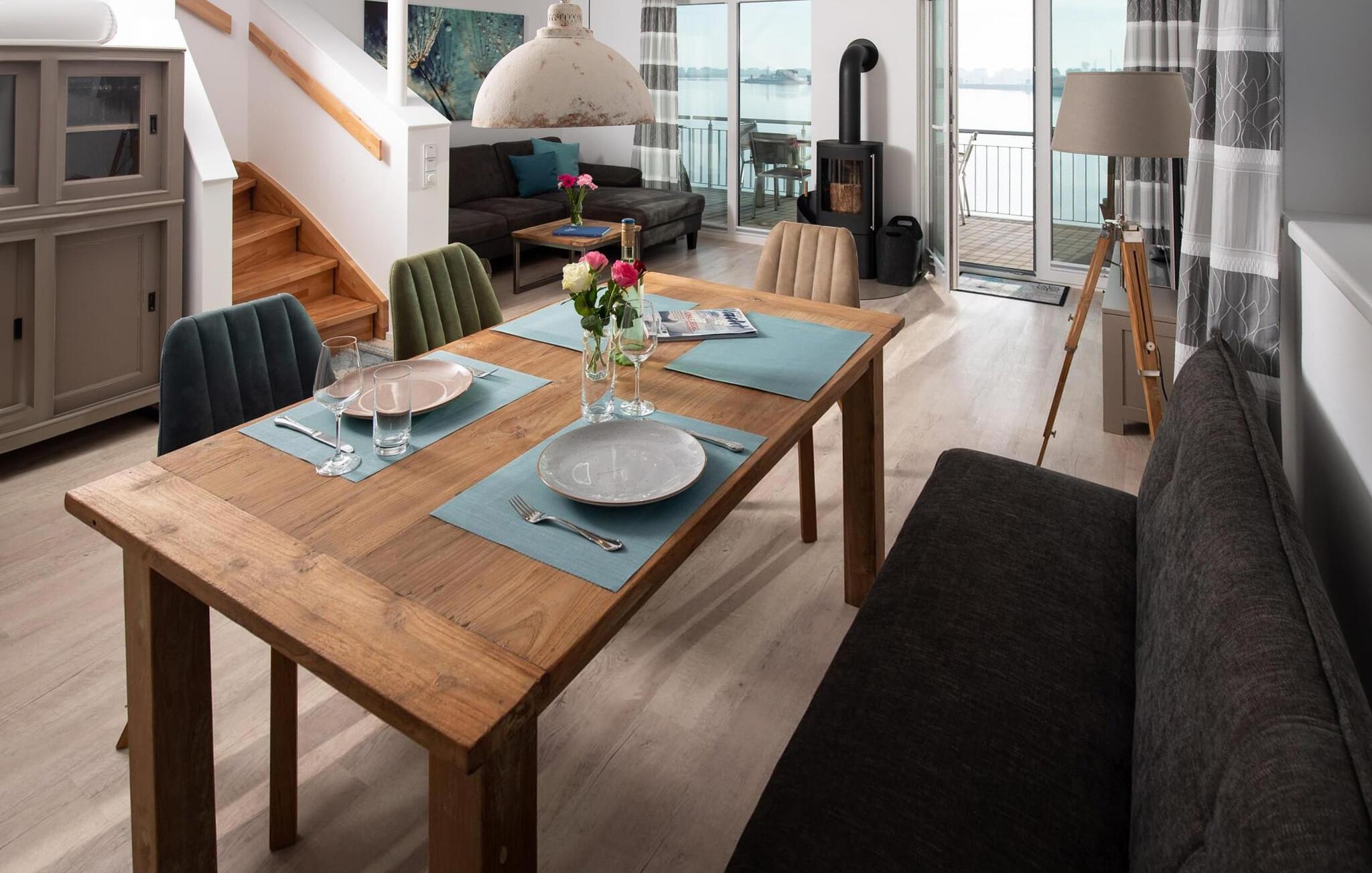 Der offen gestaltete, lichtdurchflutete Wohn- und Essbereich befindet sich im Erdgeschoss des Ferienobjekts. Von hier aus gelangt man direkt auf die angrenzende Terrasse. Ob bei einem gemeinsamen Grillabend mit Weber-Elektrogrill oder gemütlich vorm KaminHafenkino ist hier garantiert. Die Küche lässt keine Wünsche offenrundum ausgestattet erlaubt diese vollen Urlaubskomfort. Frühstück auf der Terrasse direkt am Wasser bei traumhaften Sonnenaufgängendas ist Urlaub!