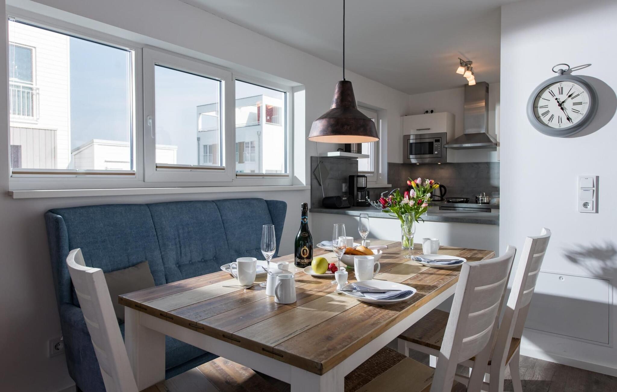 Der offene Wohn-/Essbereich im Erdgeschoss mit bodentiefen Fenstern, Sitzecke, Holzofen und einem Esstisch für sechs Personen ist das Herzstück des Hauses. Durch die Fensterfront des Wohnzimmers können Segelschiffe beobachtet werden, während die Terrasse herrliche Sonnenuntergänge bietet. Die gut ausgestattete Küche lässt keine Wünsche offen und sorgt für vollen Urlaubskomfort.