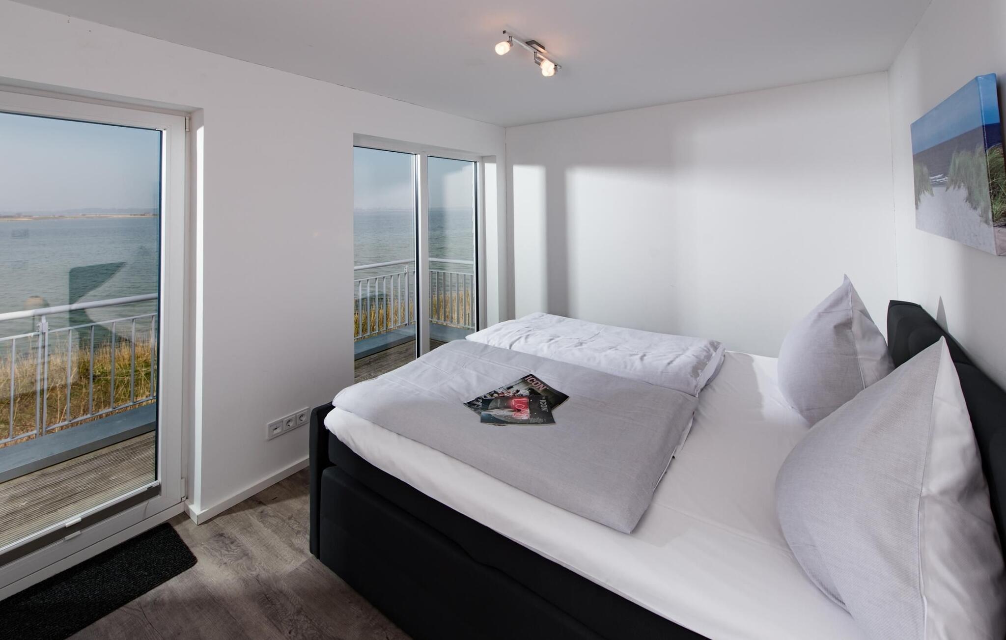 Zwei Schlafzimmer im Obergeschoss bieten bis zu vier Erwachsenen Platz zum Schlafen und Träumen. Das Hauptschlafzimmer verfügt über einen Blick auf das Wasser und ein Boxspringbett sowie einen weiteren Balkon auf der Schleisseite. Ein zusätzlicher Schlafbereich steht im Wohnzimmer auf einer Schlafcouch zur Verfügung.