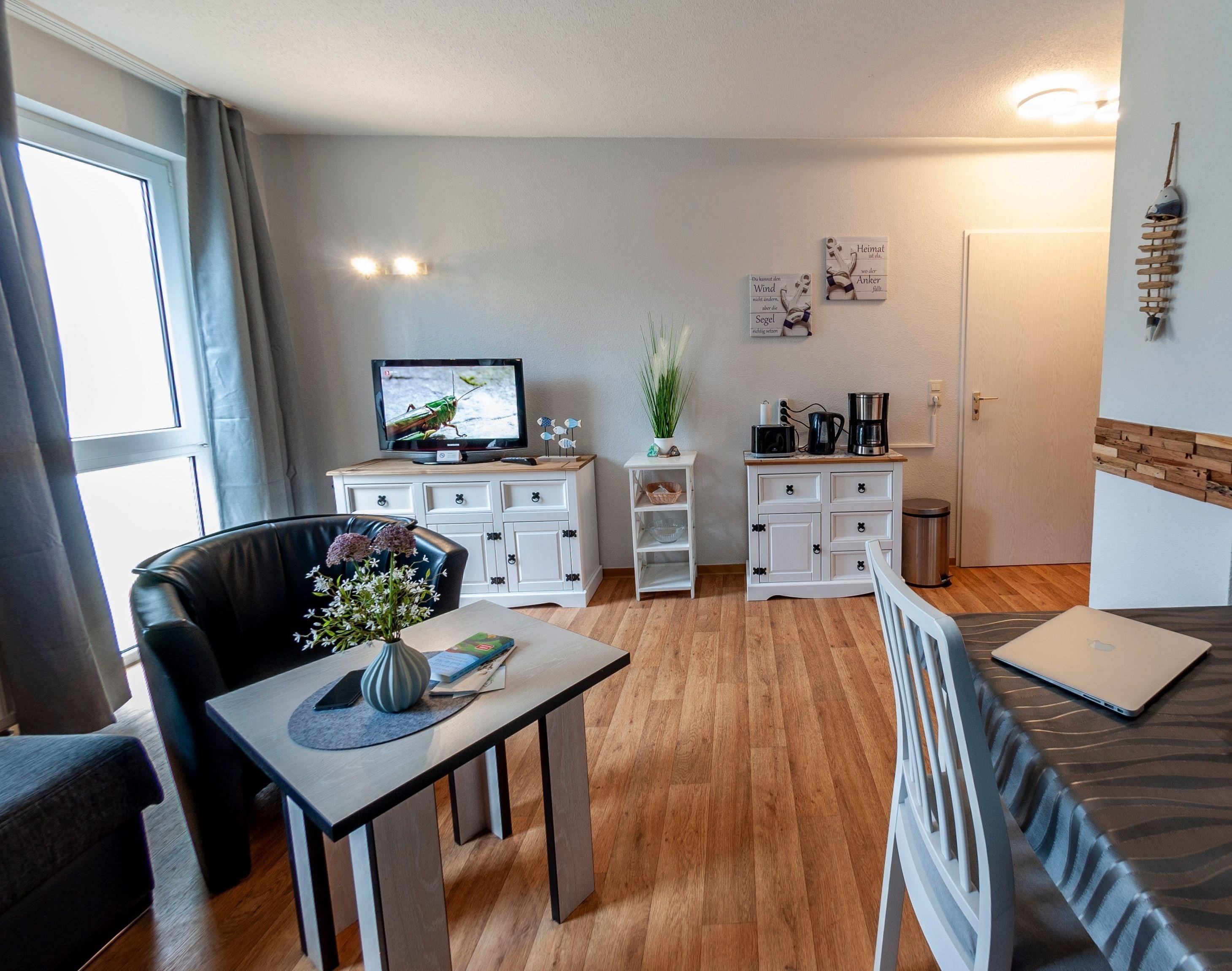 Die ca. 40 qm große Ferienwohnung bietet Platz für bis zu 3 Personen und wurde im Januar 2023 renoviert. Das hell und freundlich eingerichtete Wohnzimmer verfügt über eine ausklappbare Schlafcouch, einen Esstisch mit Stühlen und einem internetfähigem Kabel Flachbild TV. Natürlich steht Ihnen freies WLAN zur Verfügung.