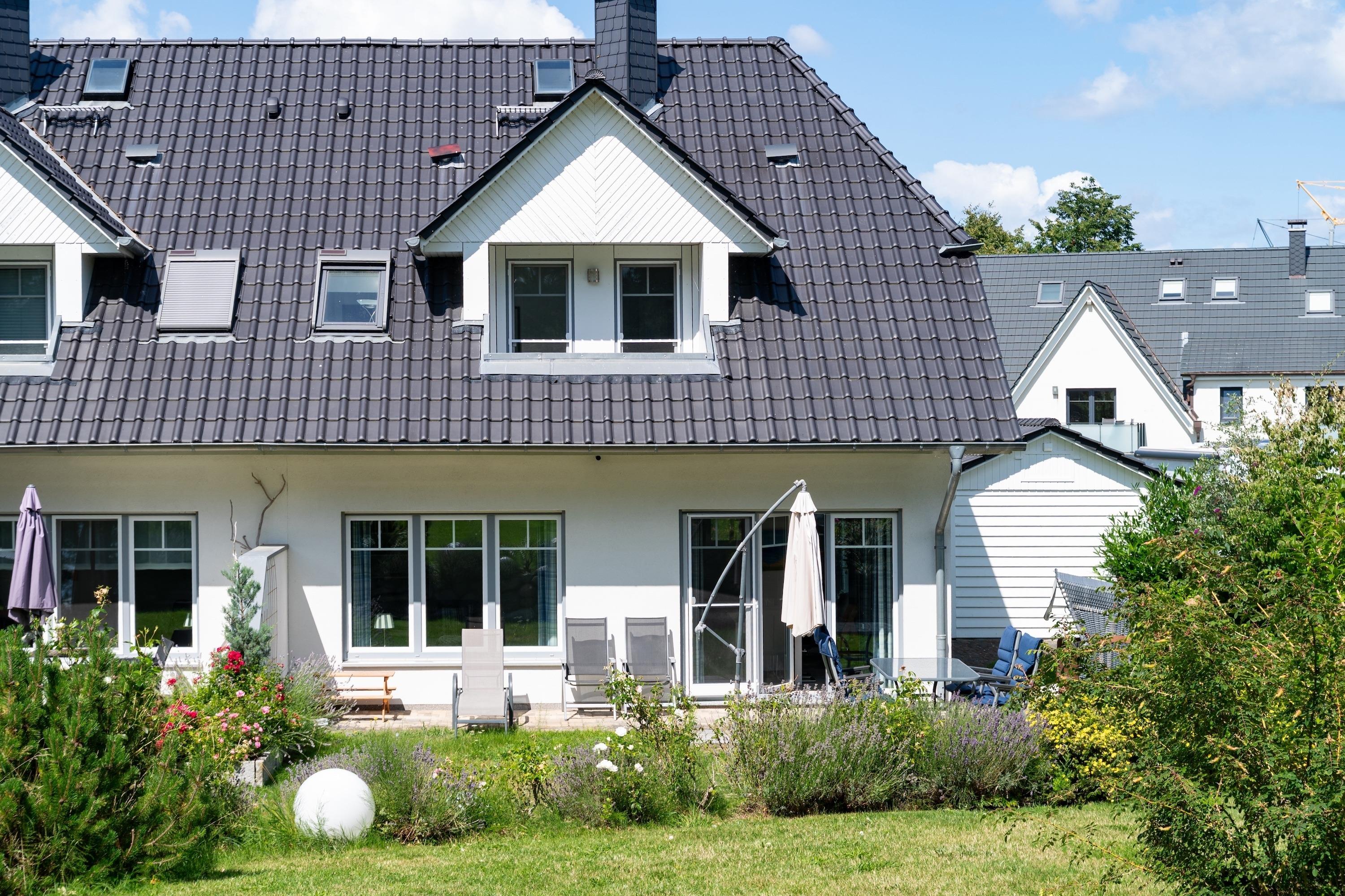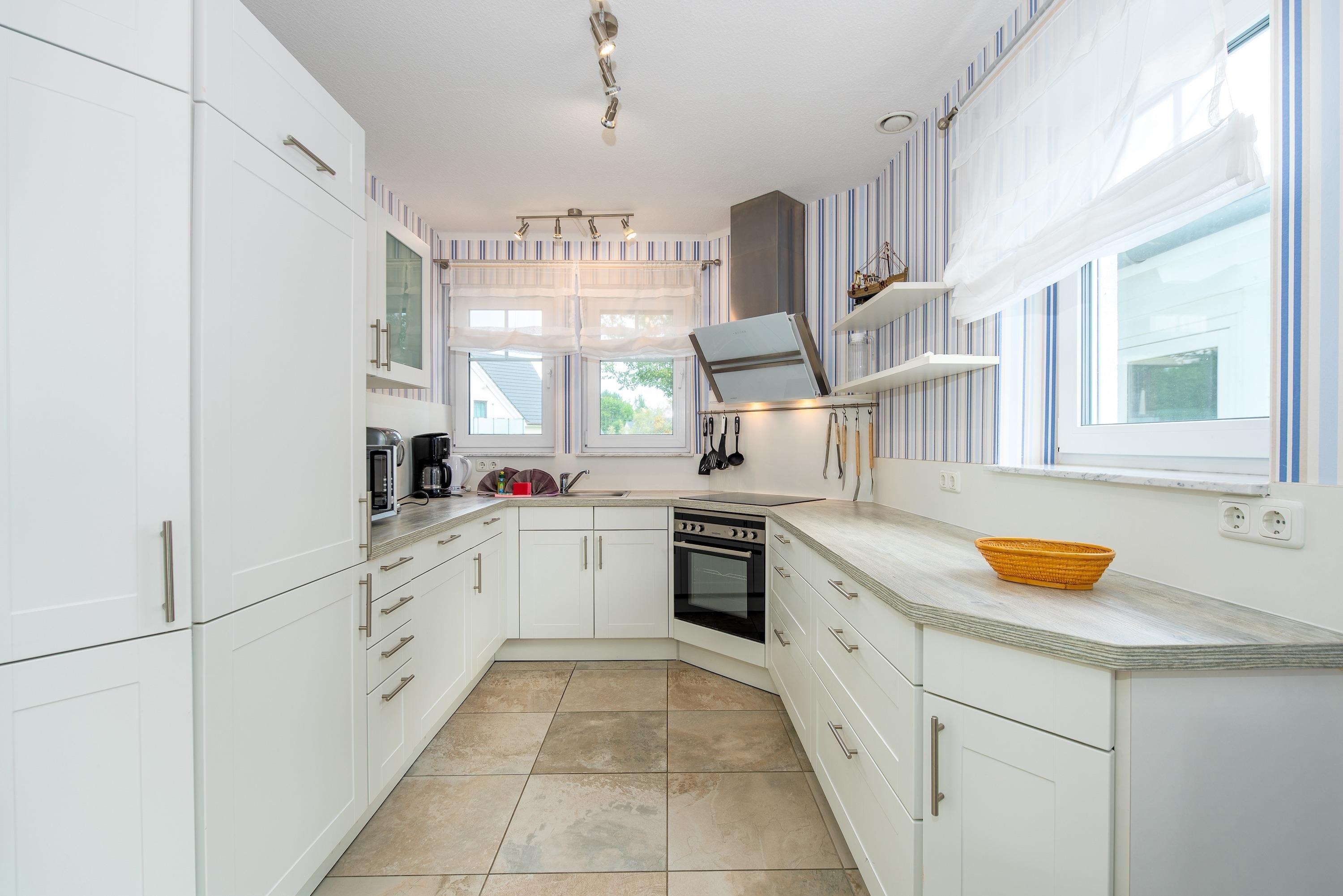 Das Haus erstreckt sich über zwei Etagen und empfängt Sie mit einem großzügigen, hellen Eingangsbereich, Garderobe, Abstellraum und Gäste-WC. Über eine Glastür gelangen Sie in den offenen Wohn- und Kochbereich. Die große, U-förmige Küche ist voll ausgestattet – vom Cerankochfeld über Geschirrspüler bis zur Kaffeemaschine – und lädt zum gemeinsamen Kochen ein.