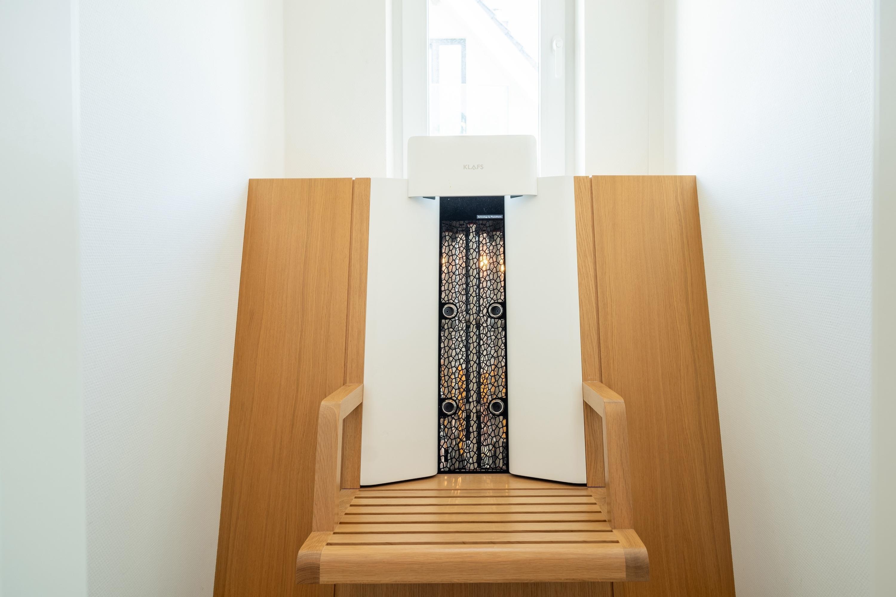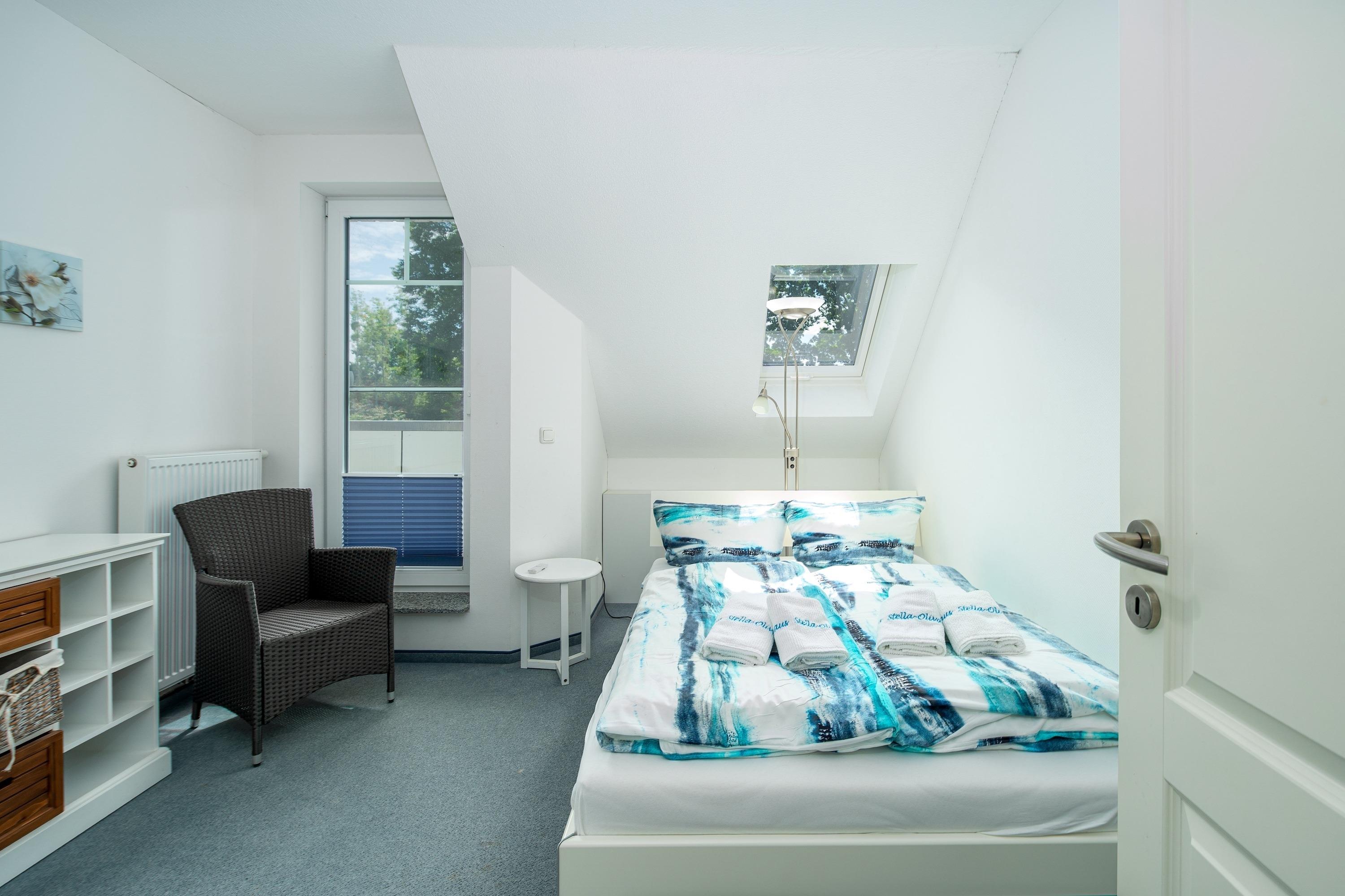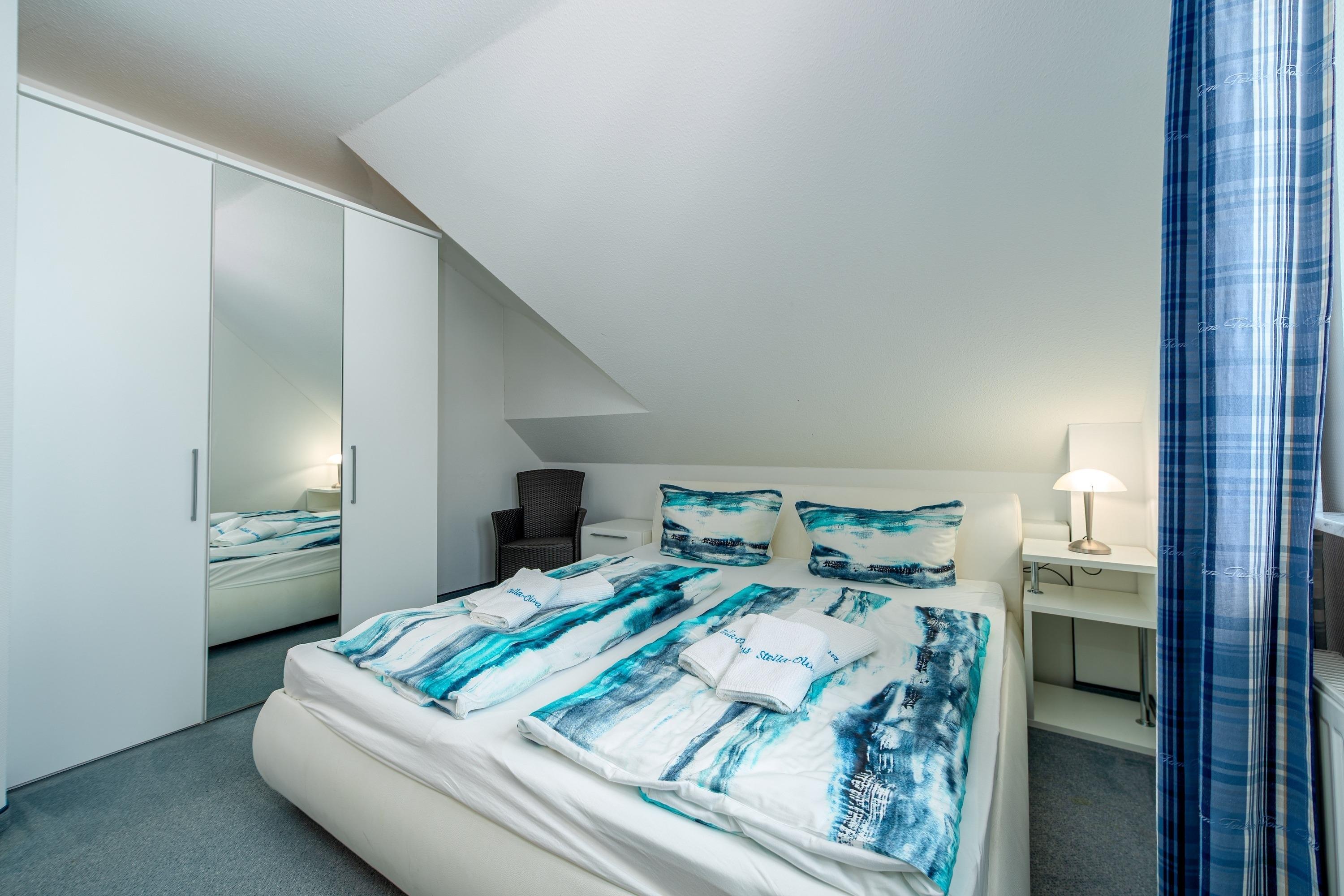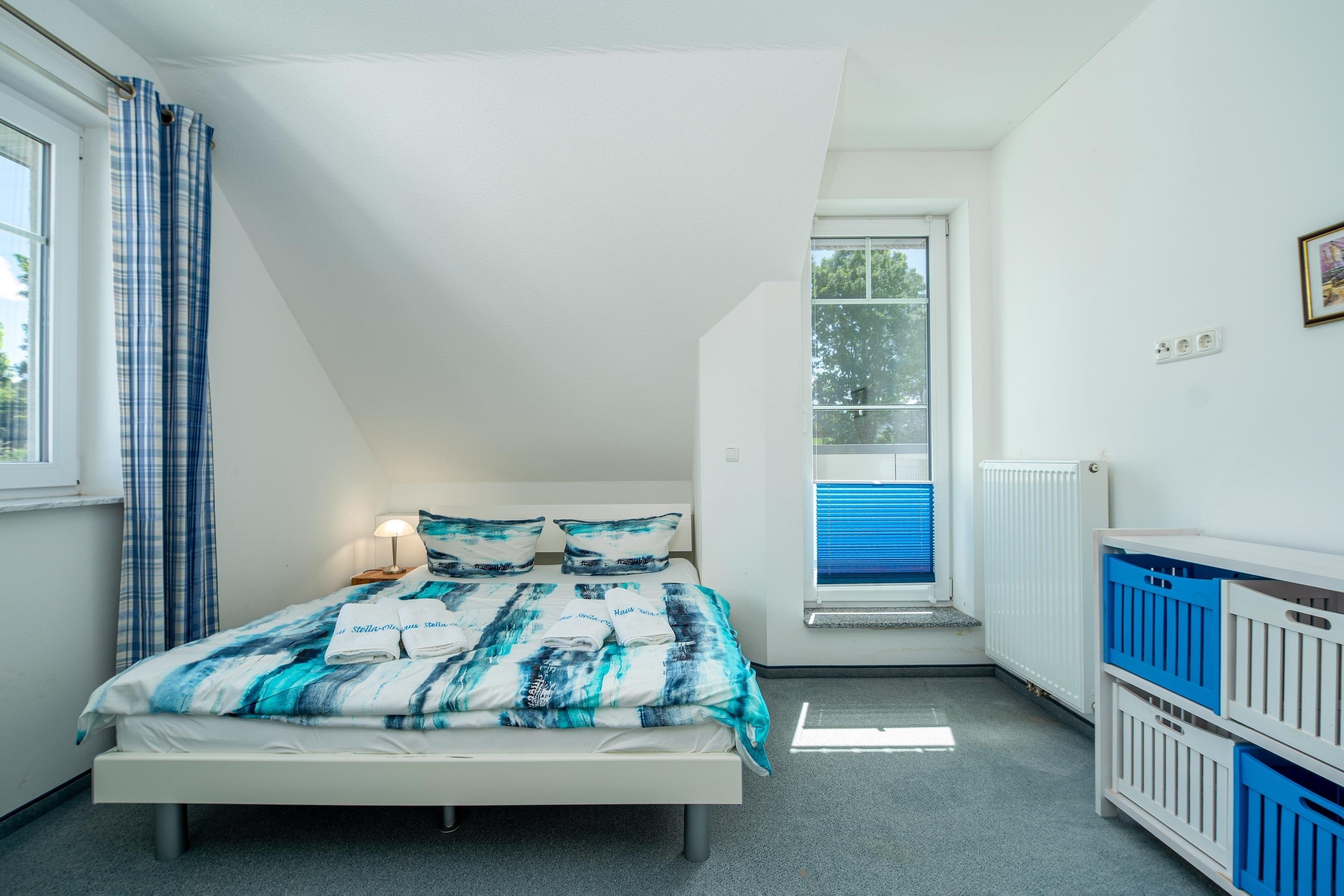 Über die Wendeltreppe erreichen Sie das Obergeschoss mit drei Schlafzimmern: zwei davon mit Doppelbetten (180x200), Fernseher und Kleiderschrank, das dritte mit einem 140x200-Bett. Das helle Badezimmer überzeugt mit anthrazitfarbenen Fliesen, Fußbodenheizung, zwei Waschbecken, Dusche und Badewanne – ideal für entspannte Wellnessmomente.