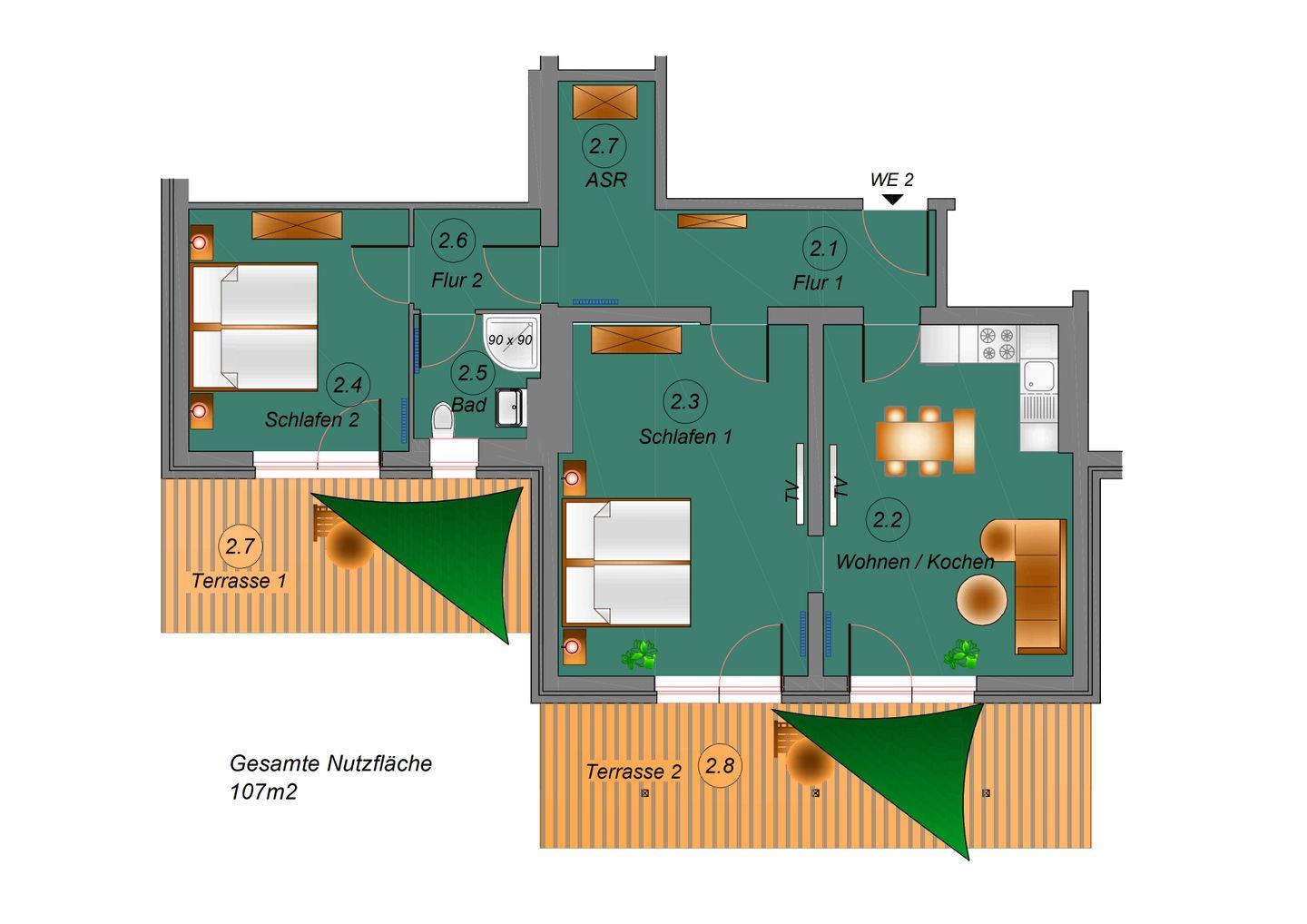 Mit einer voll ausgestatteten, offenen Küche, in der Sie Ihrer Kochkunst freien Lauf lassen können, sind alle Annehmlichkeiten vorhanden! Ob Ceranfeld, Kühlschrank, Mikrowelle oder Geschirrspüler – alles ist darauf ausgelegt, Ihnen den Aufenthalt so angenehm wie möglich zu machen. Und nach einem köstlichen Essen können Sie die laue Ostseeluft auf Ihrer privaten Terrasse genießen und dabei den Blick auf die wunderschöne Umgebung schweifen lassen.