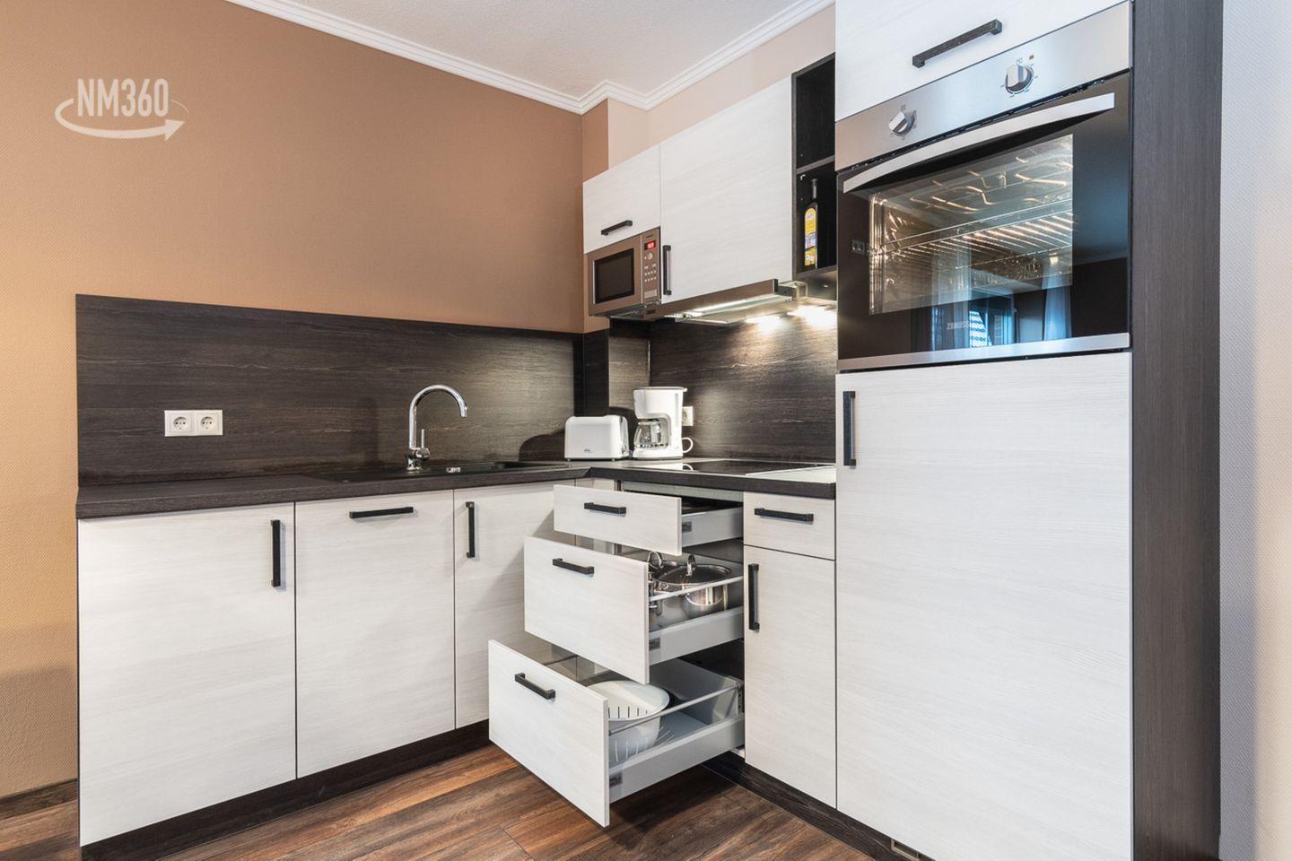 Die Suite TYR überzeugt durch ein geschmackvolles Design und eine hervorragende Ausstattung. Der großzügige Wohn- und Essbereich strahlt einladende Gemütlichkeit aus und ist mit einem komfortablen Sofa sowie einem Esstisch für gesellige Abende ausgestattet. Die offene Küche ist vollständig eingerichtet und lässt keine Wünsche offen. Sie verfügt über moderne Elektrogeräte, wie einen Cerankochfeld, Backofen, Kühlschrank, Spülmaschine, Mikrowelle und eine Kaffeemaschine. Egal, ob Sie sich ein gemütliches Frühstück oder ein festliches Abendessen zubereiten möchten – hier finden Sie alles, was Sie dafür benötigen.