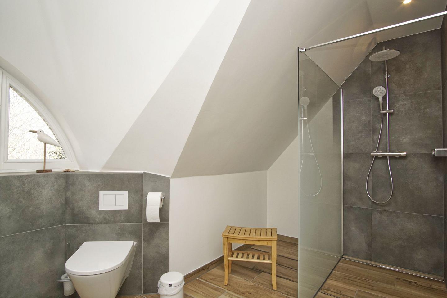 BAD // ein Badezimmer im EG mit bodengleicher Dusche, Sauna, Waschbecken, WC und Fenster, zweites Badezimmer im OG mit bodengleicher Dusche, Waschbecken, WC und Fenster ++