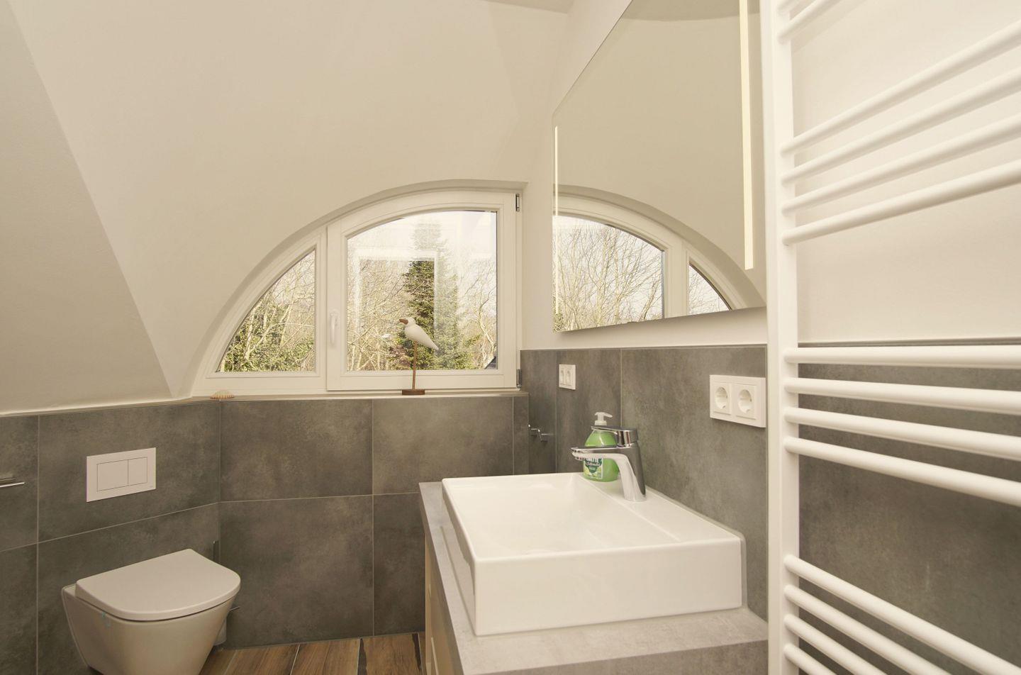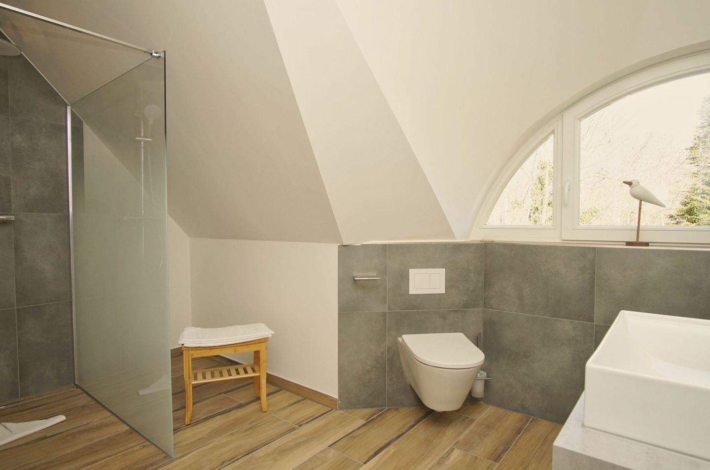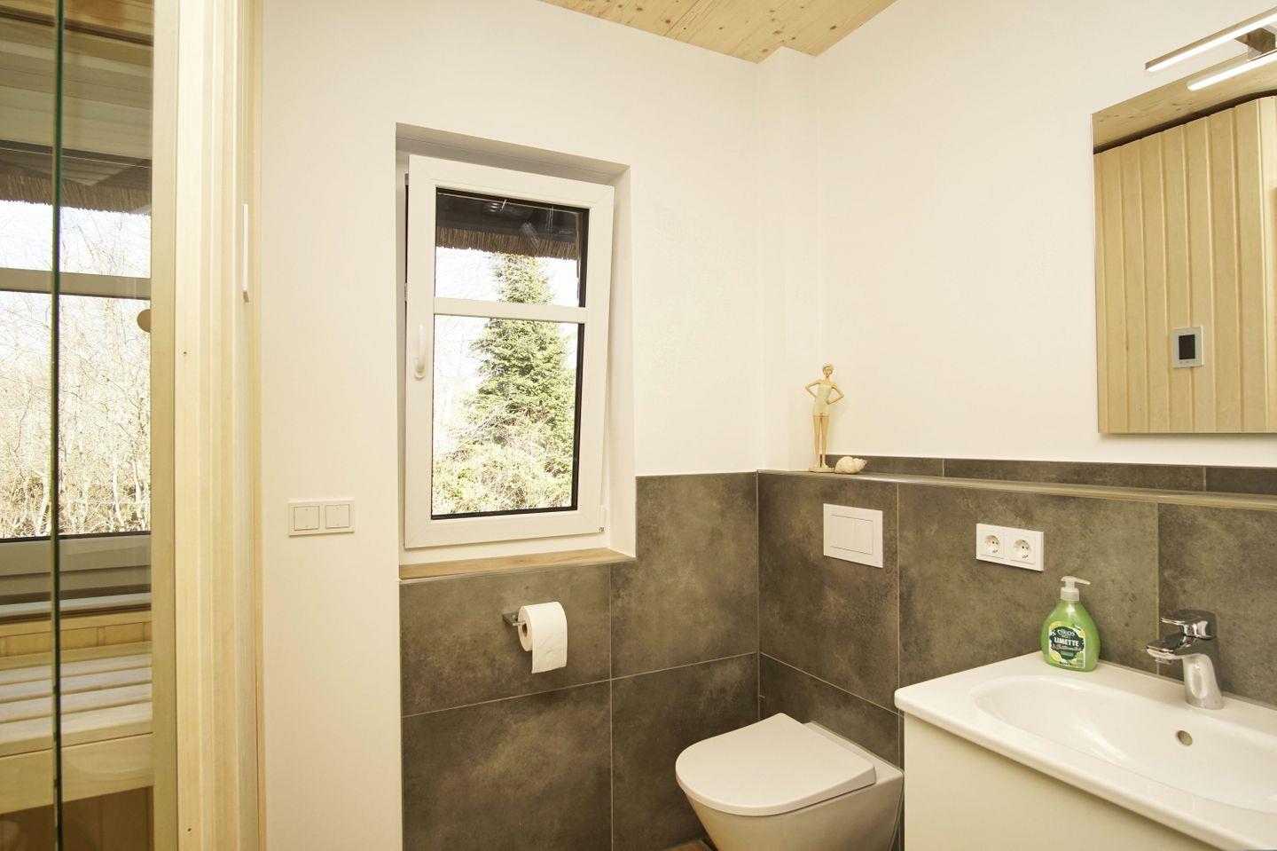 BAD // ein Badezimmer im EG mit bodengleicher Dusche, Sauna, Waschbecken, WC und Fenster, zweites Badezimmer im OG mit bodengleicher Dusche, Waschbecken, WC und Fenster ++