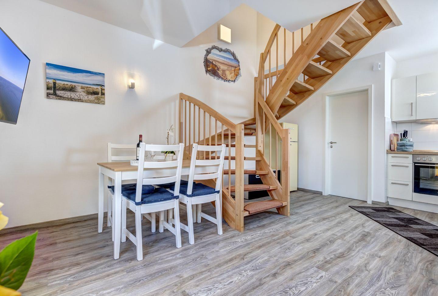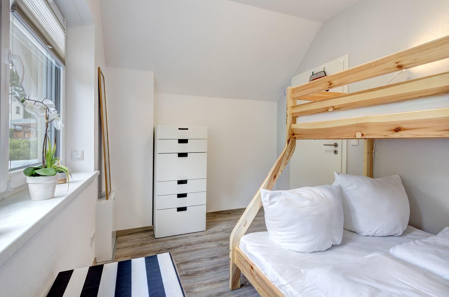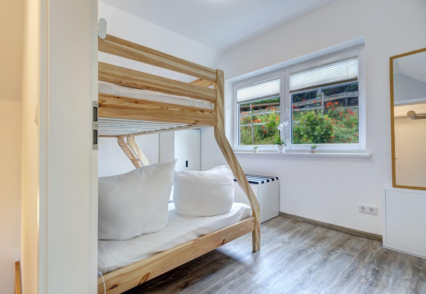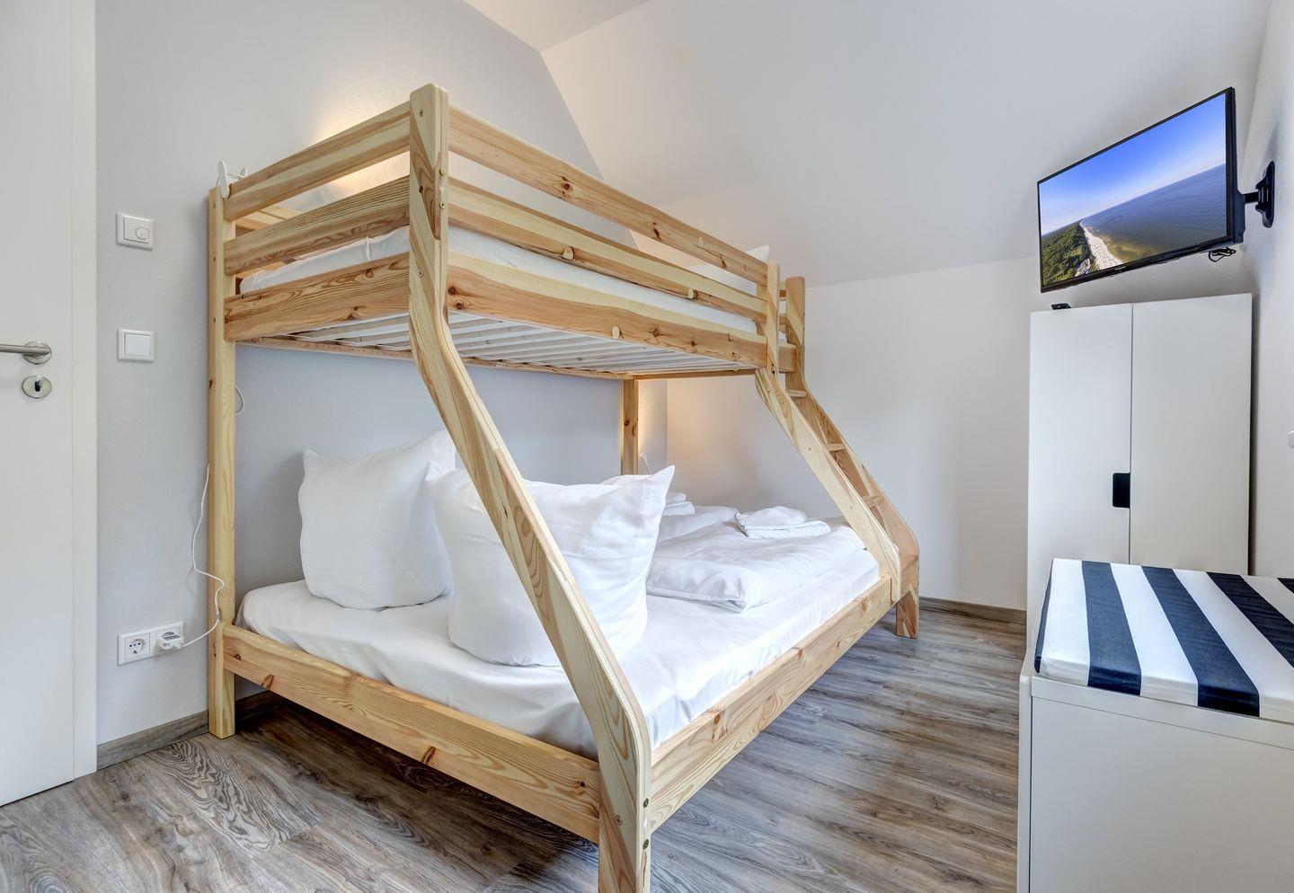 Genießen Sie den lichtdurchfluteten Wohn- und Essbereich mit einer gemütlichen Sitzgruppe, der Ihnen ein besonderes Urlaubsambiente bietet. Direkter Zugang zur Terrasse ermöglicht entspannte Momente im Freien. Die separate, modern und vollausgestattete Küche lässt keine Wünsche offen. Zwei vollwertige Schlafzimmer sorgen für erholsame Nächte: das erste mit komfortablem Doppelbett und das zweite mit einem Hochbett für drei Personen.
