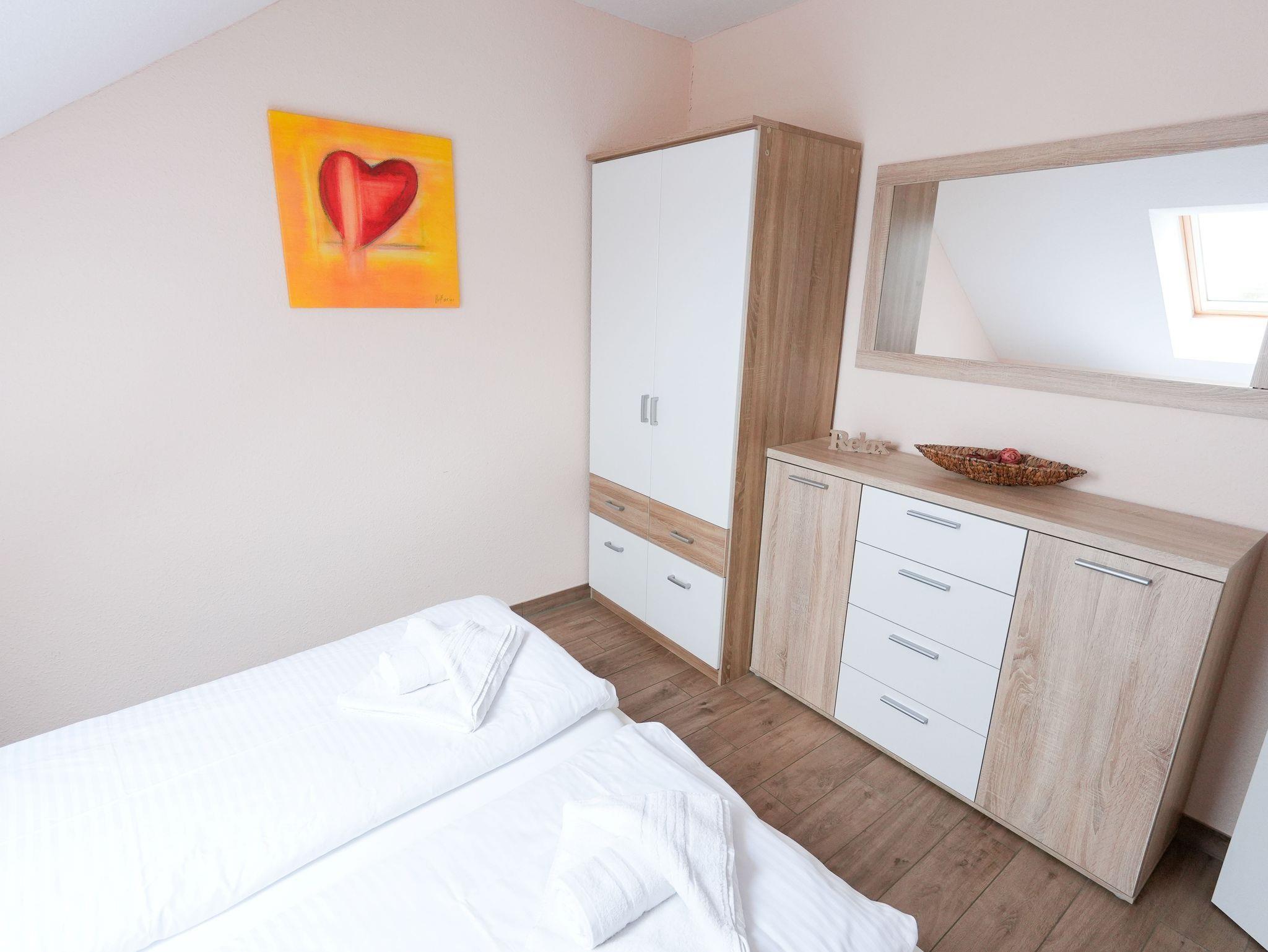 Exklusive neue Ferienwohnung für 2 - 4 Personen, schick und modern eingerichtet. Die Wohnung befindet sich im Dachgeschoss eines Hauses mit 6 Wohneinheiten. Die Größe der Ferienwohnung beträgt ca. 55 m². Die Ferienwohnung besteht aus einem großzügig gestalteten Wohnbereich mit offenem Küchenstudio. Es gibt ein Elternschlafzimmer mit einem Doppelbett sowie ein kleines Kinderzimmer mit Etagenbett. Das Bad mit ebenerdiger Dusche und das WC sind getrennt und verfügen jeweils über ein Waschbecken. Der Balkon ist nach Süden ausgerichtet. Ein eigener PKW-Stellplatz steht Ihnen ebenfalls zur Verfügung. Eine Hausordnung liegt in der Ferienwohnung aus. Sie ist Bestandteil des Mietvertrages. Bei Nichtbeachtung haftet der Mieter im Innenverhältnis zum Vermieter.