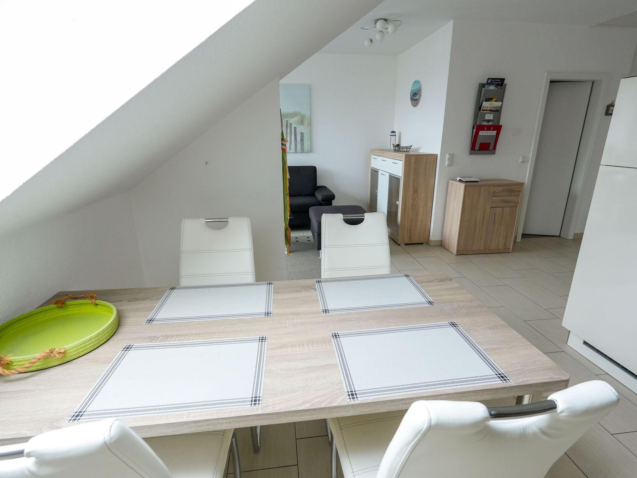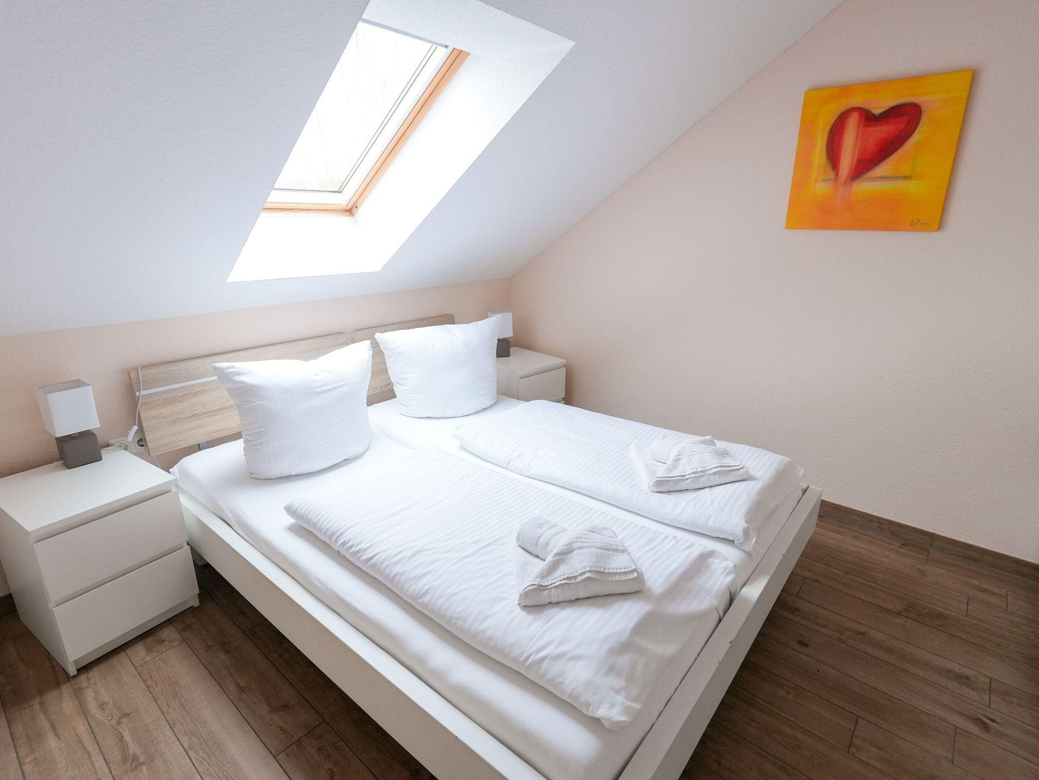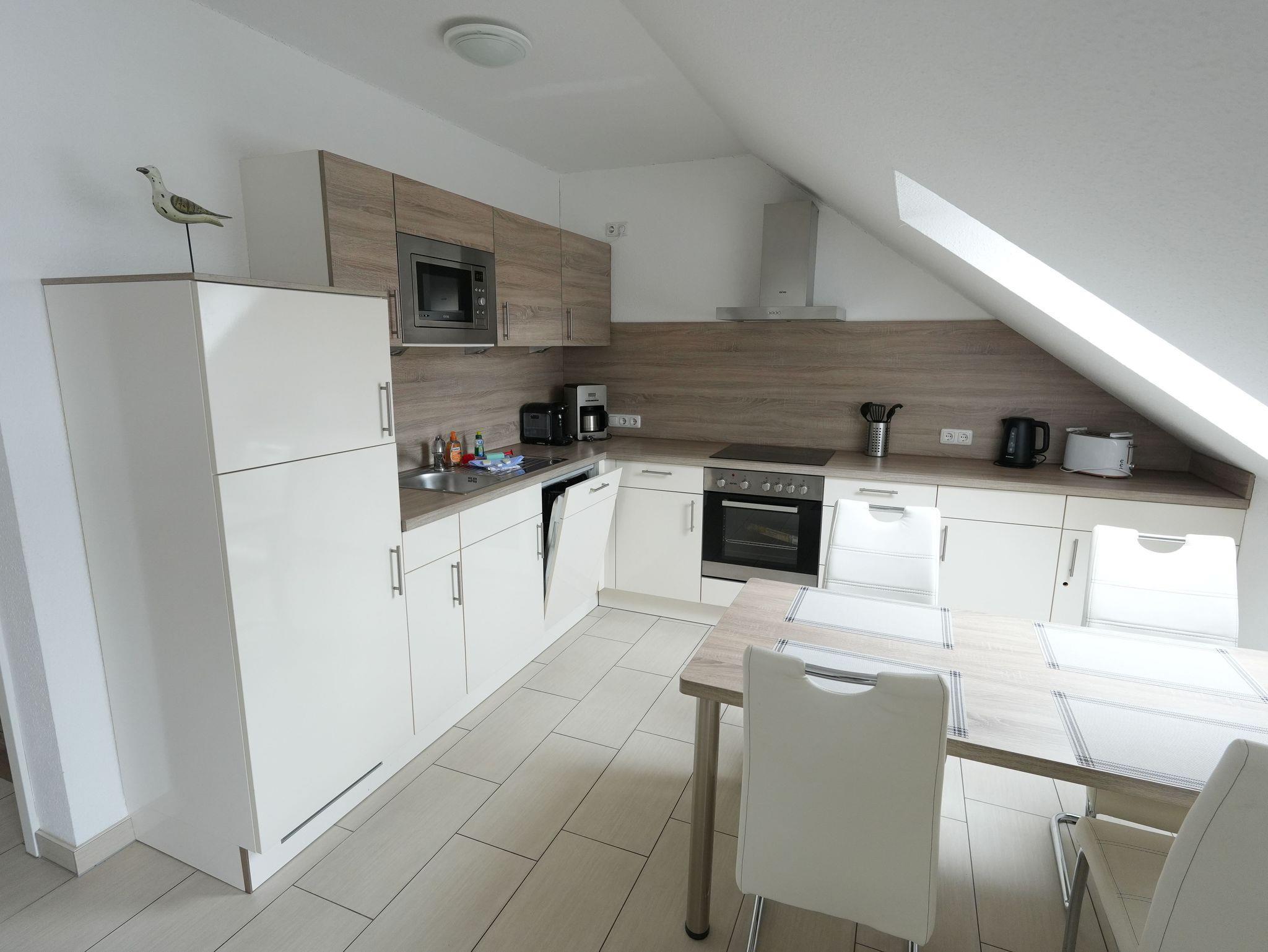 Exklusive neue Ferienwohnung für 2 - 4 Personen, schick und modern eingerichtet. Die Wohnung befindet sich im Dachgeschoss eines Hauses mit 6 Wohneinheiten. Die Größe der Ferienwohnung beträgt ca. 55 m². Die Ferienwohnung besteht aus einem großzügig gestalteten Wohnbereich mit offenem Küchenstudio. Es gibt ein Elternschlafzimmer mit einem Doppelbett sowie ein kleines Kinderzimmer mit Etagenbett. Das Bad mit ebenerdiger Dusche und das WC sind getrennt und verfügen jeweils über ein Waschbecken. Der Balkon ist nach Süden ausgerichtet. Ein eigener PKW-Stellplatz steht Ihnen ebenfalls zur Verfügung.