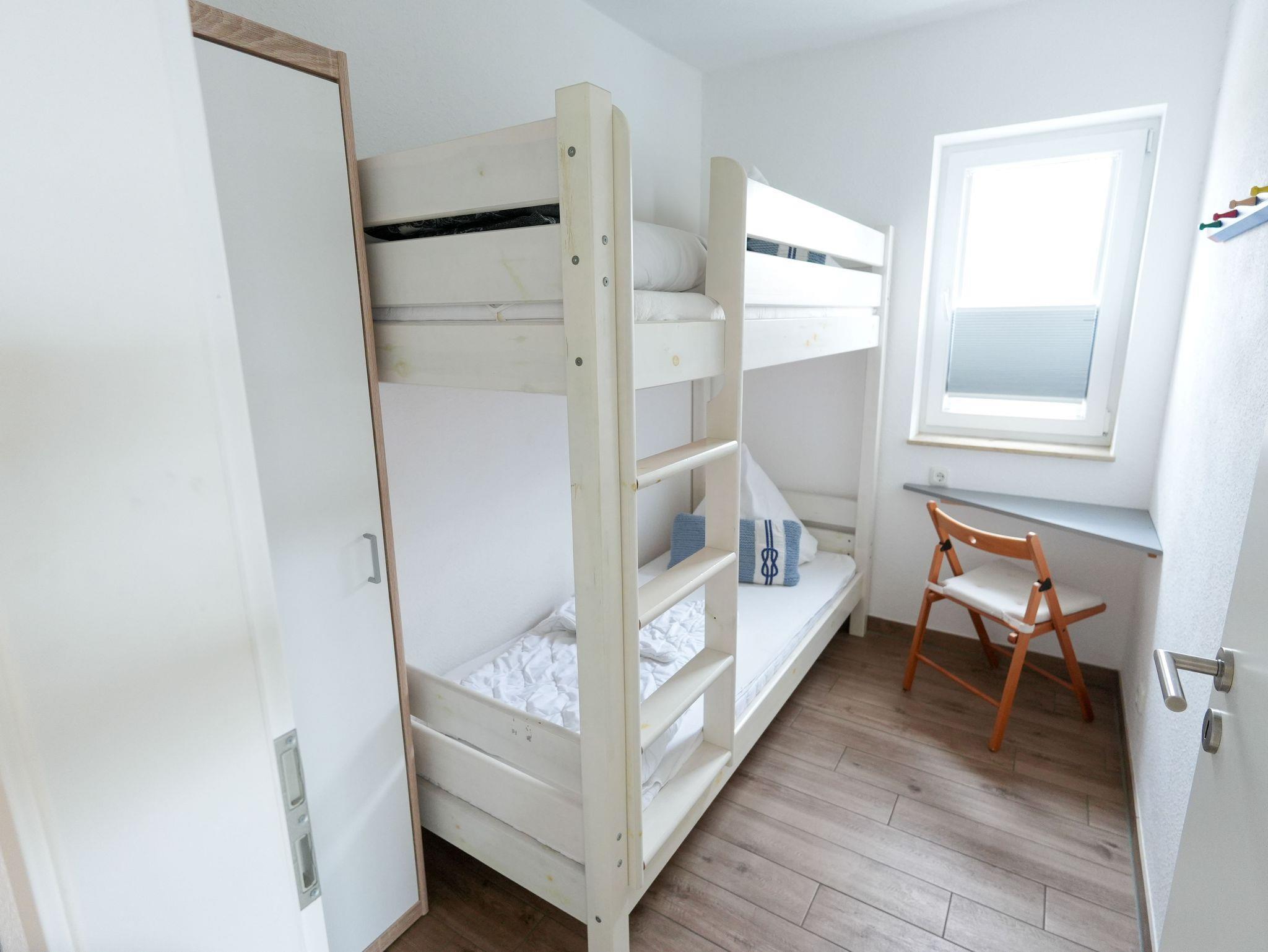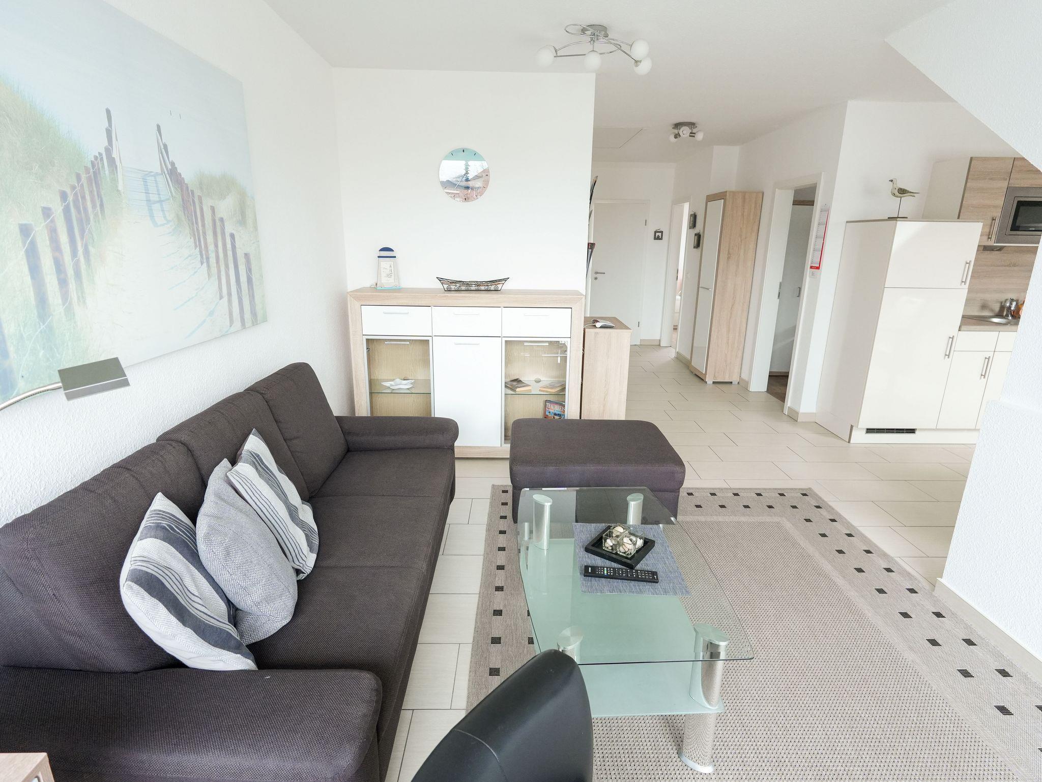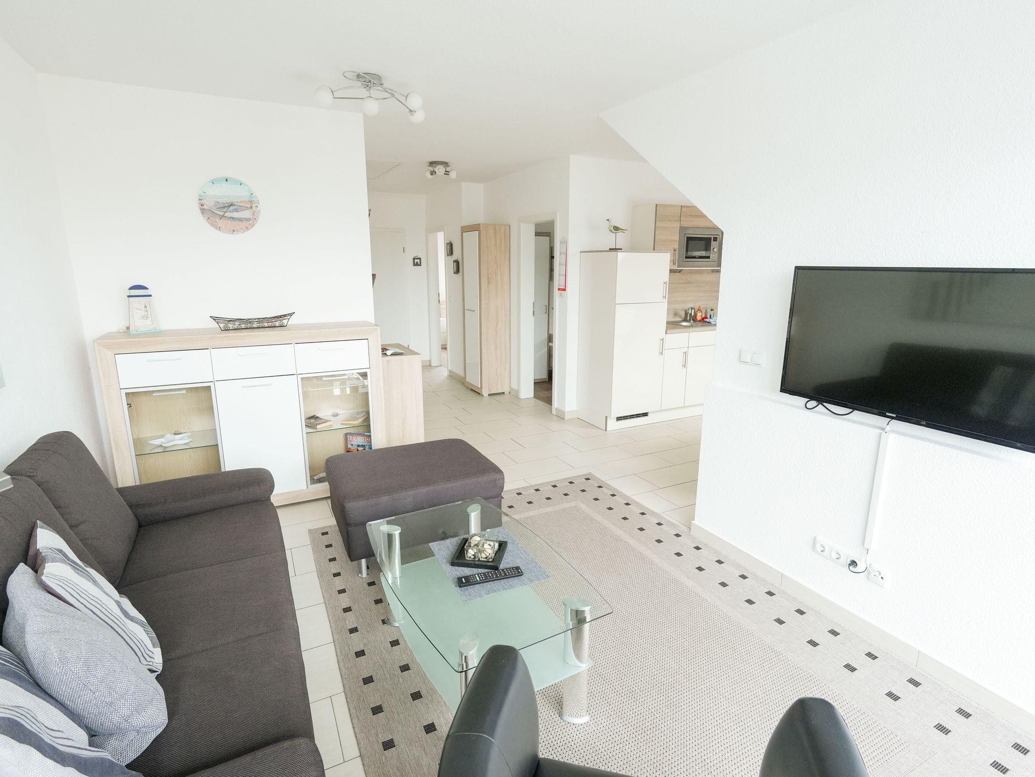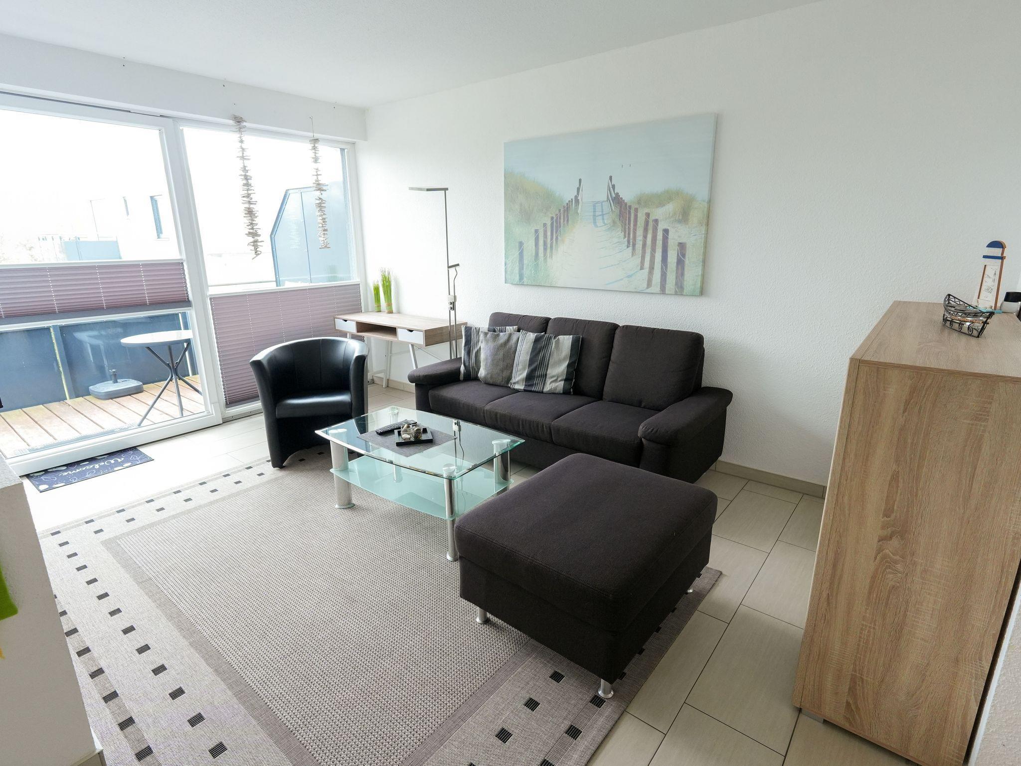 Exklusive neue Ferienwohnung für 2 - 4 Personen, schick und modern eingerichtet. Die Wohnung befindet sich im Dachgeschoss eines Hauses mit 6 Wohneinheiten. Die Größe der Ferienwohnung beträgt ca. 55 m². Die Ferienwohnung besteht aus einem großzügig gestalteten Wohnbereich mit offenem Küchenstudio. Es gibt ein Elternschlafzimmer mit einem Doppelbett sowie ein kleines Kinderzimmer mit Etagenbett. Das Bad mit ebenerdiger Dusche und das WC sind getrennt und verfügen jeweils über ein Waschbecken. Der Balkon ist nach Süden ausgerichtet. Ein eigener PKW-Stellplatz steht Ihnen ebenfalls zur Verfügung.