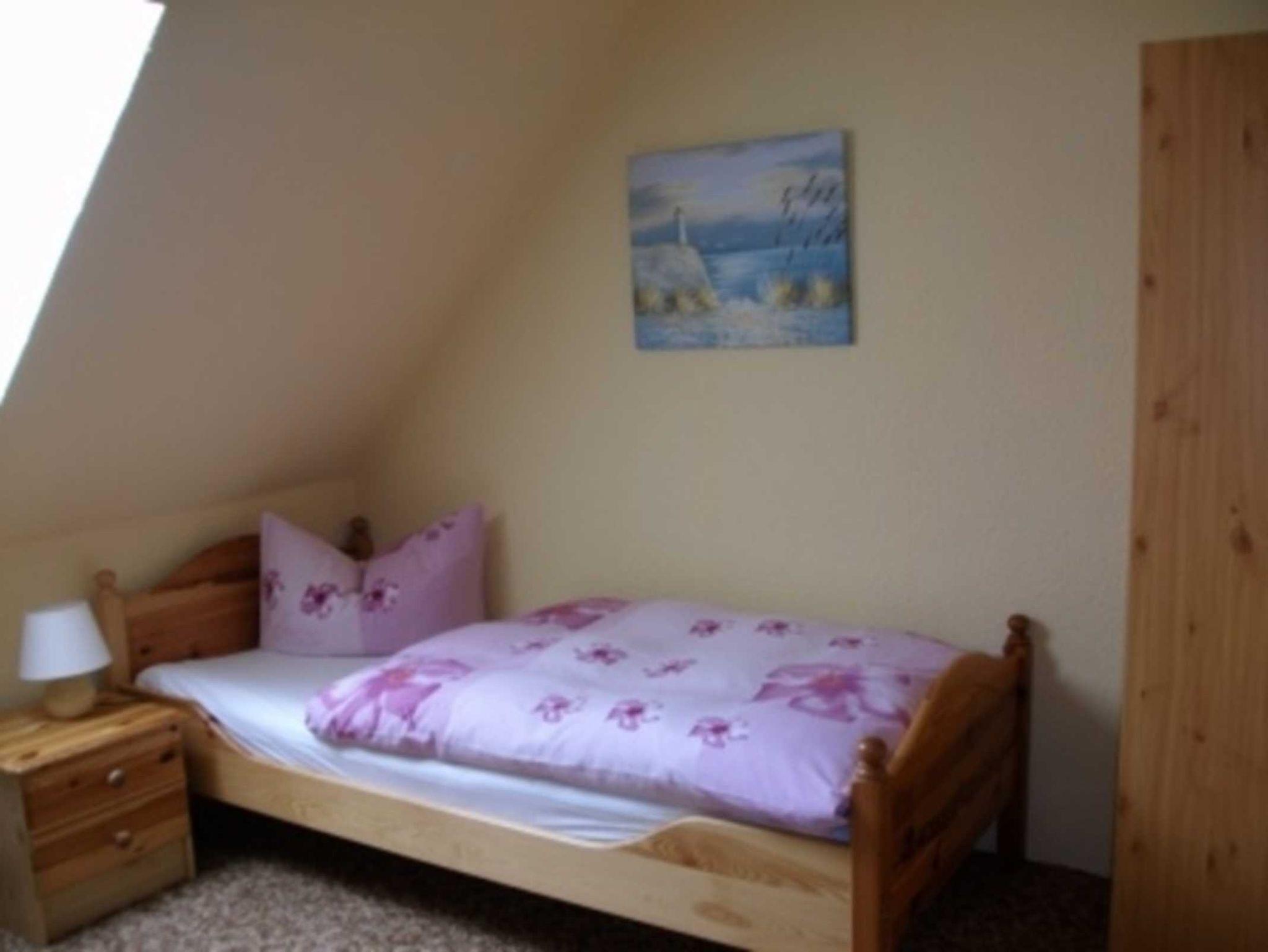 Die Drei-Raum Ferienwohnung erstreckt sich über zwei Etagen und bietet Platz für bis zu vier Personen. Im Erdgeschoss befindet sich ein großer Wohnraum mit offener Küche und das Bad (mit Dusche und WC). Ins Dachgeschoss, in dem sich die zwei Schlafräume befinden, gelangen Sie über eine Wendeltreppe.