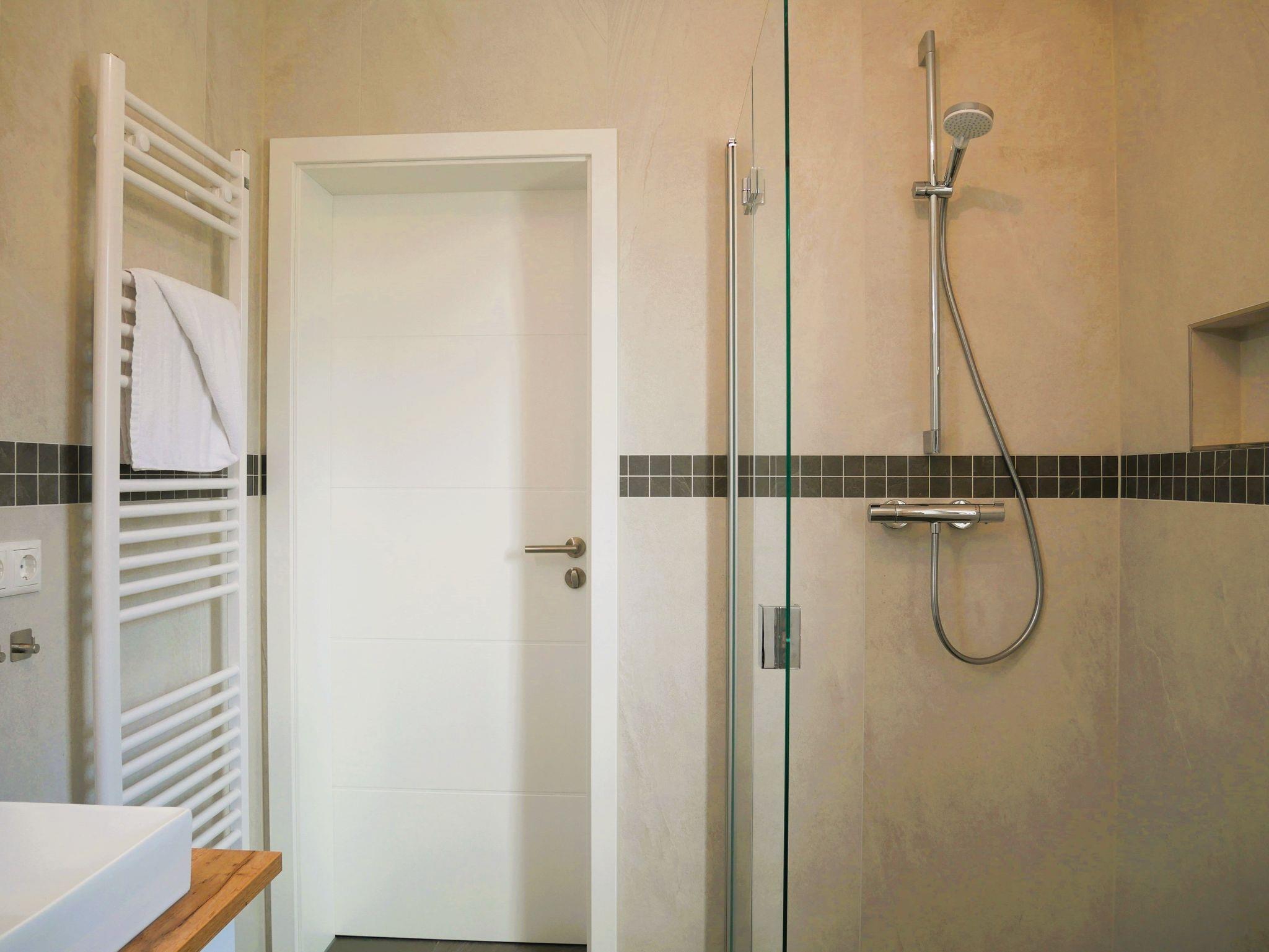 Das helle Tageslichtbad ist mit zwei Waschbecken, einem WC sowie einer ebenerdigen Dusche ausgestattet und verfügt über ein Fenster zur natürlichen Belüftung.